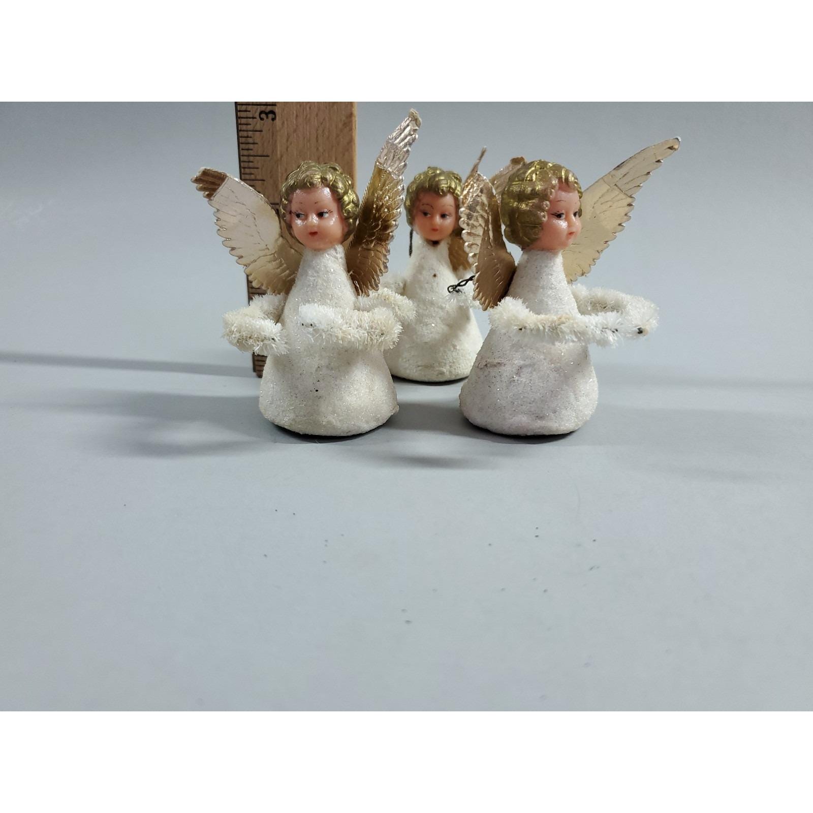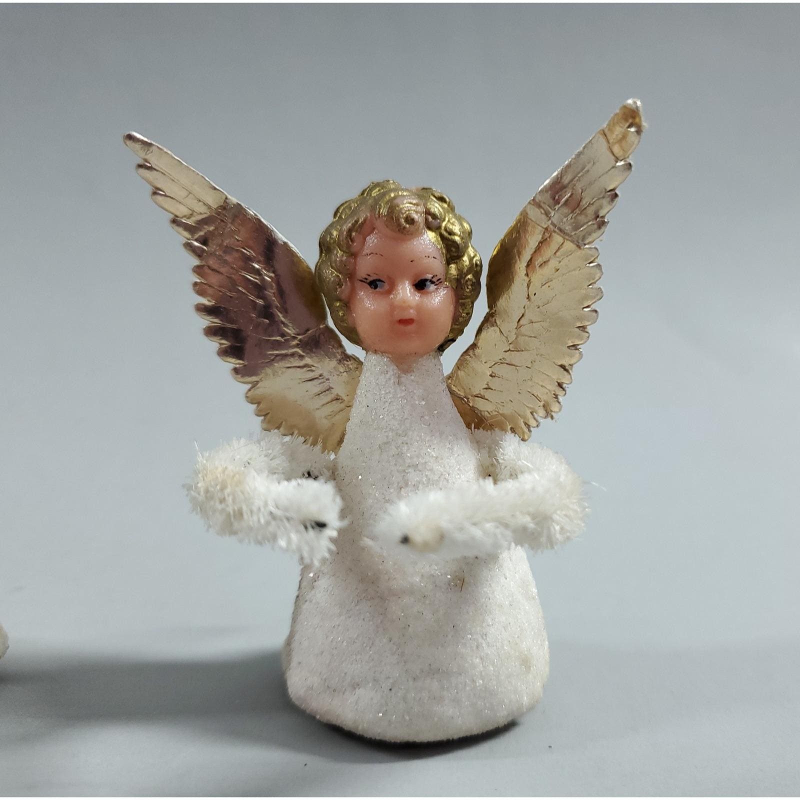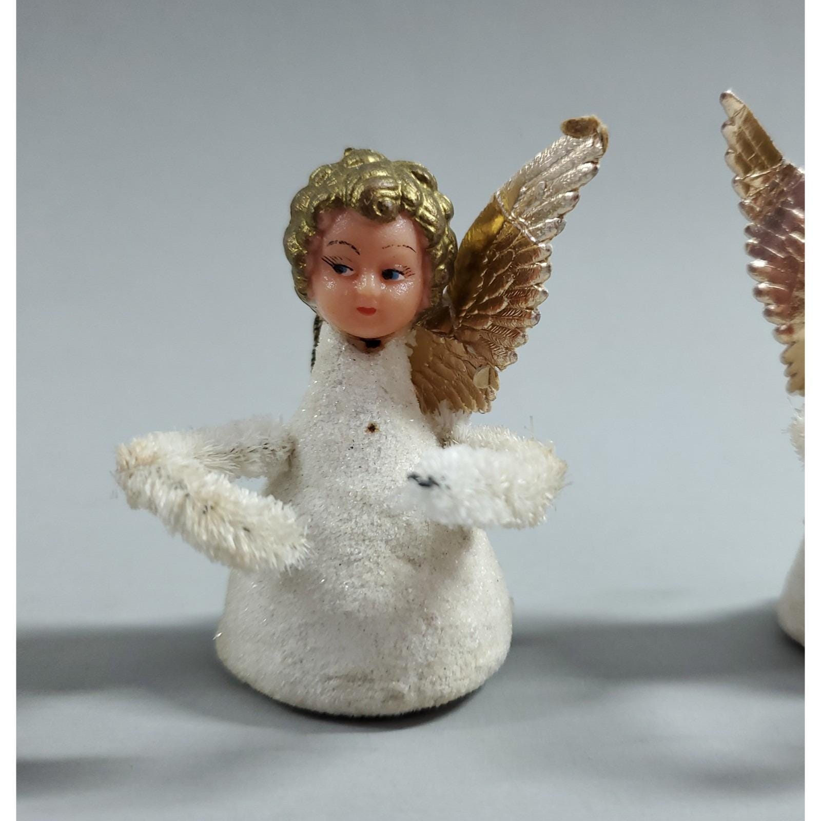 3 Vintage MCM Angel Putz Style Plastic Face Chenille Christmas Ornaments White
