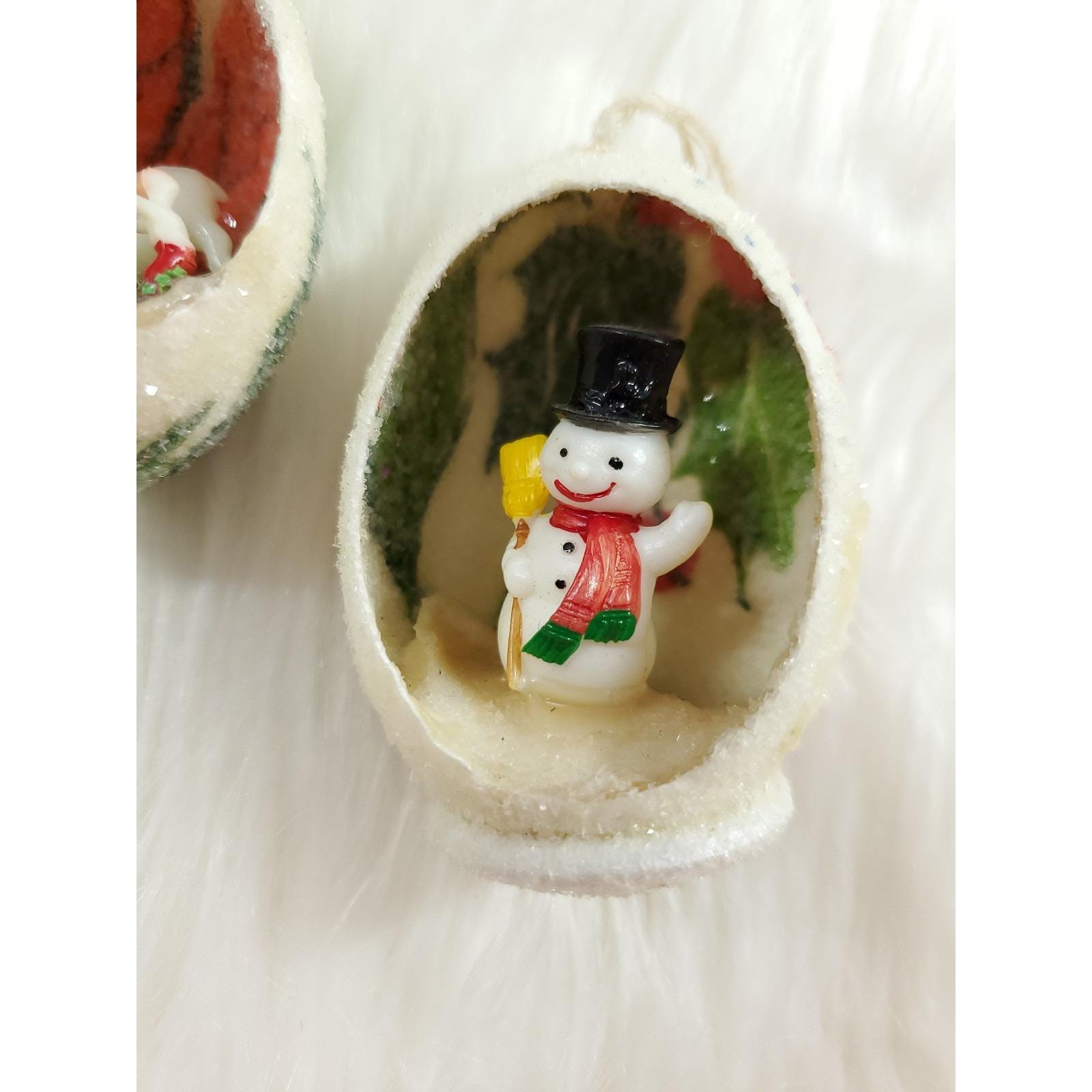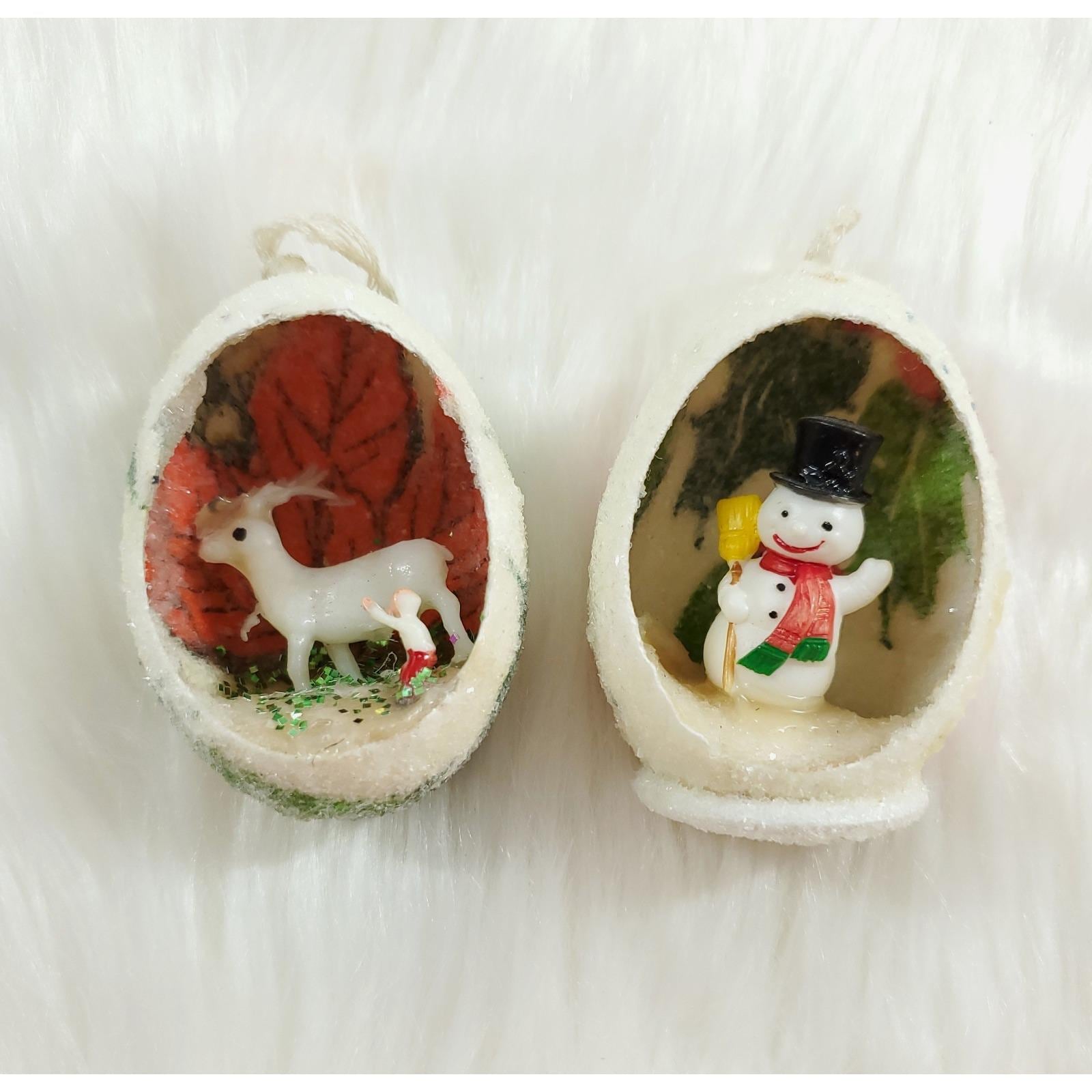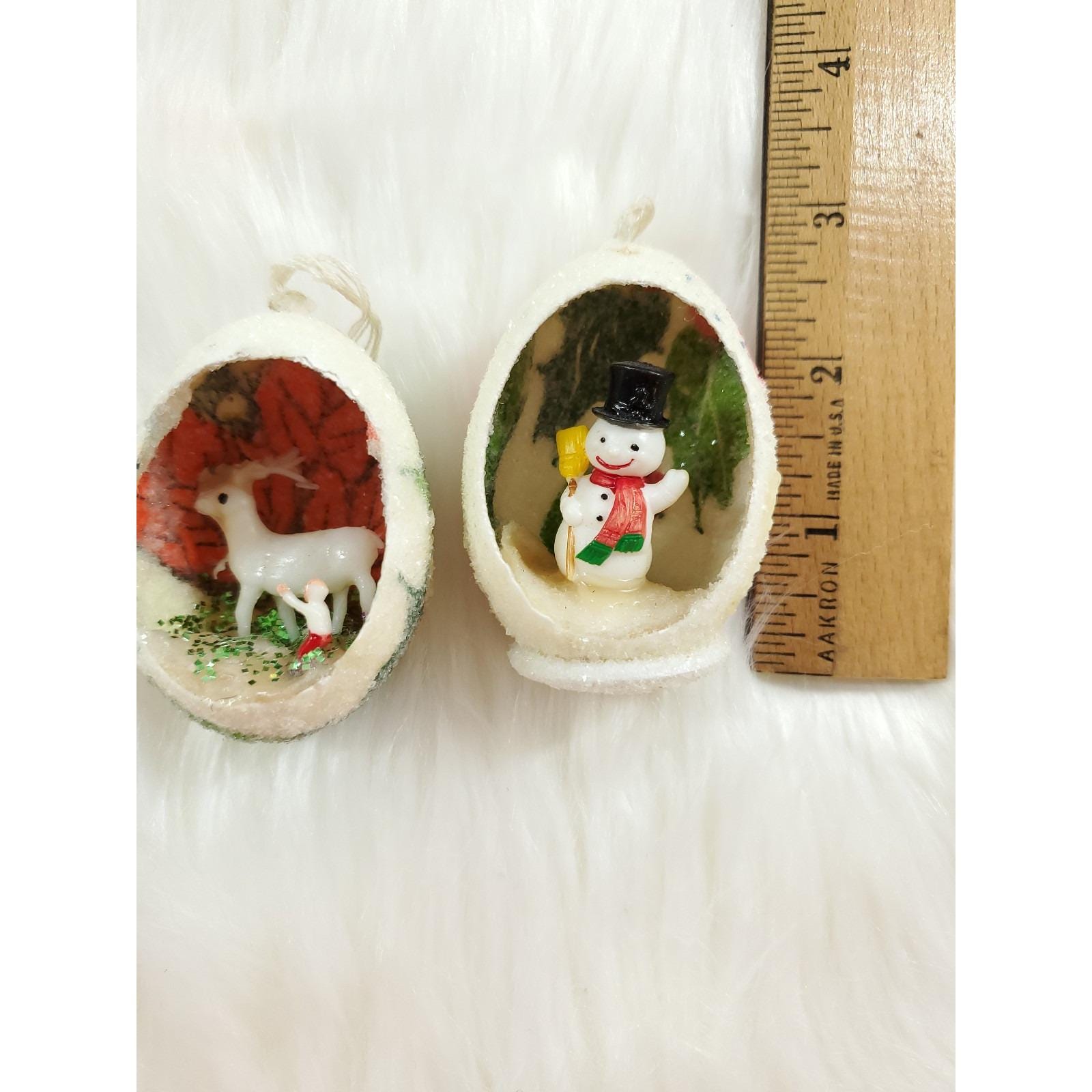 2 Vintage Snowman Reindeer Real Eggshell Diorama Egg Christmas Ornaments
