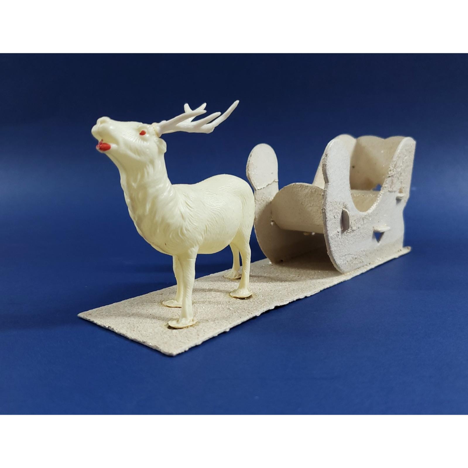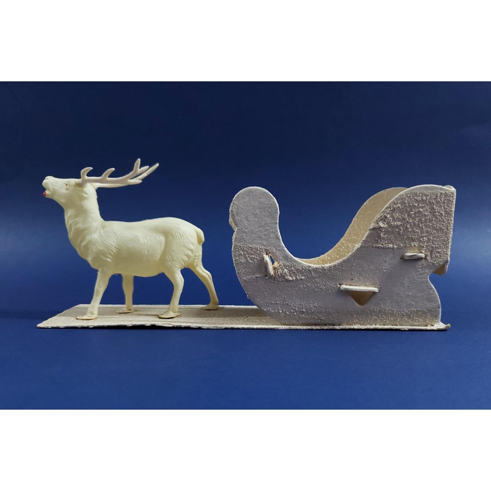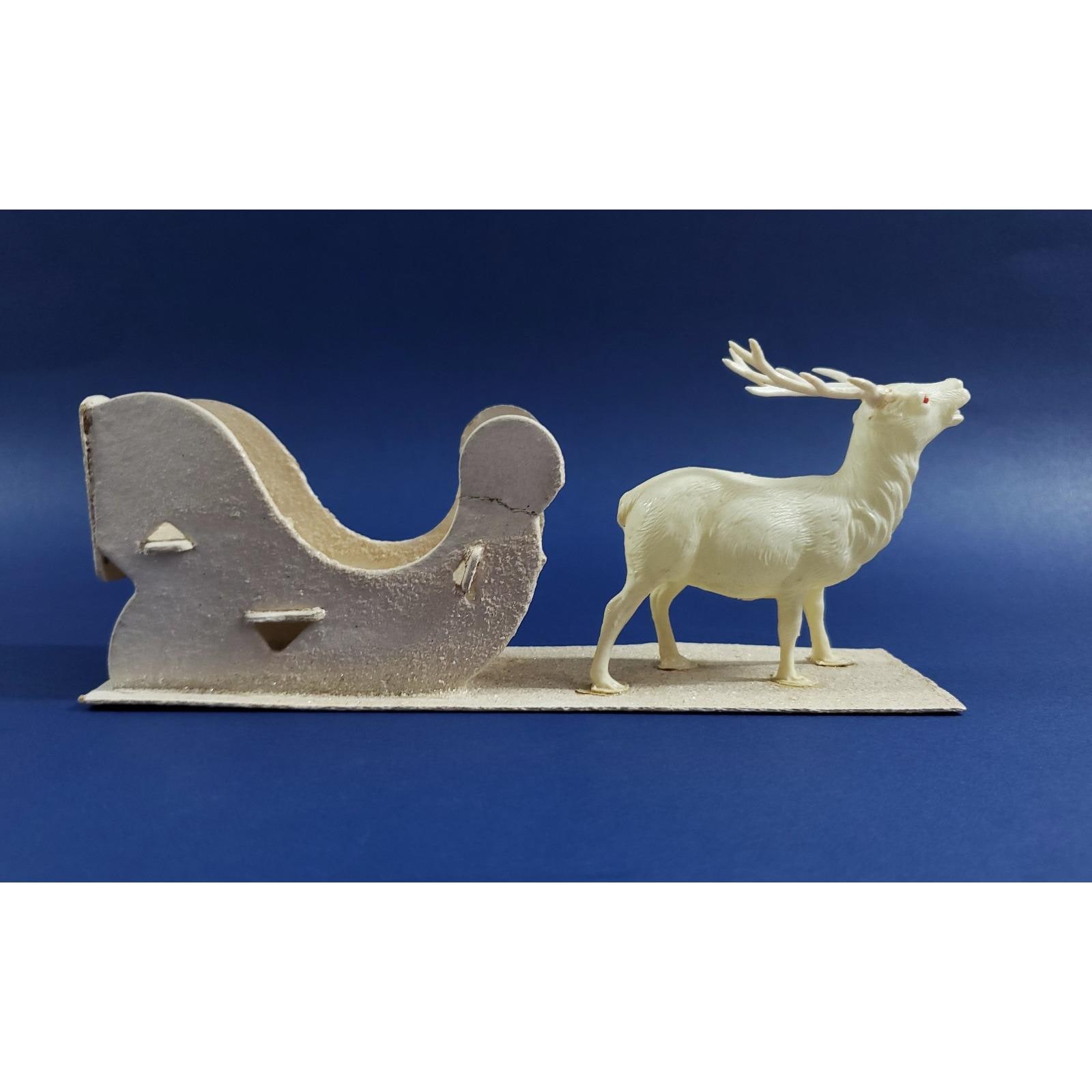 This magical putz mica cardboard sleigh is led by a celluloid reindeer. Overall good condition, the front right tip of the sleigh has been glued as shown. Please see all photos close-up for exact details.