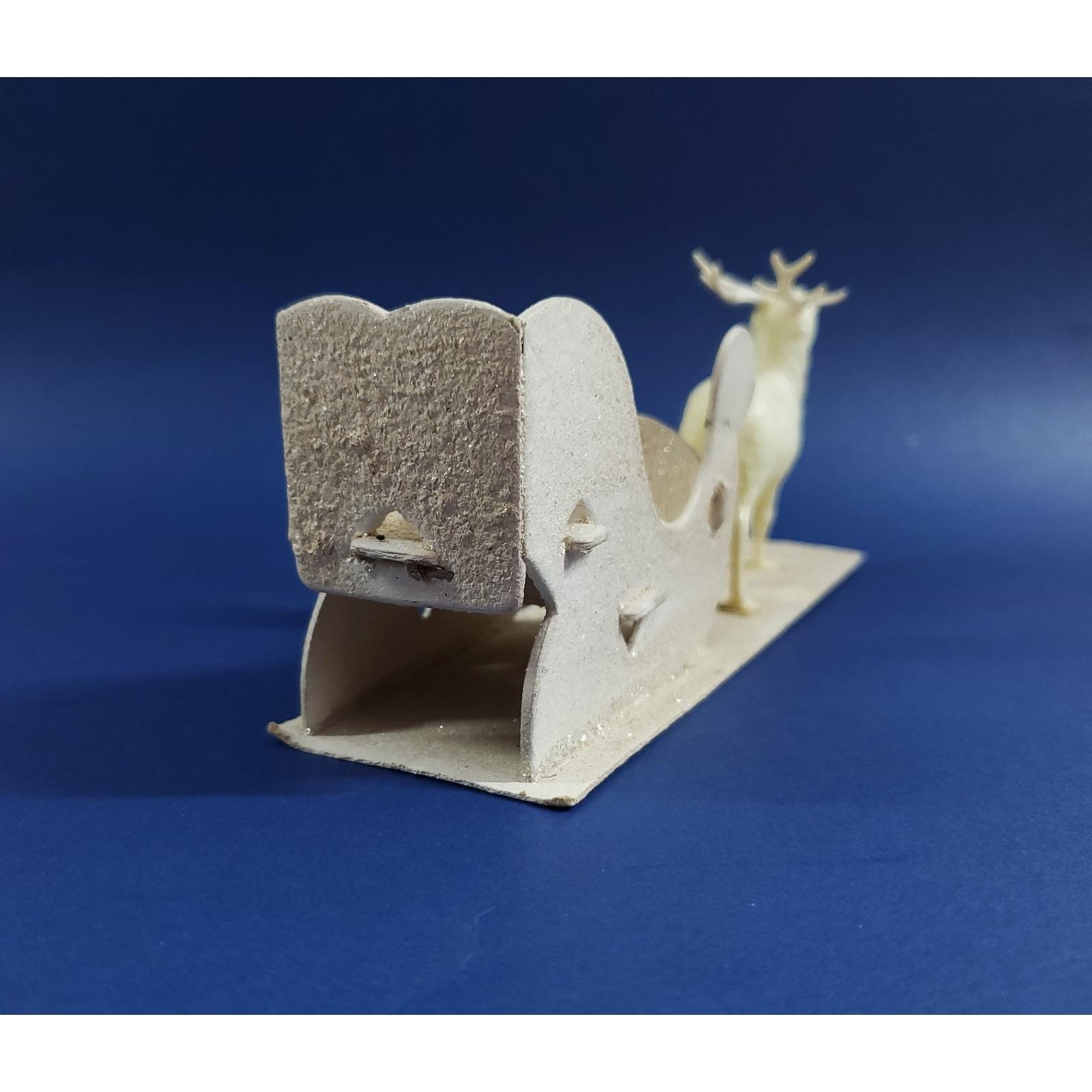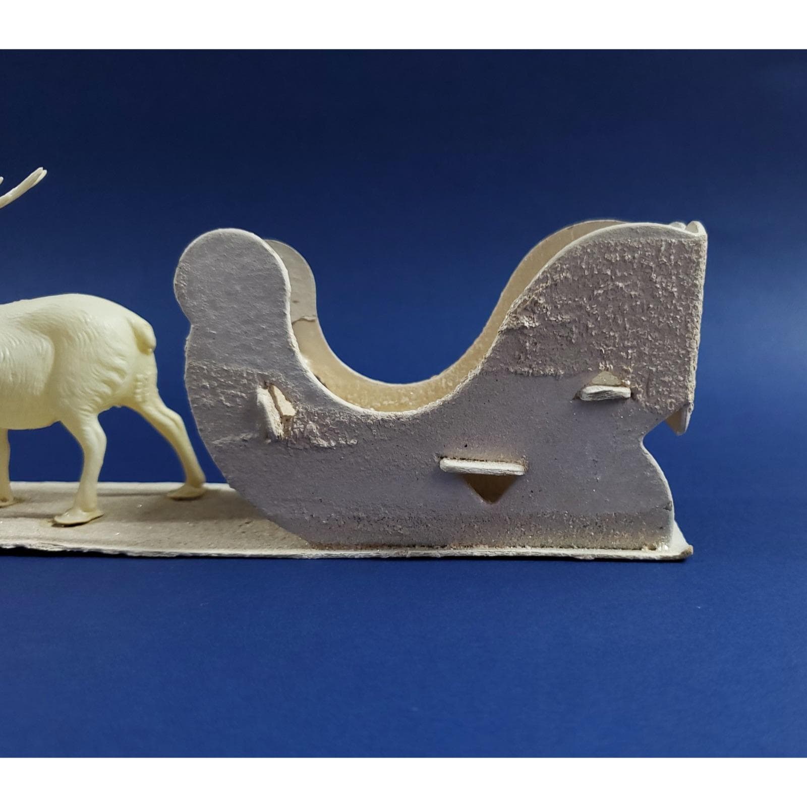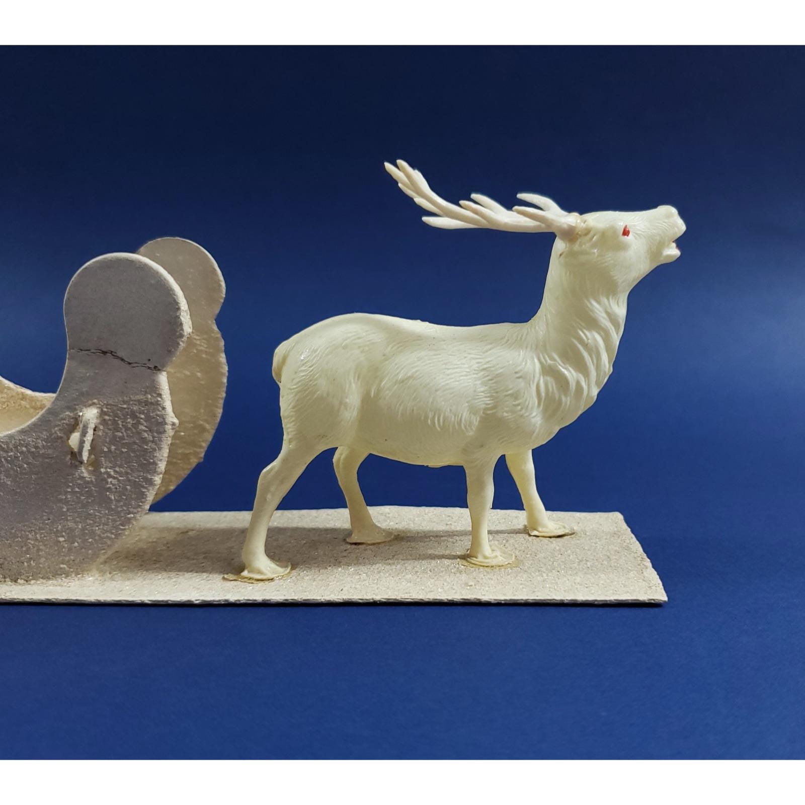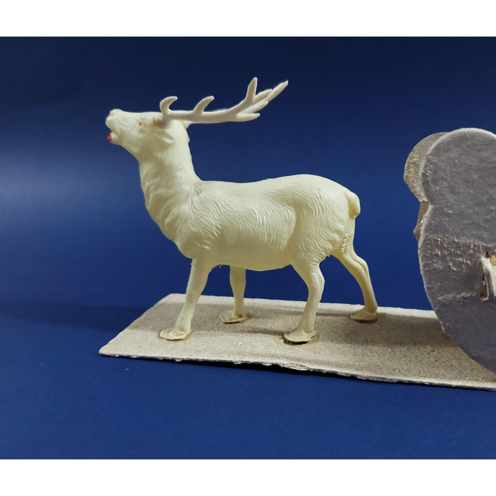 This magical putz mica cardboard sleigh is led by a celluloid reindeer. Overall good condition, the front right tip of the sleigh has been glued as shown. Please see all photos close-up for exact details.