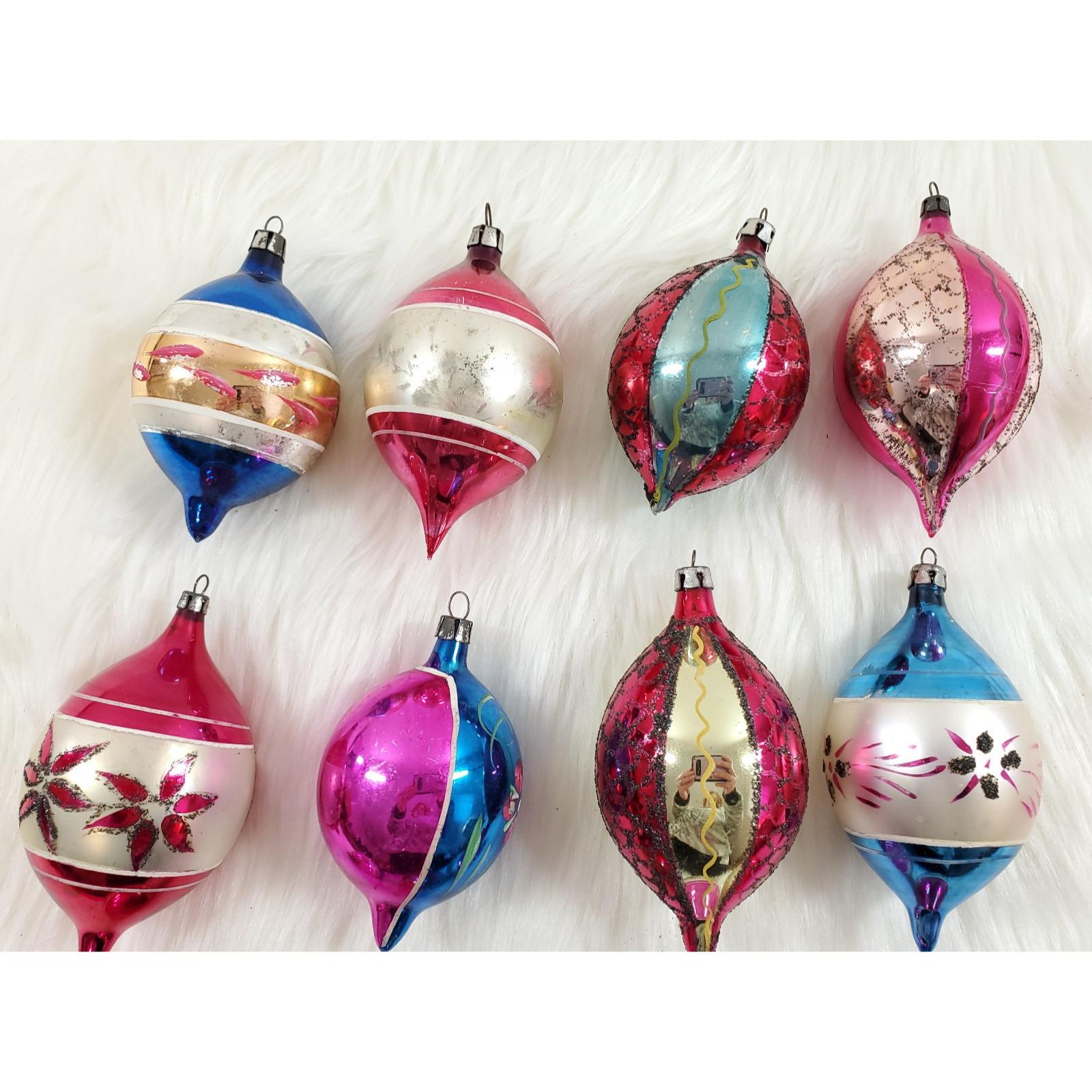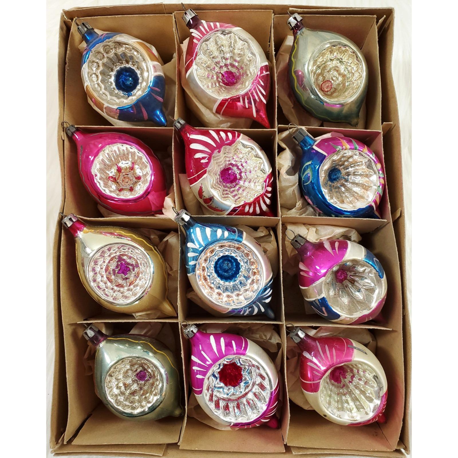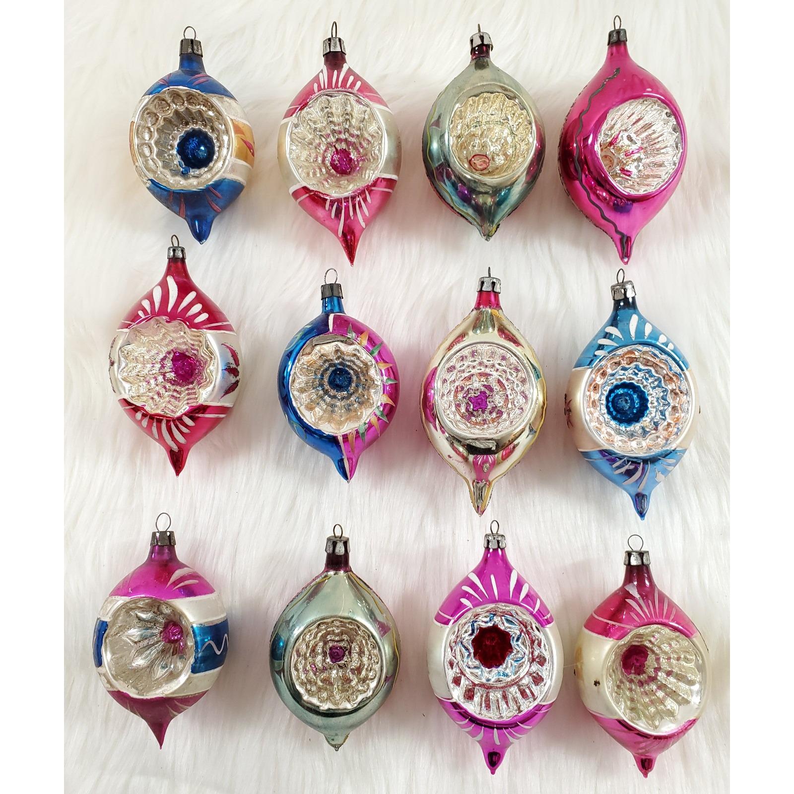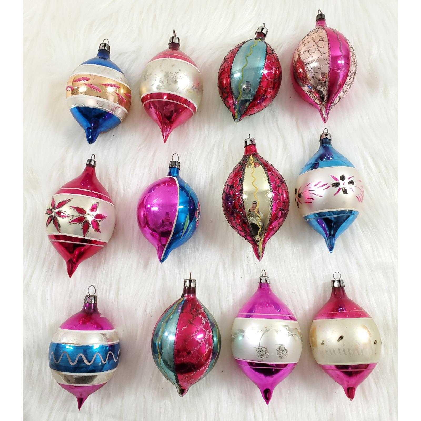 12 Vintage 4" Jumbo Indent Poland Mica Teardrop Blown Glass Christmas Ornaments