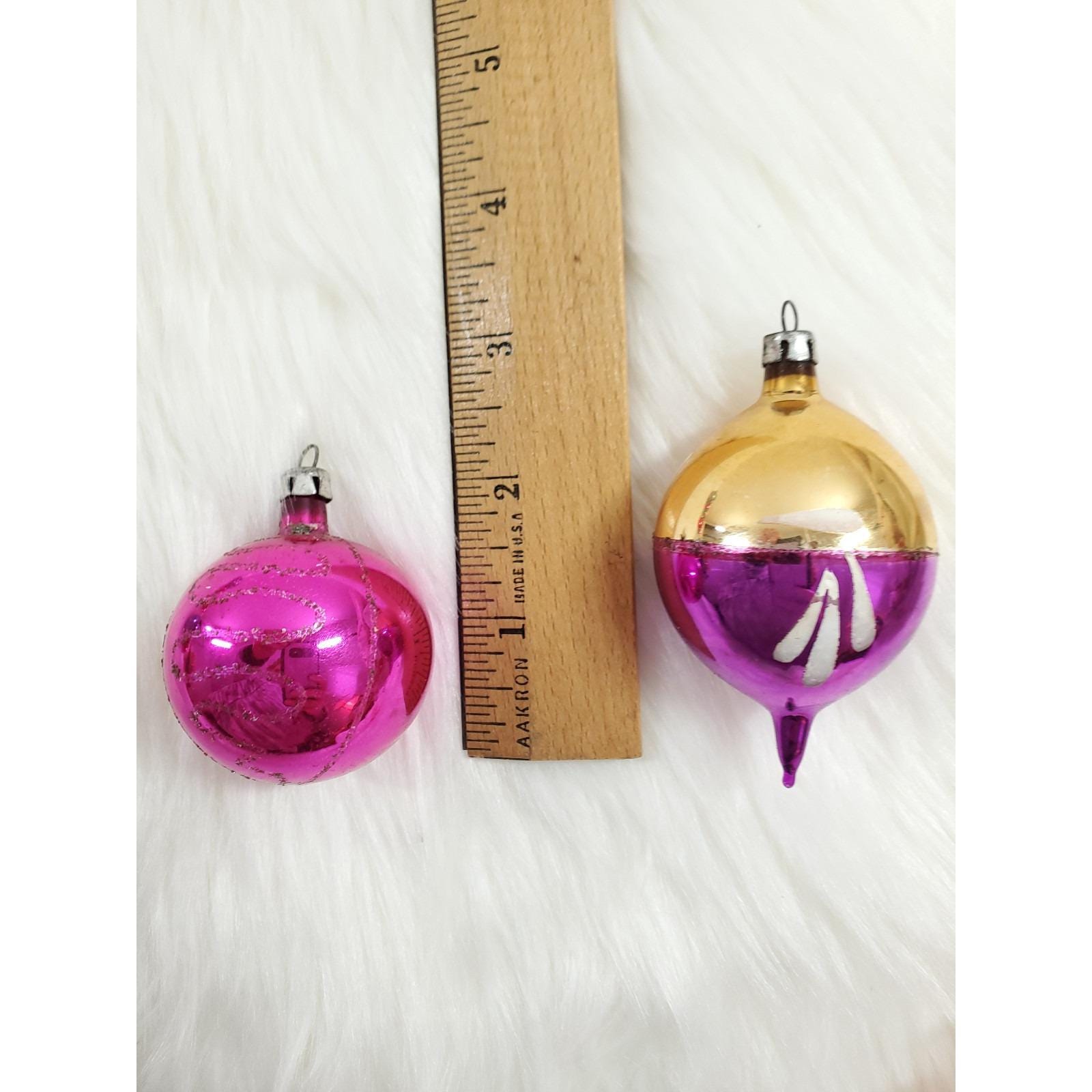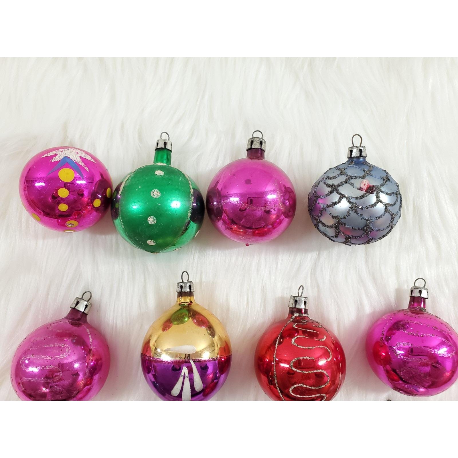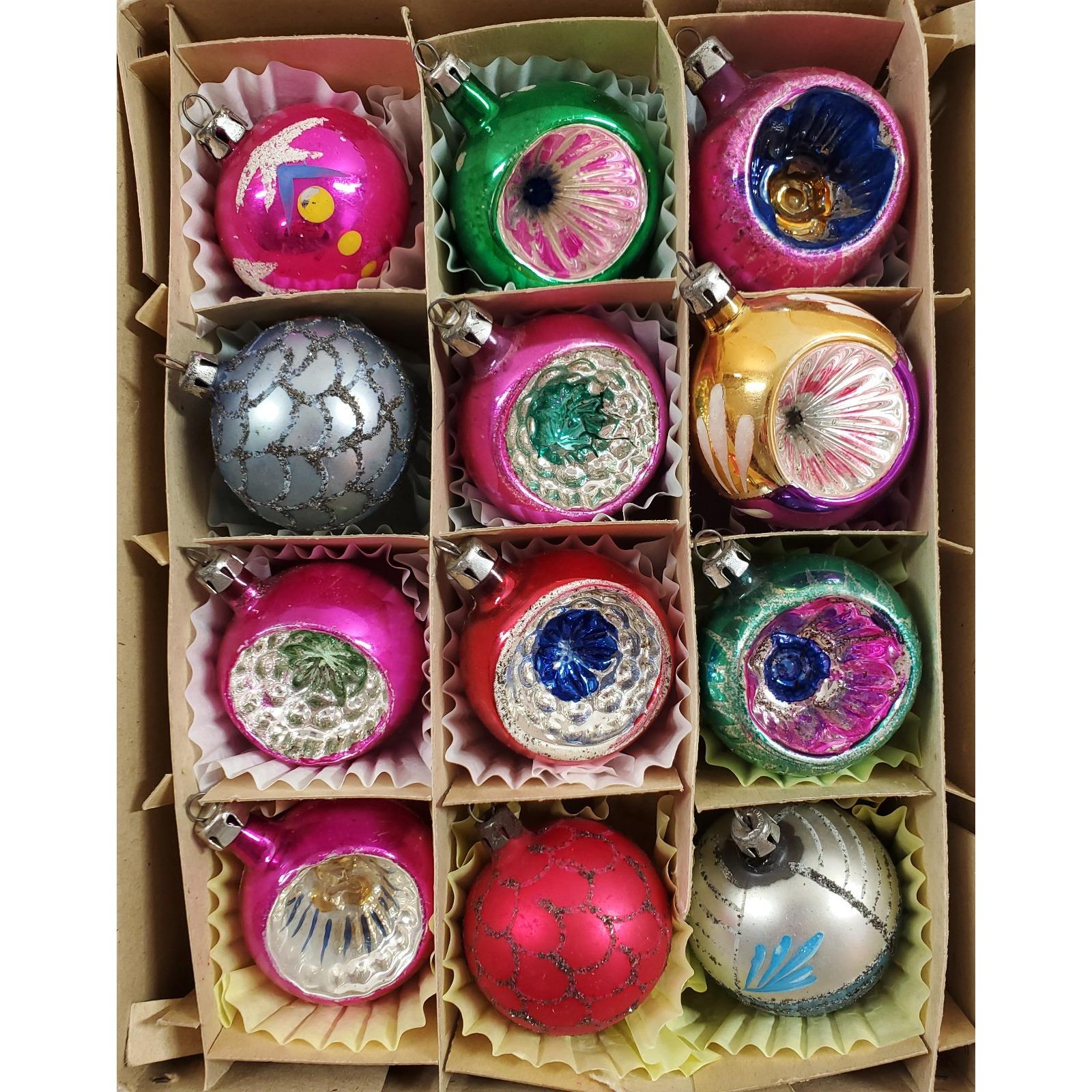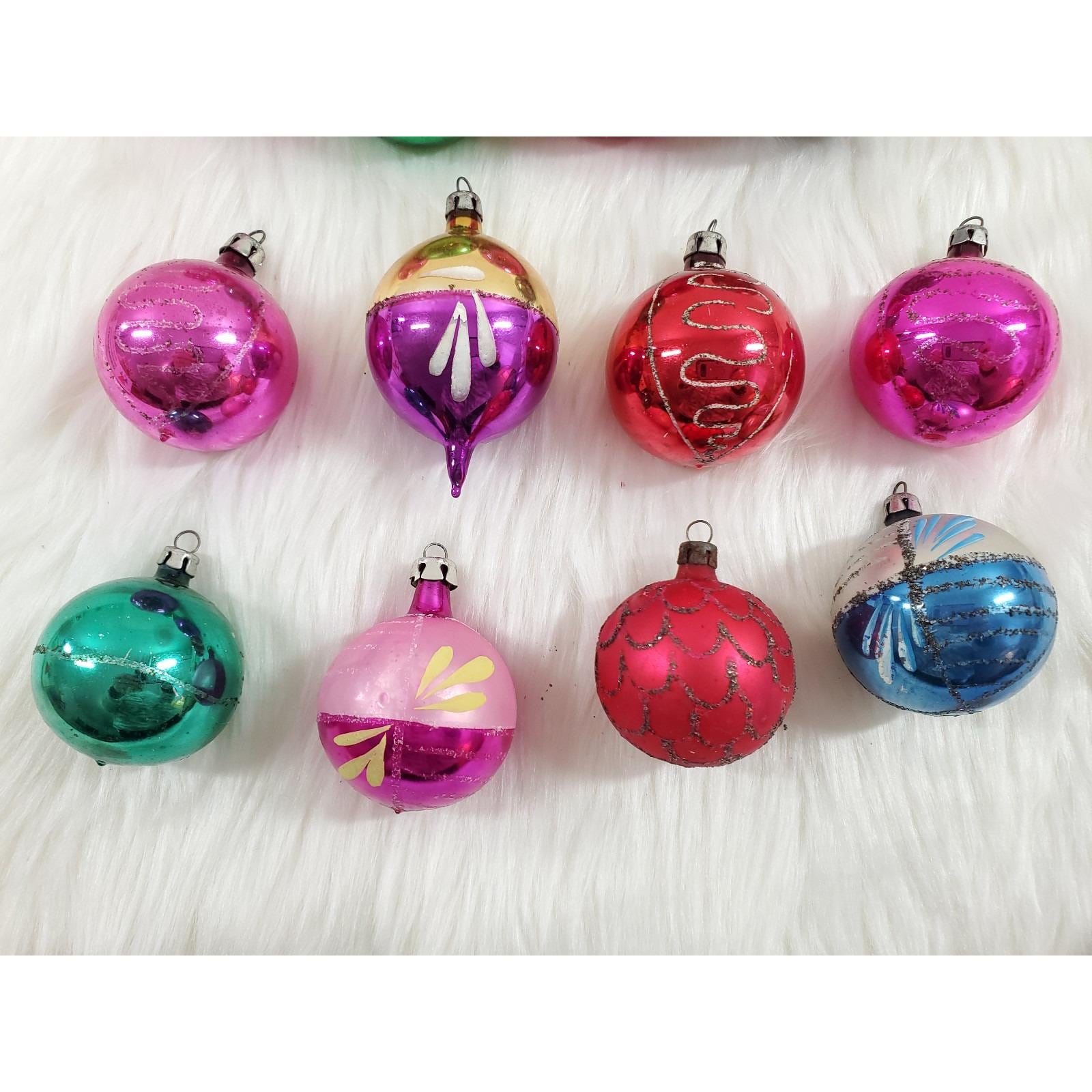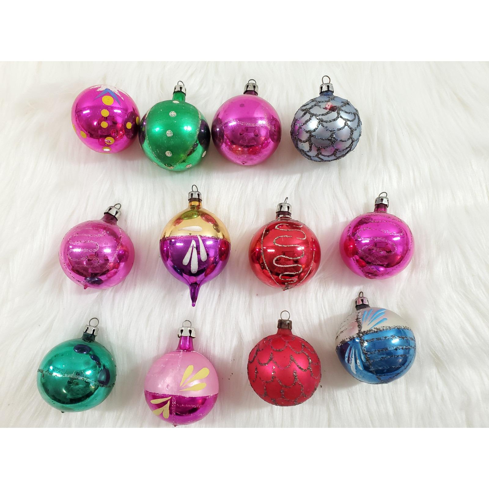 The set of twelve include a beautiful assortment of hand blown and painted teardrop, indent, and round ornaments. Overall in good condition with minor paint/mica loss from age. Blue/silver ball has a small chip by the topper as shown. Please see all photos for exact condition.