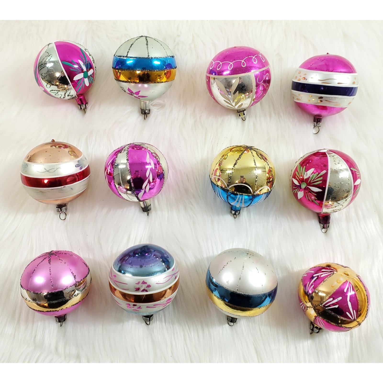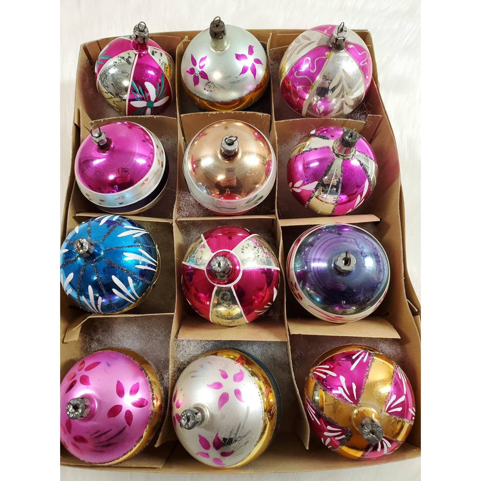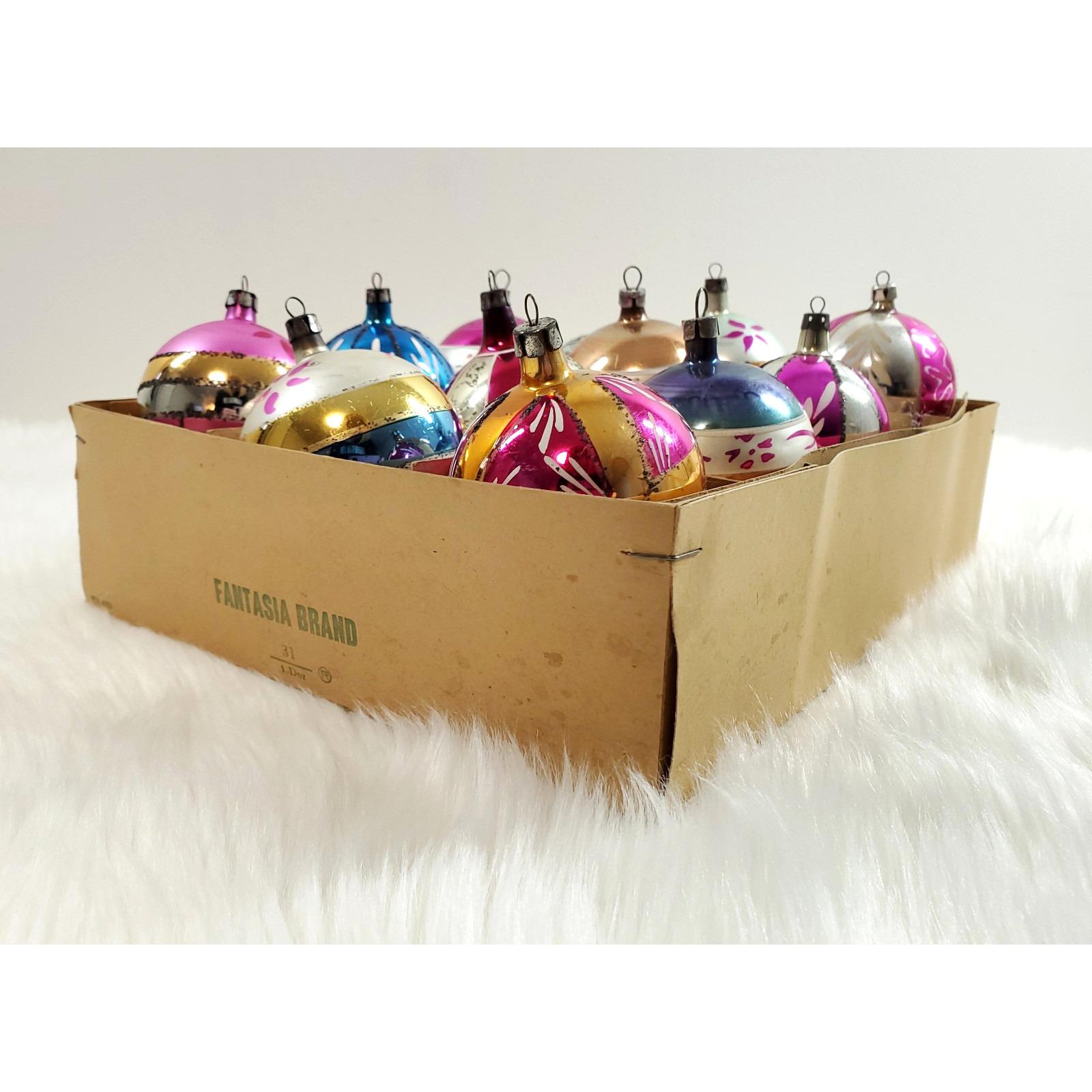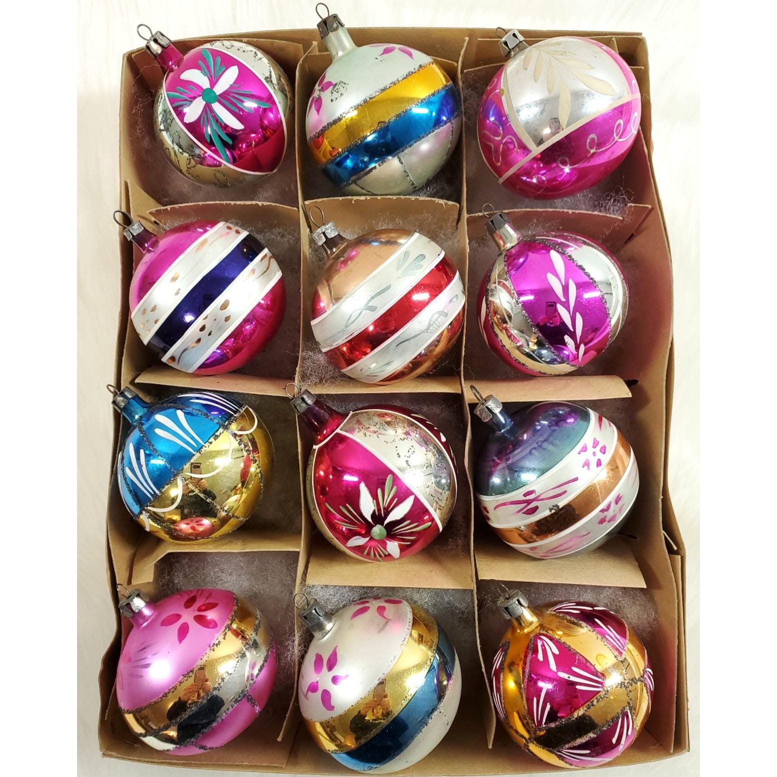 The set of twelve include a beautiful assortment of hand blown and painted ornaments. Overall in good condition with paint/mica loss from age. Please see all photos for exact condition. Box does not have a lid.