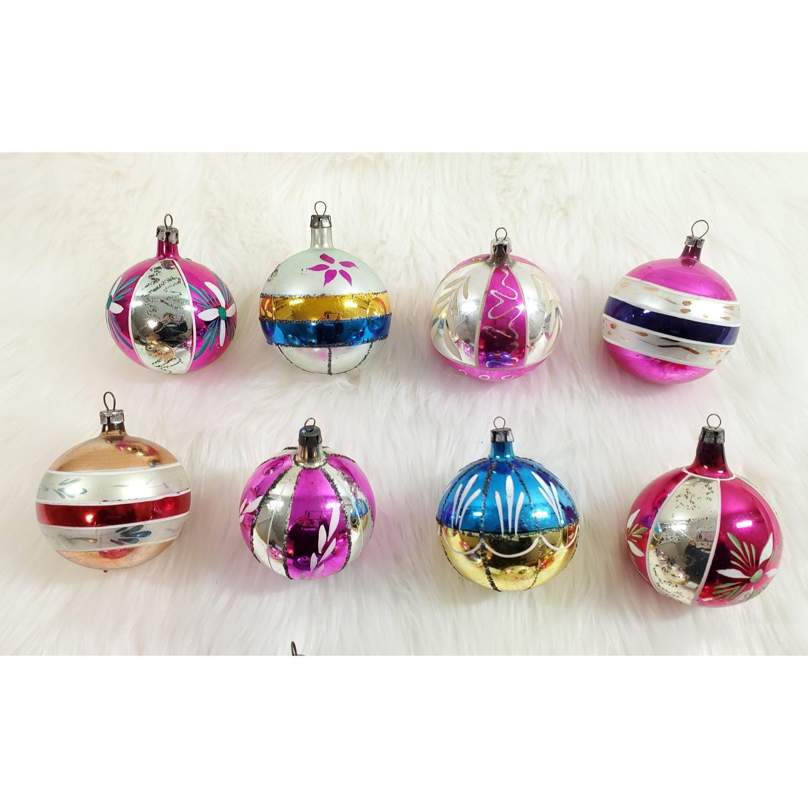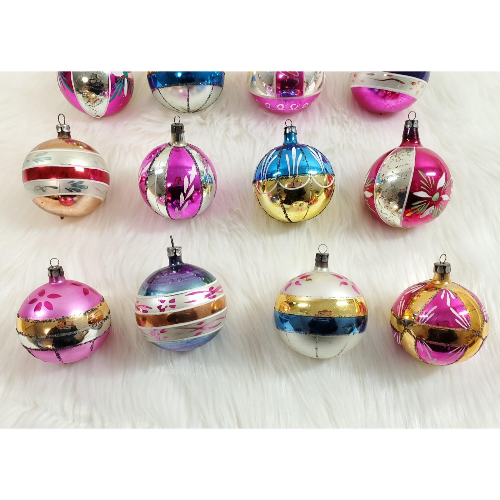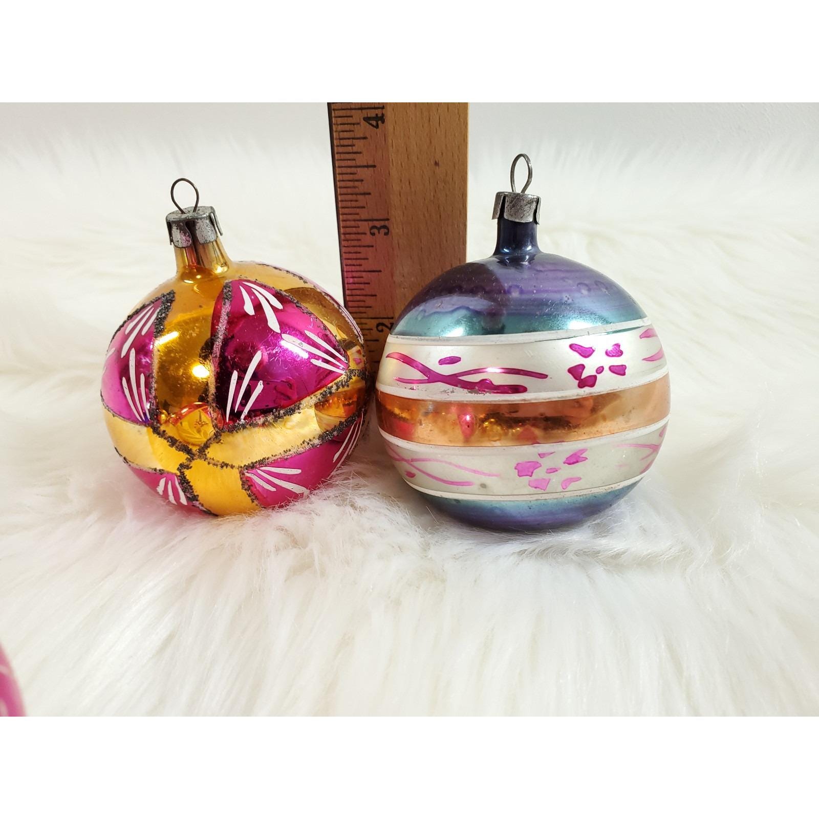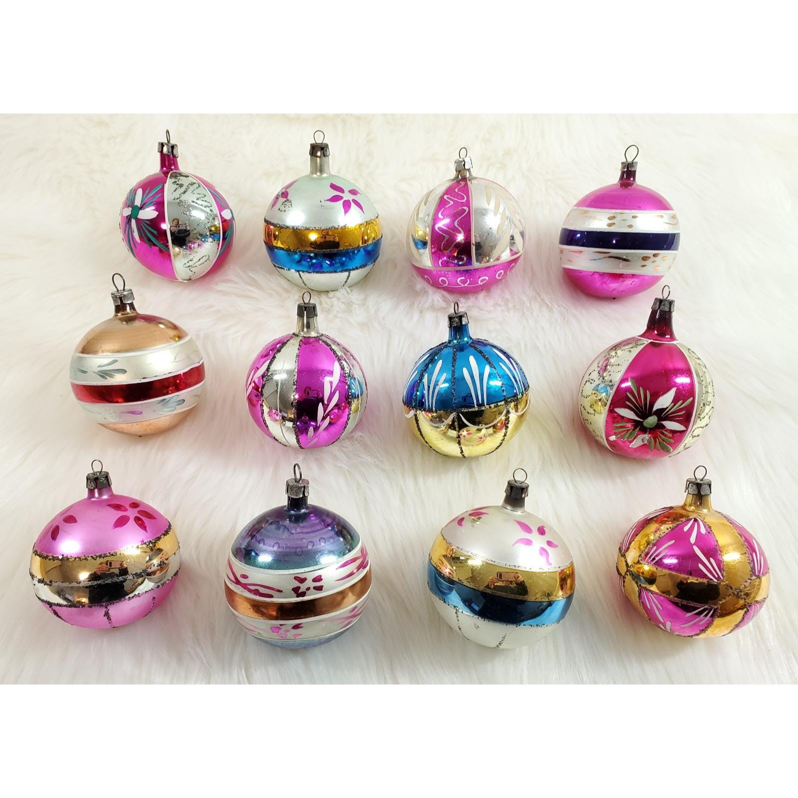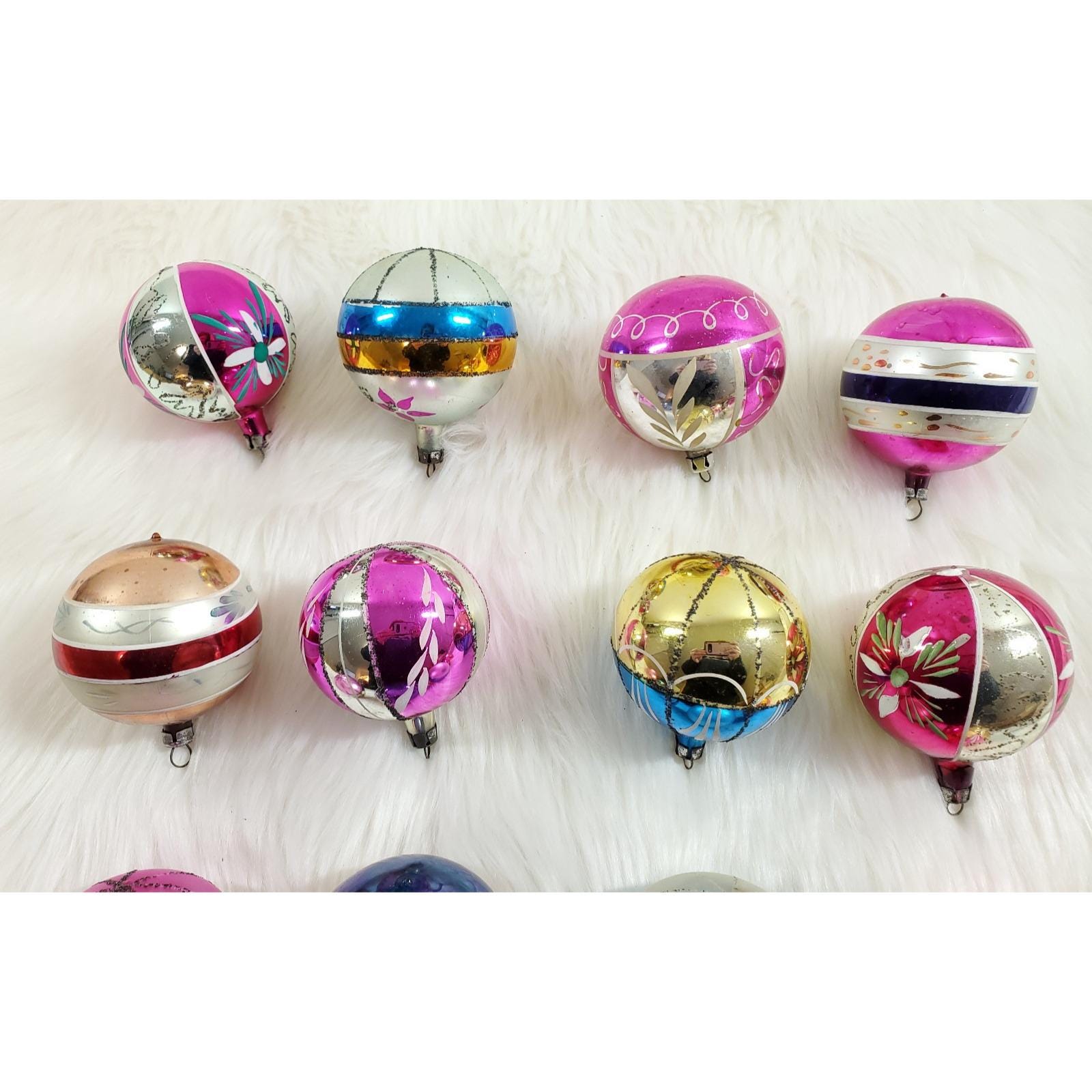 The set of twelve include a beautiful assortment of hand blown and painted ornaments. Overall in good condition with paint/mica loss from age. Please see all photos for exact condition. Box does not have a lid.