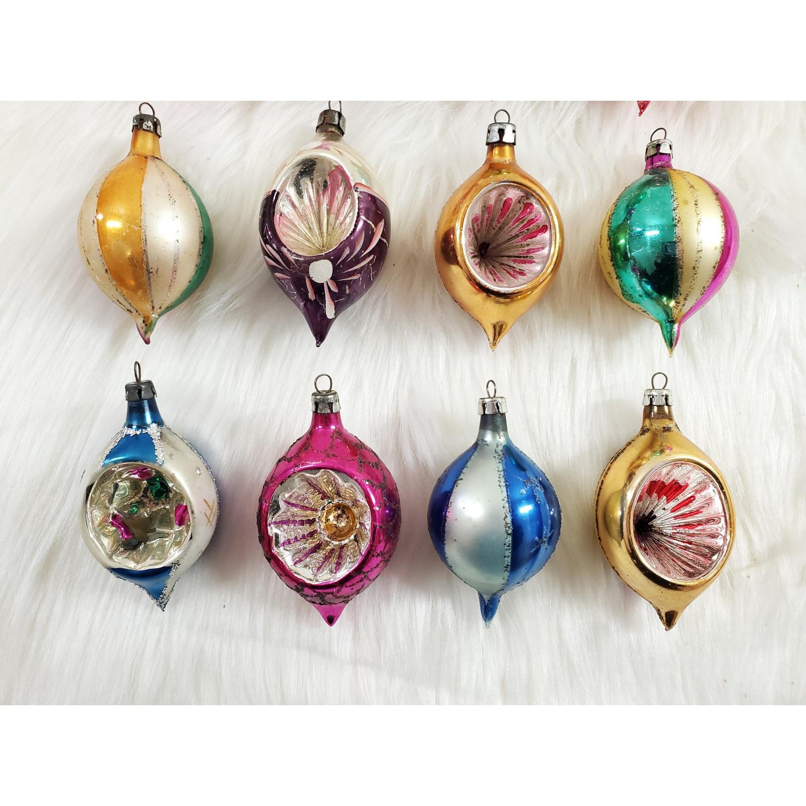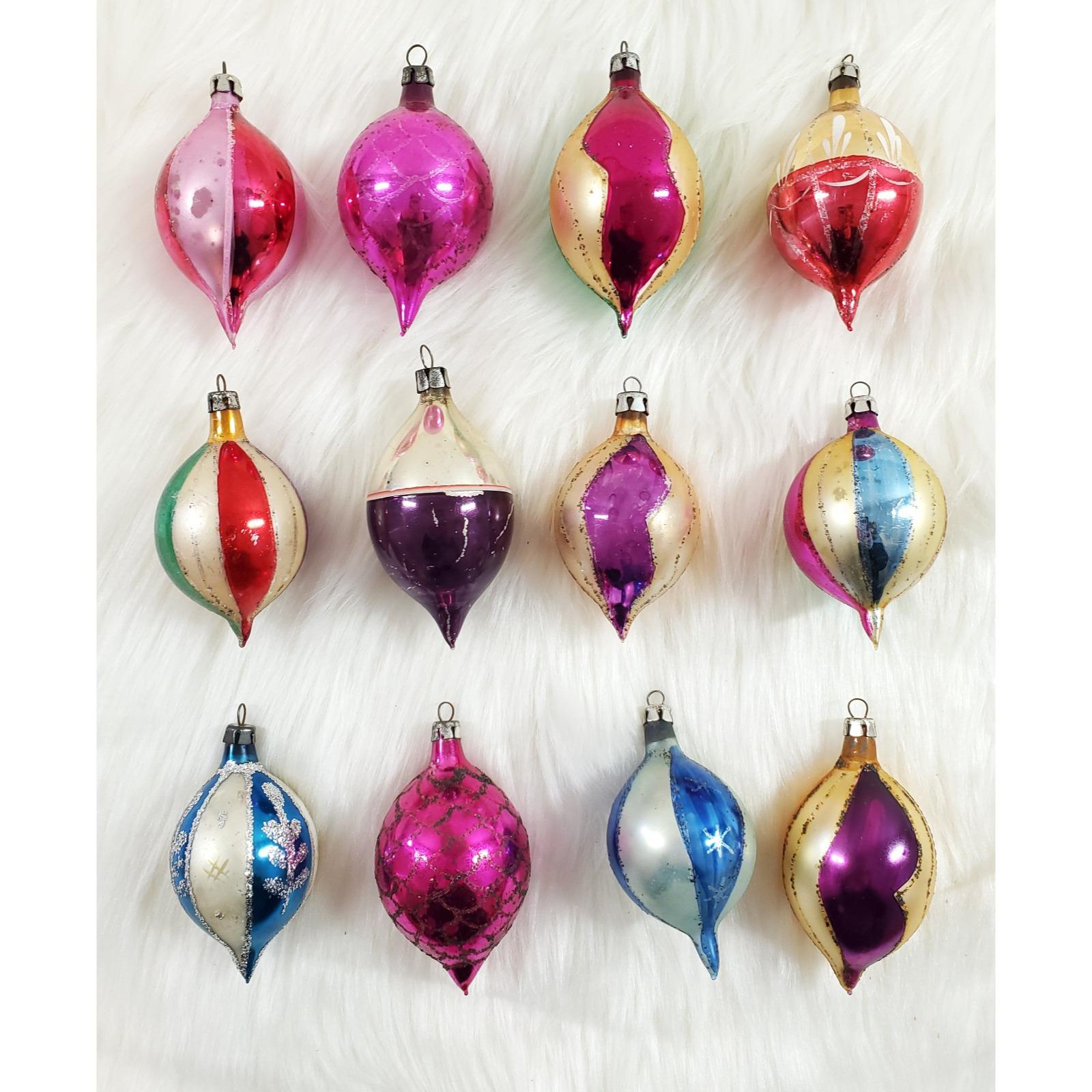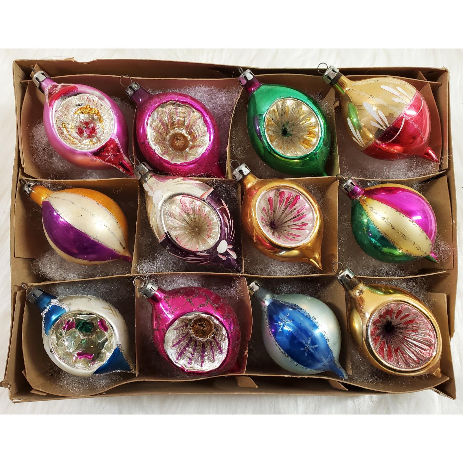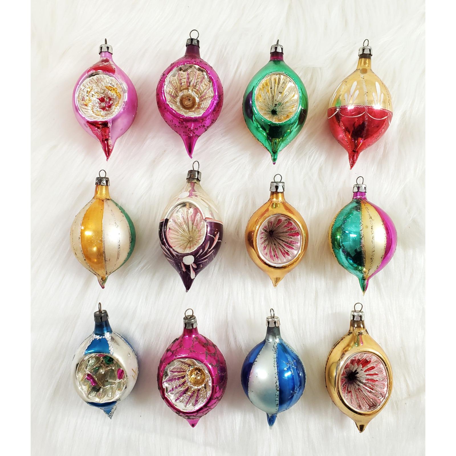 The set of twelve include a beautiful assortment of hand blown and painted teardrop and indent ornaments. Overall in good condition with minor paint/mica loss from age. The blue/white indent has a small hole as shown. Please see all photos for exact condition.