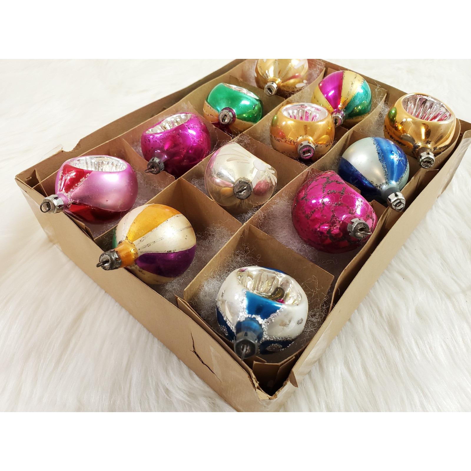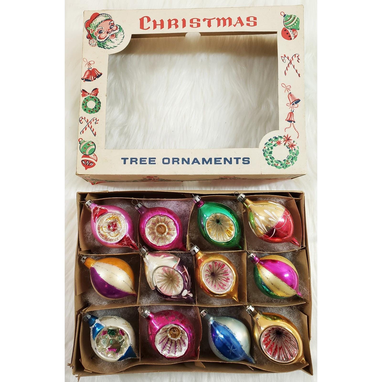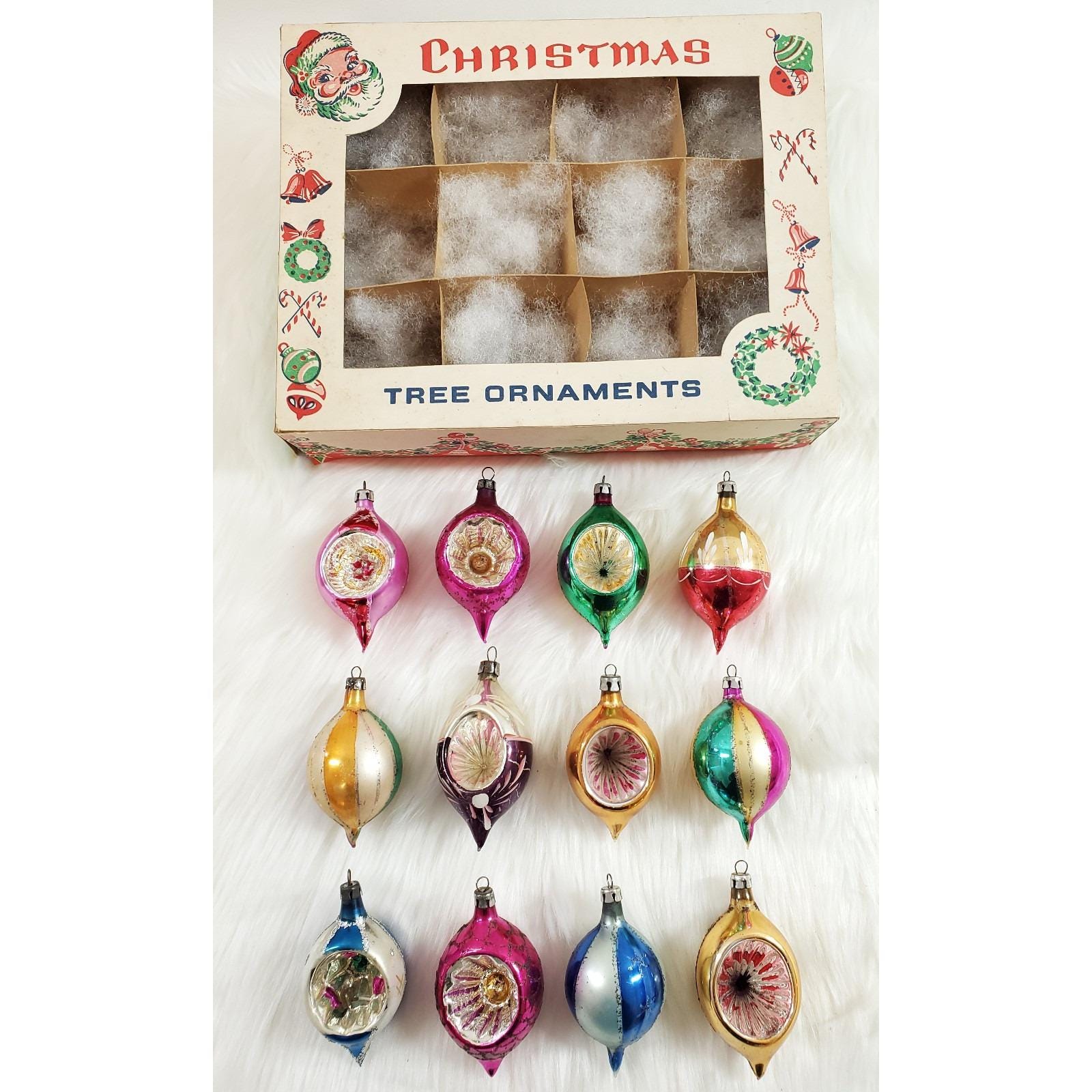 The set of twelve include a beautiful assortment of hand blown and painted teardrop and indent ornaments. Overall in good condition with minor paint/mica loss from age. The blue/white indent has a small hole as shown. Please see all photos for exact condition.