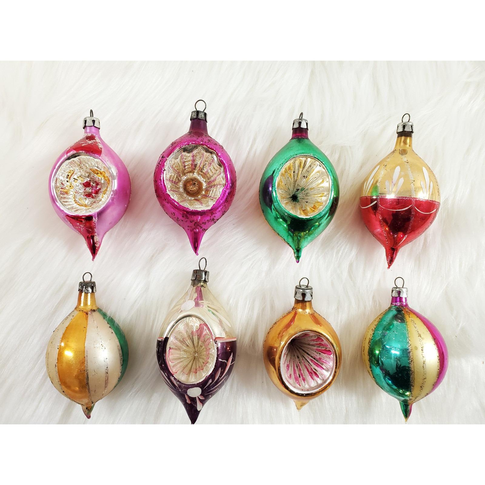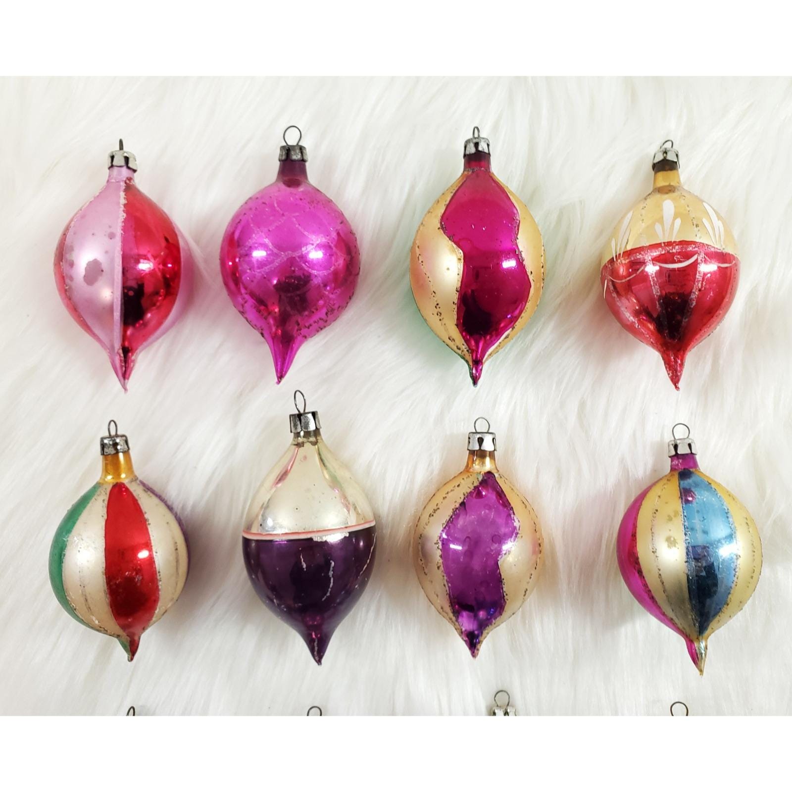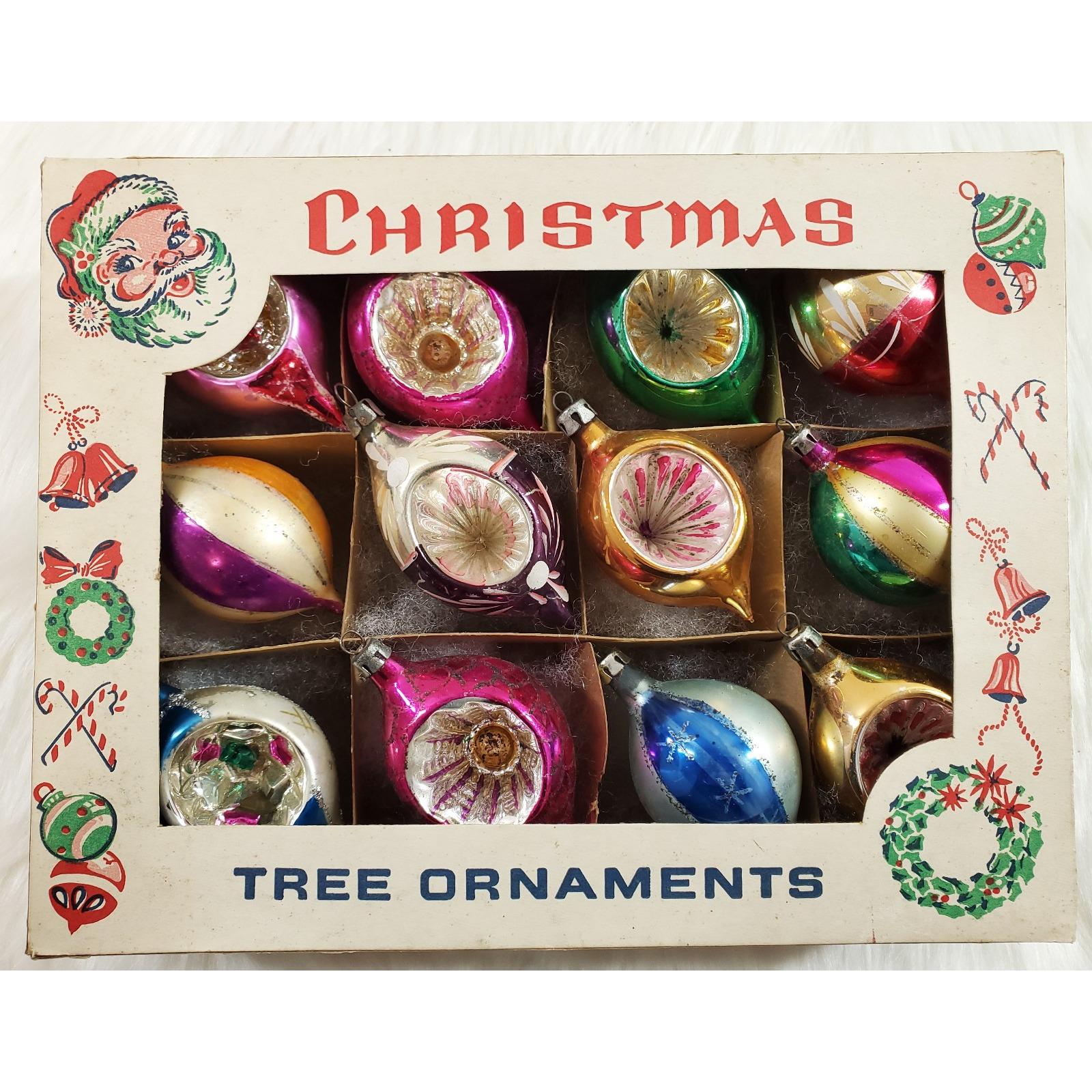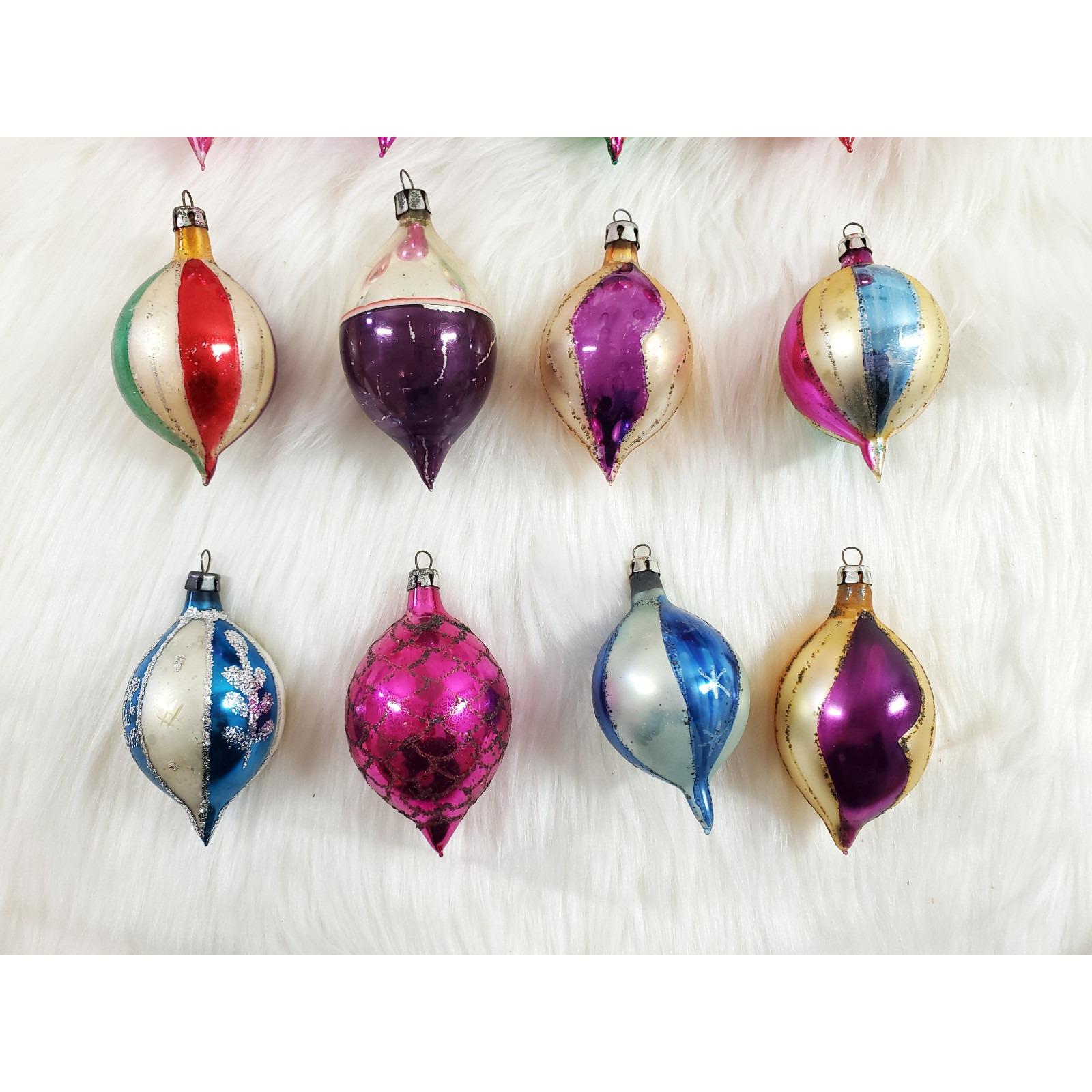 The set of twelve include a beautiful assortment of hand blown and painted teardrop and indent ornaments. Overall in good condition with minor paint/mica loss from age. The blue/white indent has a small hole as shown. Please see all photos for exact condition.