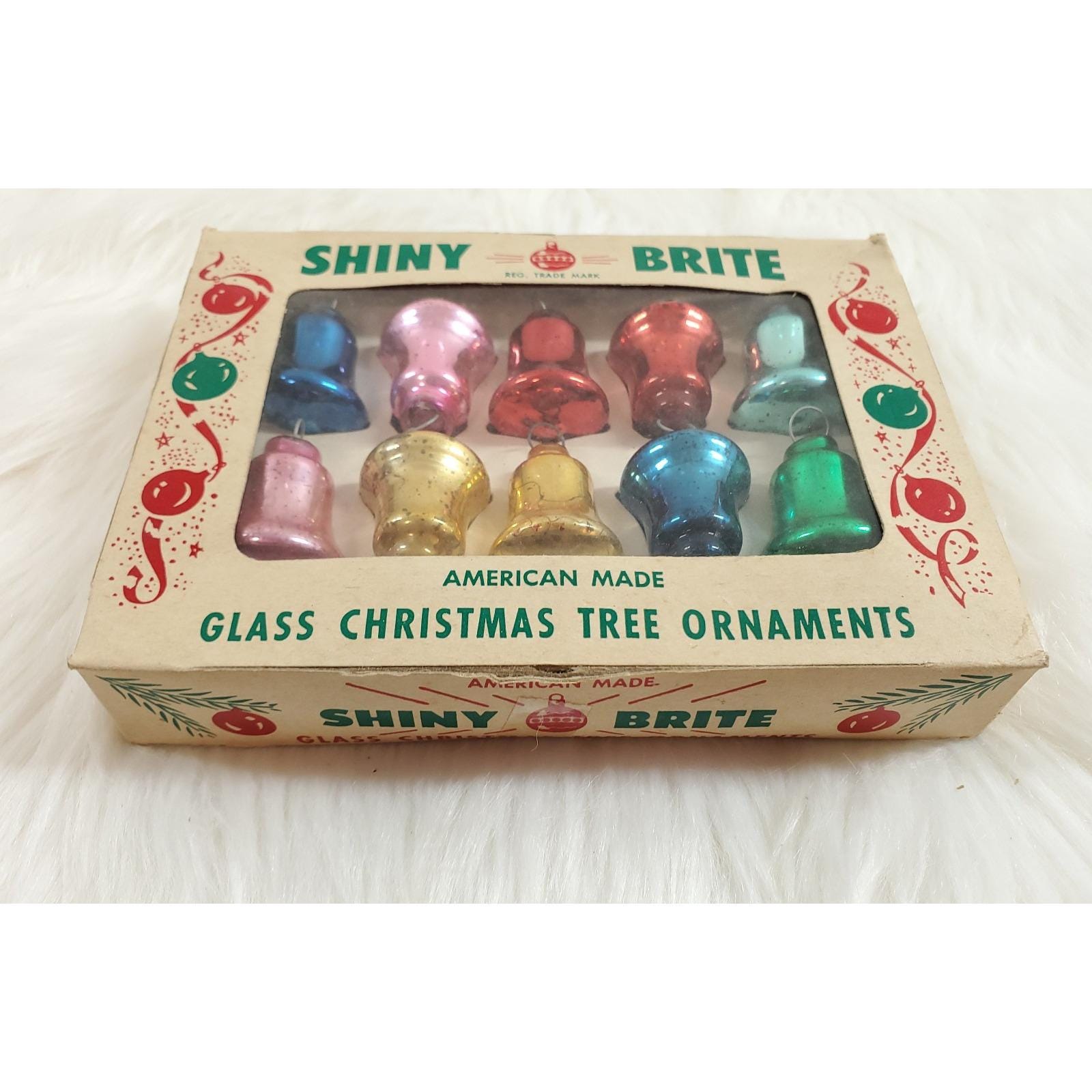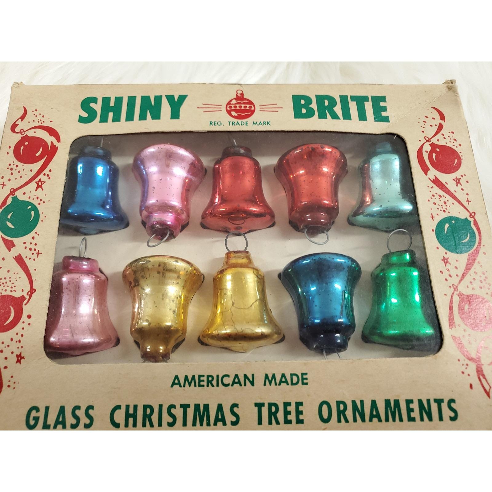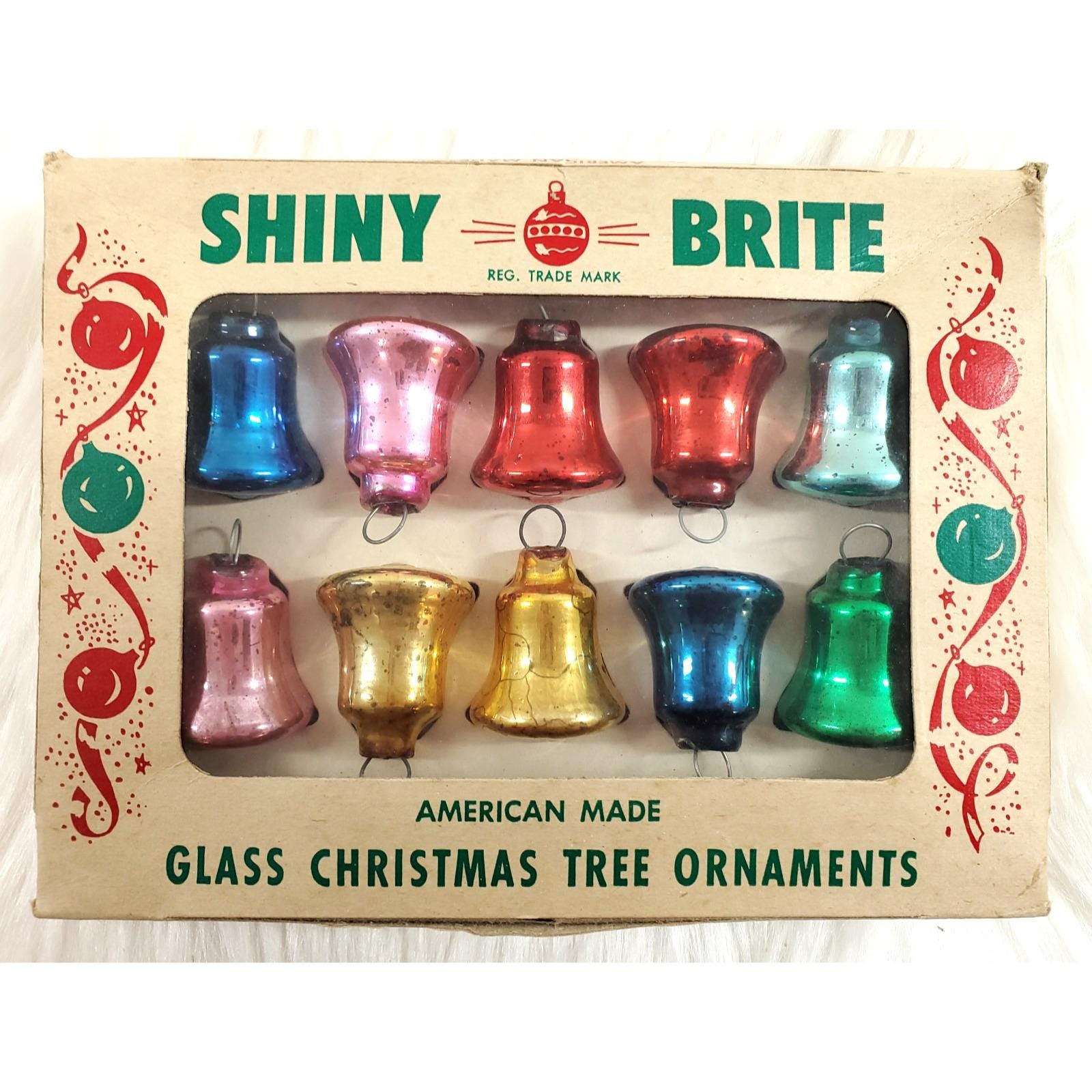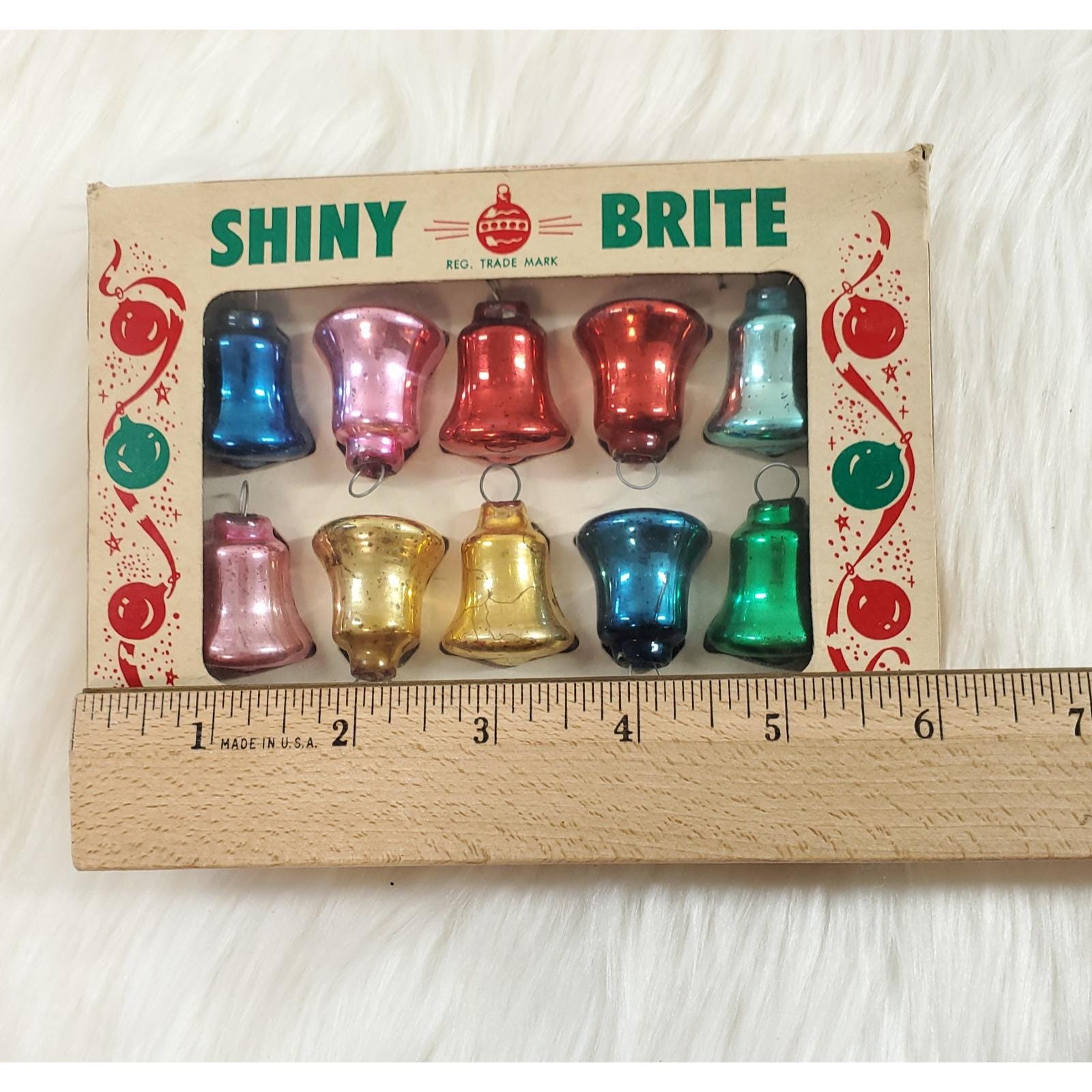 10 Vintage Shiny Brite Mini Glass Feather Tree Bell Christmas Ornaments Box NIP