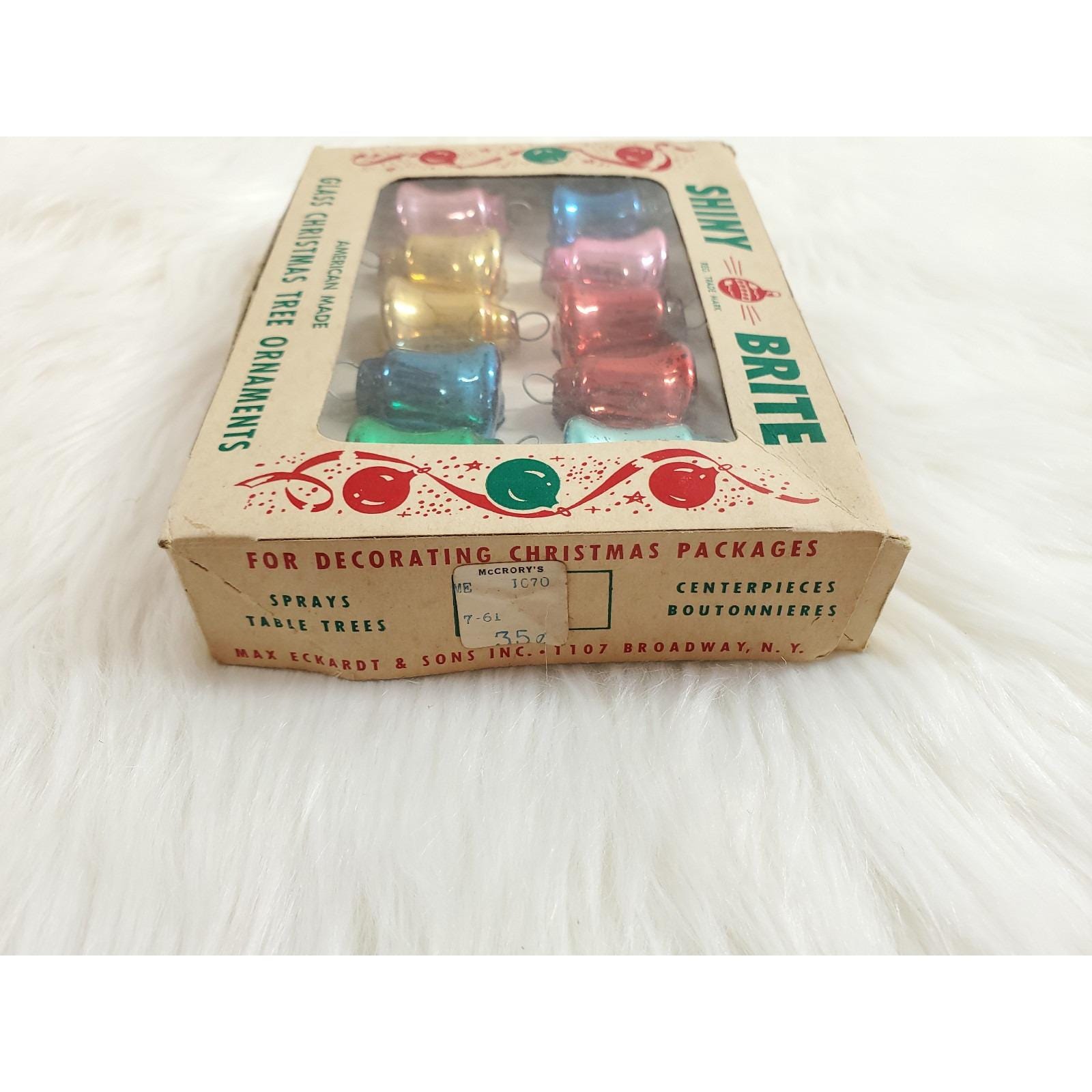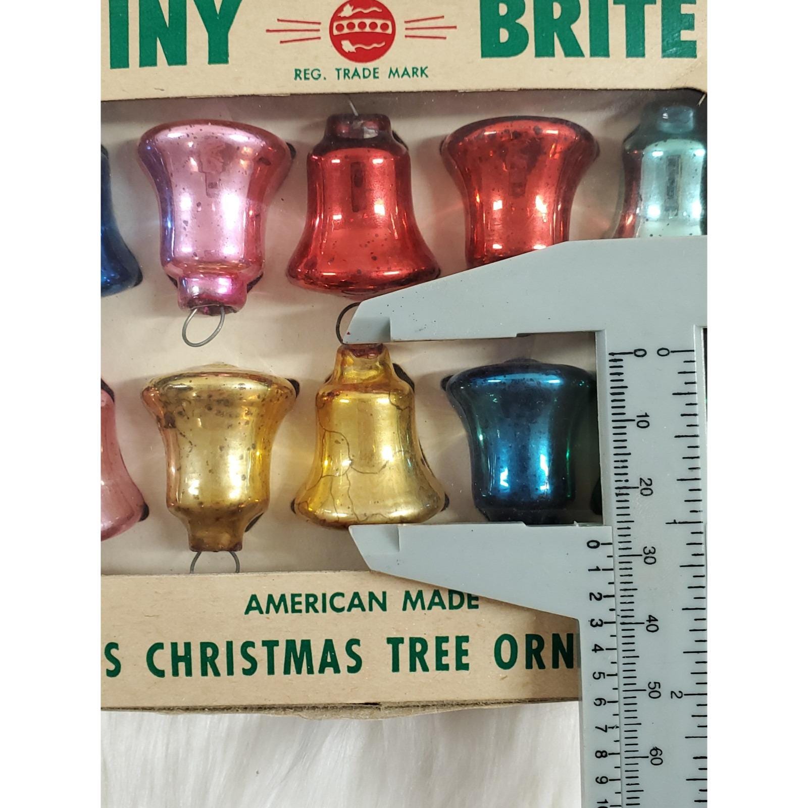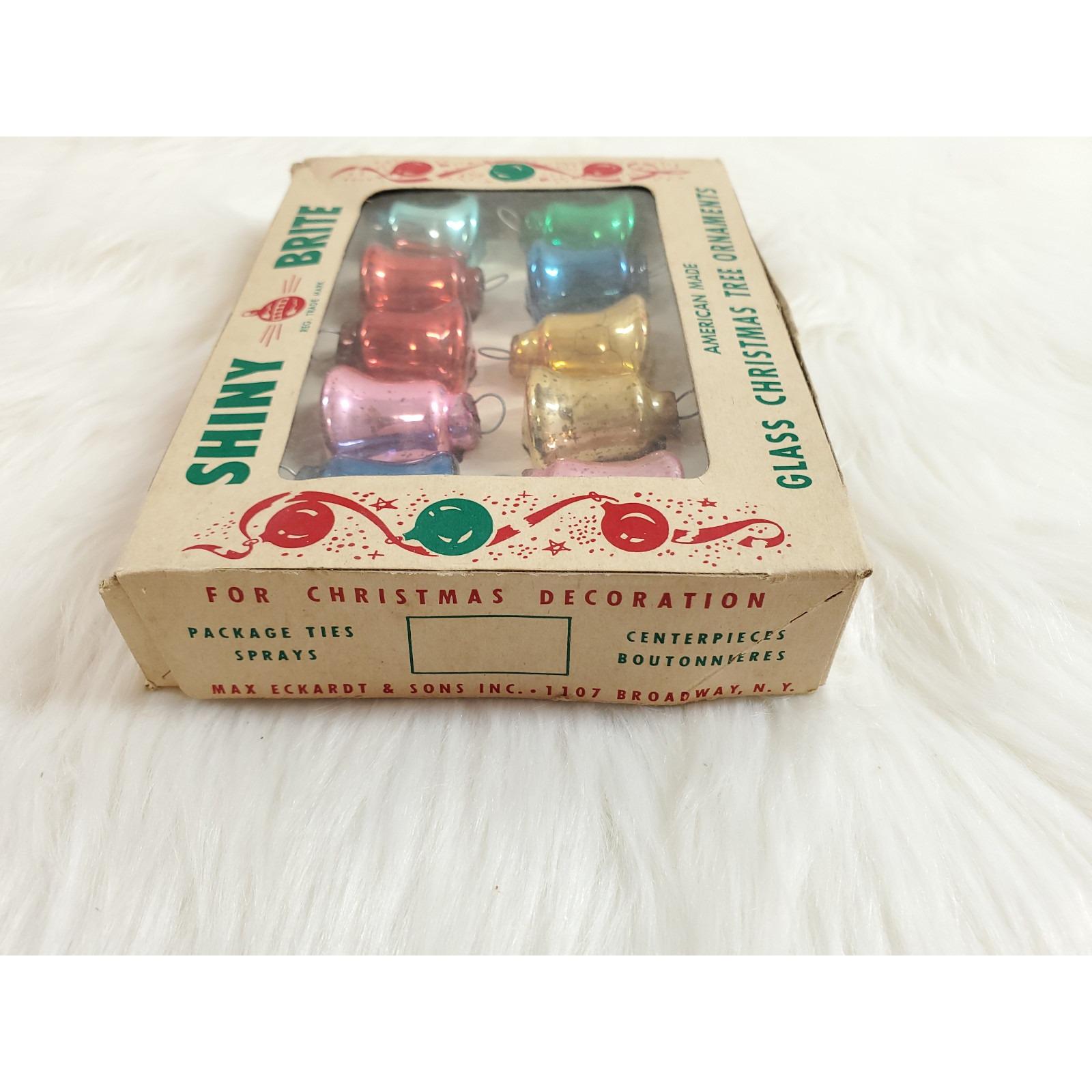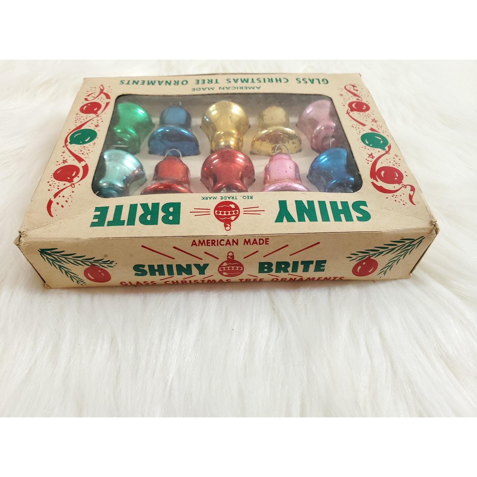 10 Vintage Shiny Brite Mini Glass Feather Tree Bell Christmas Ornaments Box NIP