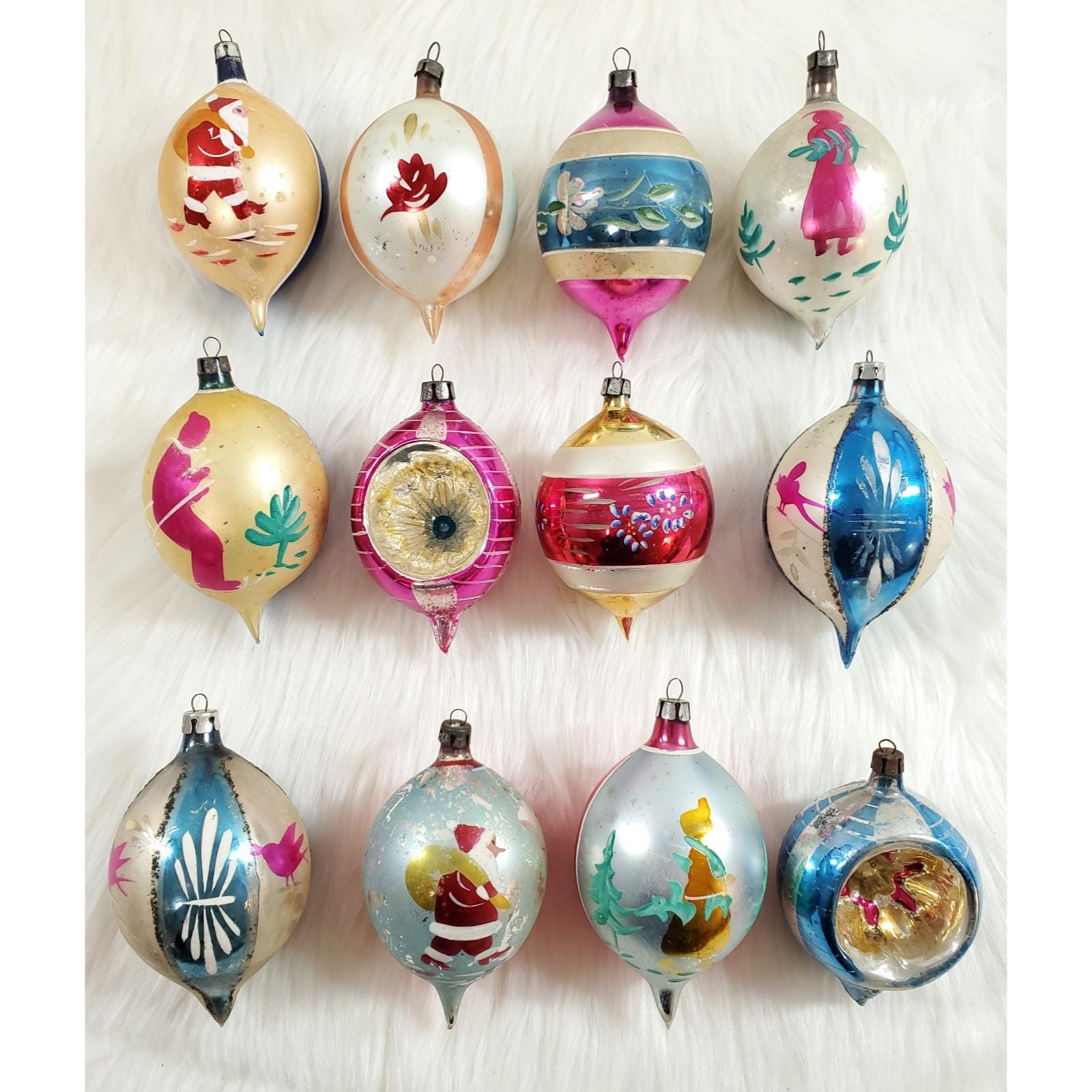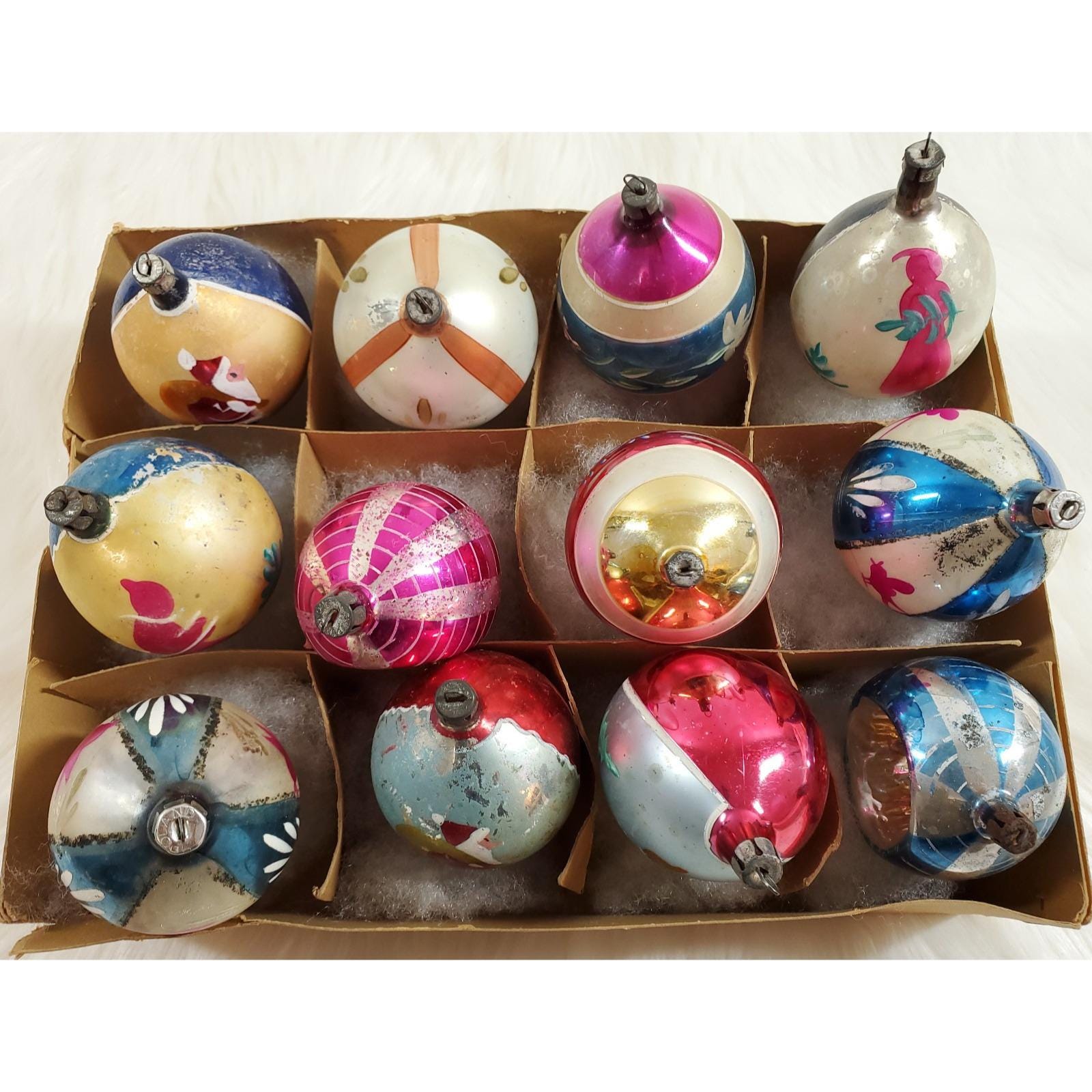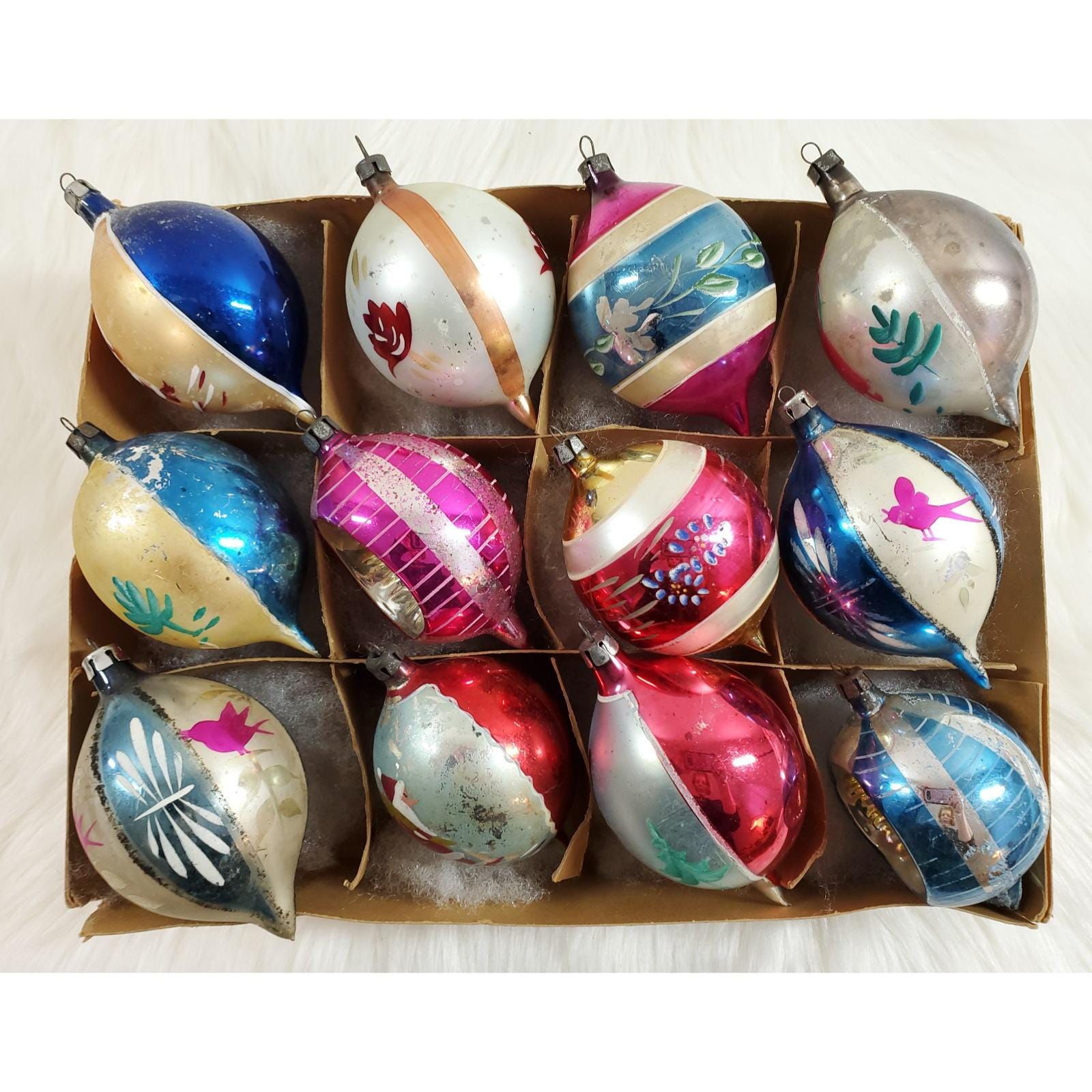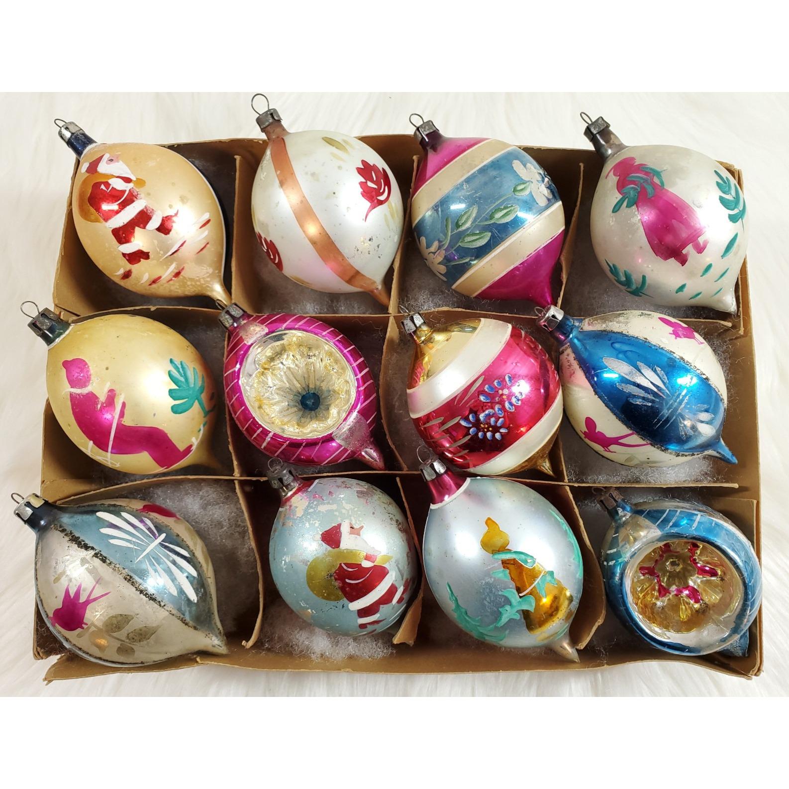 The set of twelve include a beautiful assortment of hand blown and painted teardrop and indent ornaments. Overall in good condition with paint/mica loss from age. Please see all photos for exact condition. Box does not have a lid.