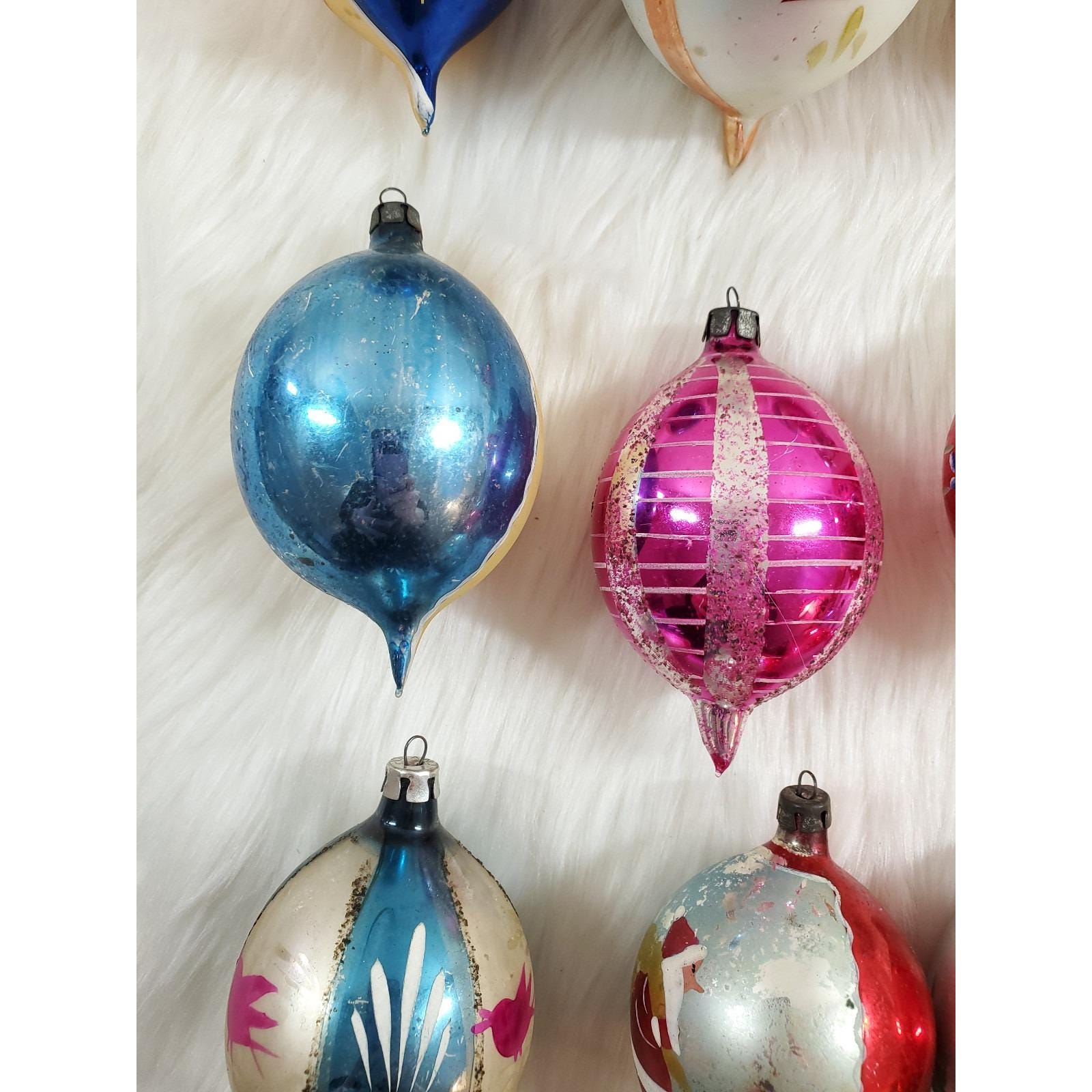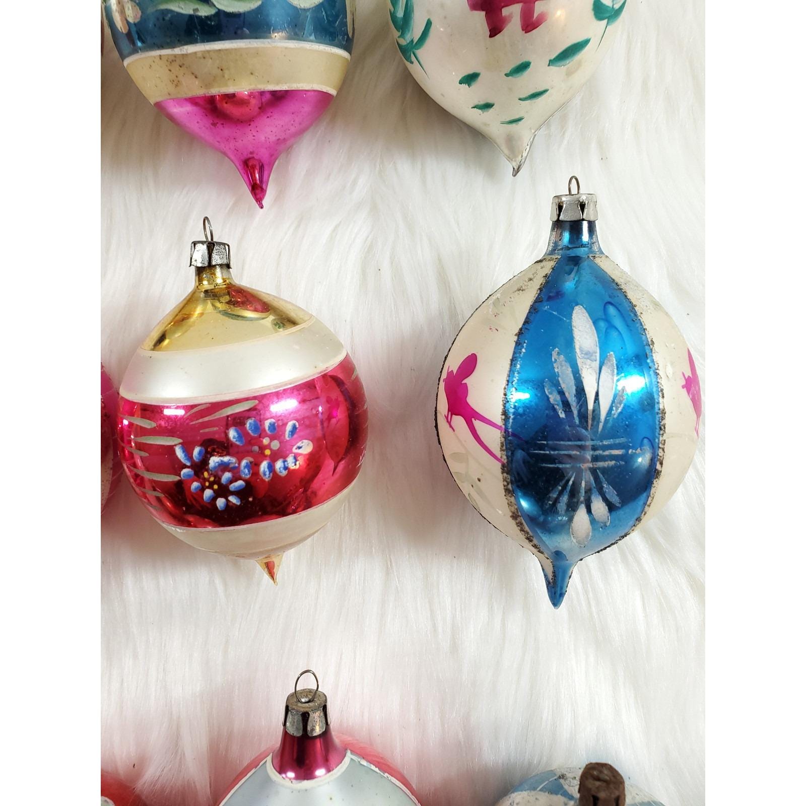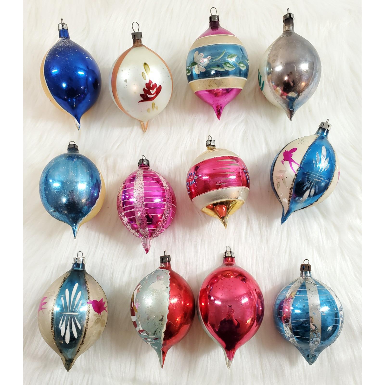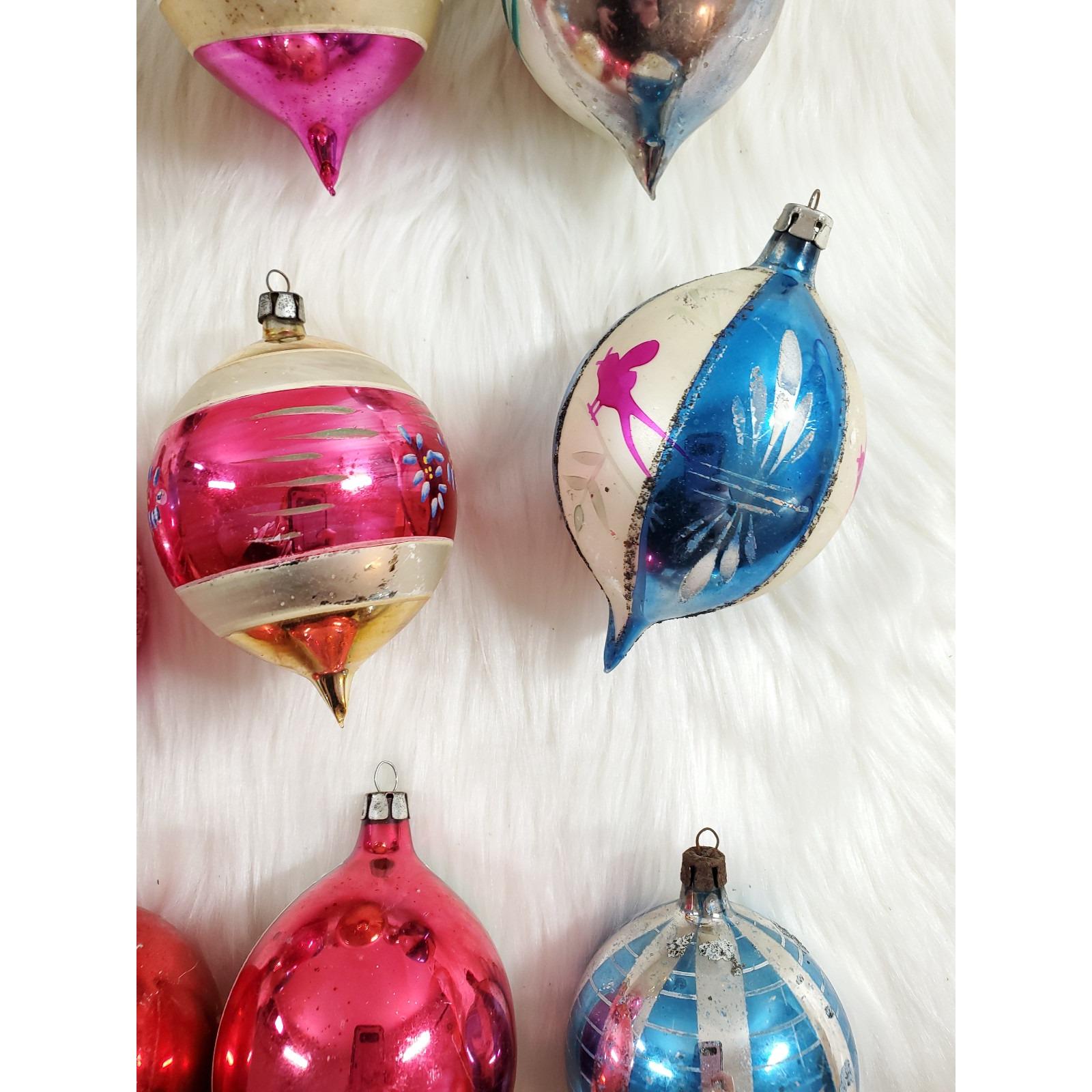 The set of twelve include a beautiful assortment of hand blown and painted teardrop and indent ornaments. Overall in good condition with paint/mica loss from age. Please see all photos for exact condition. Box does not have a lid.