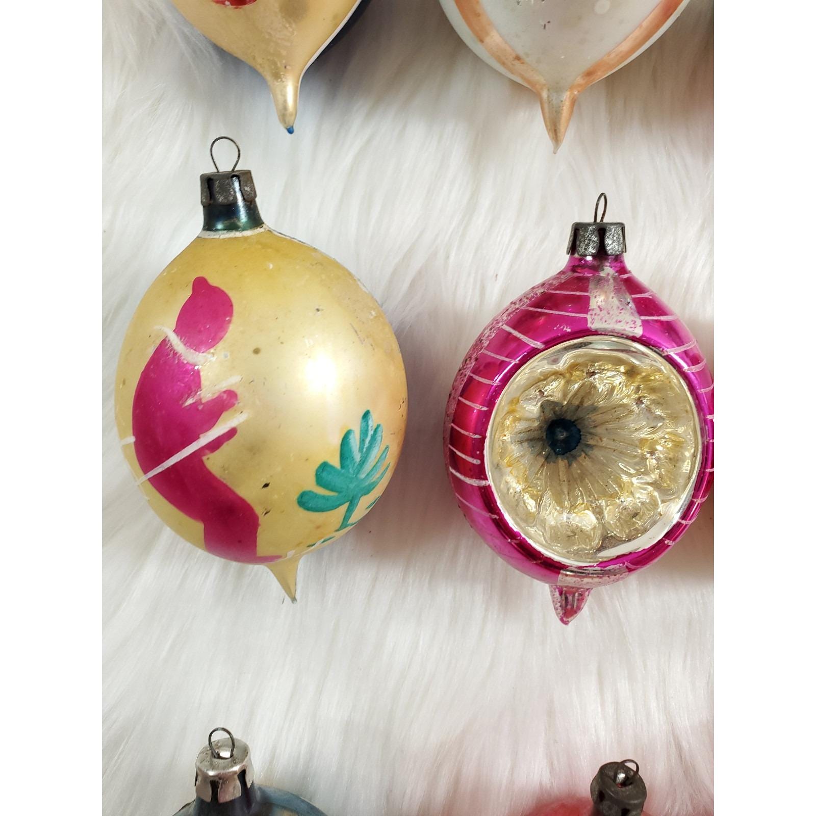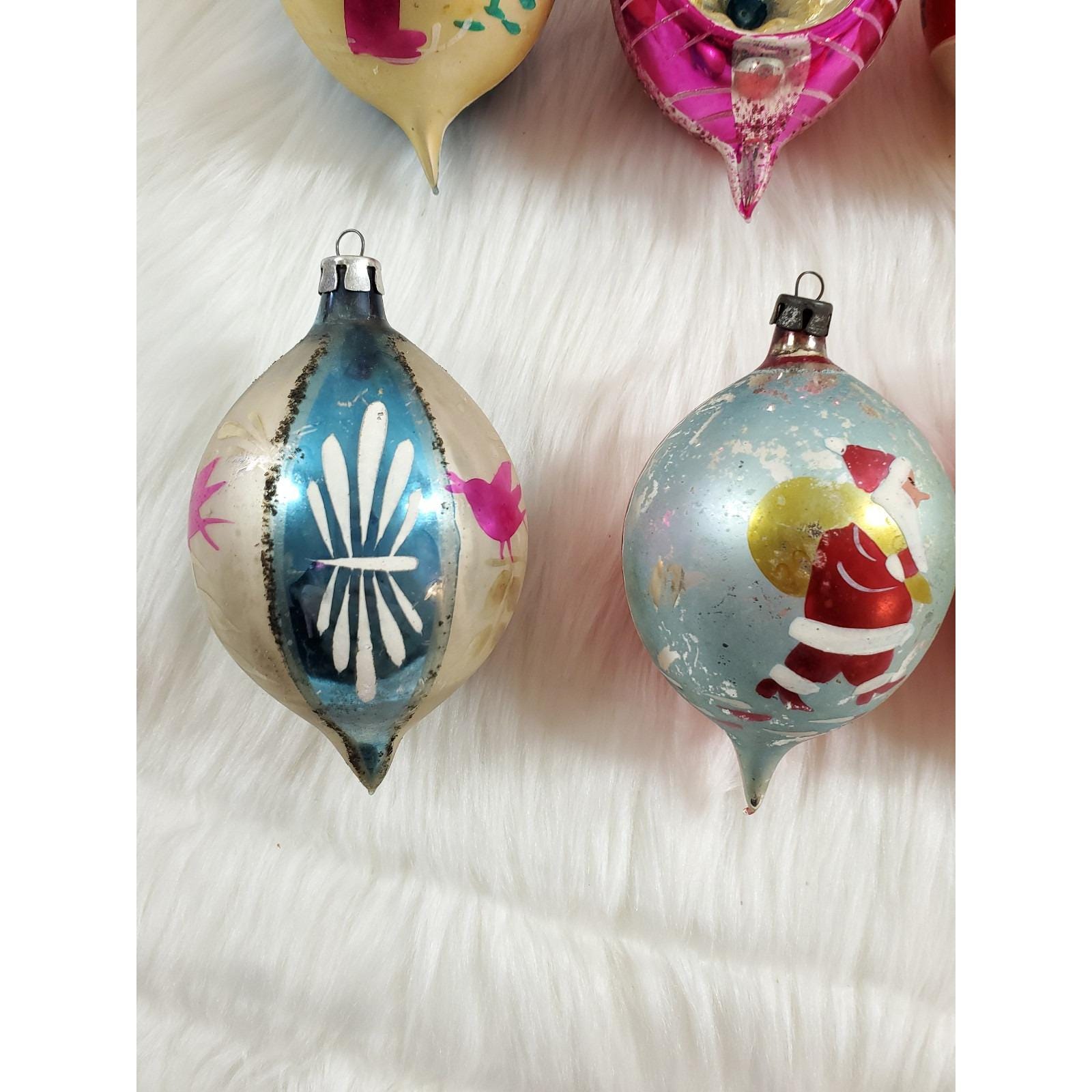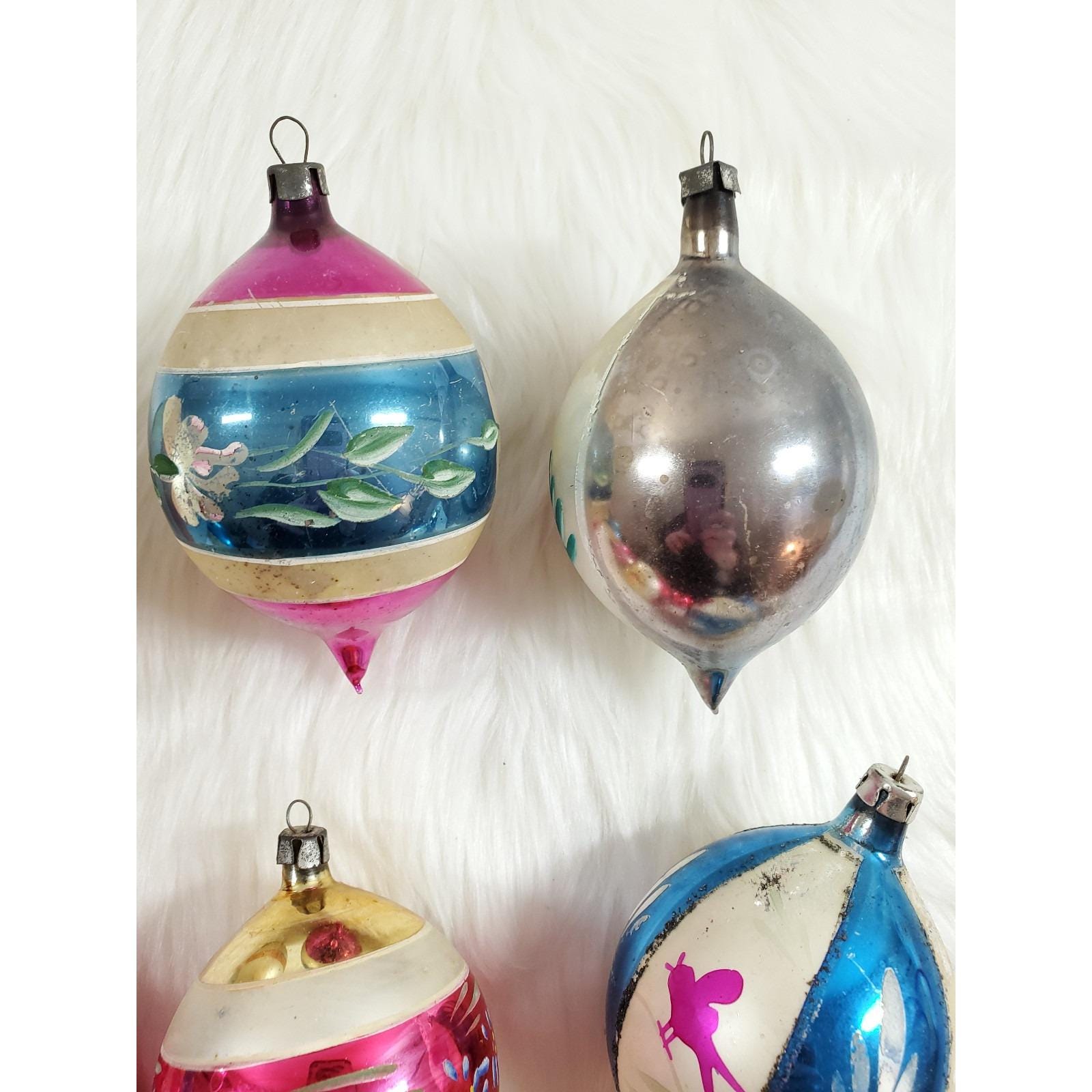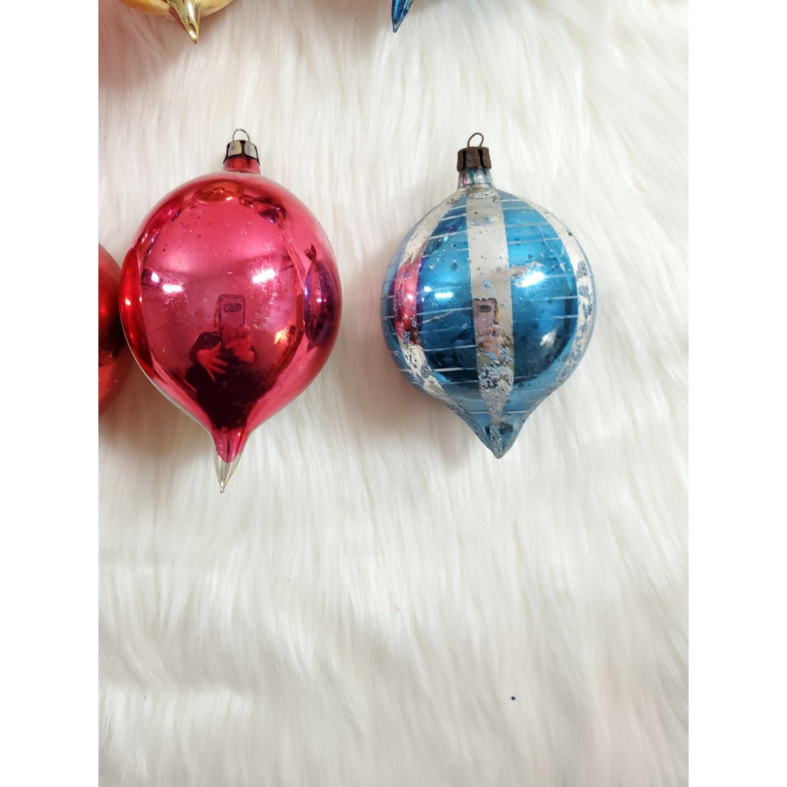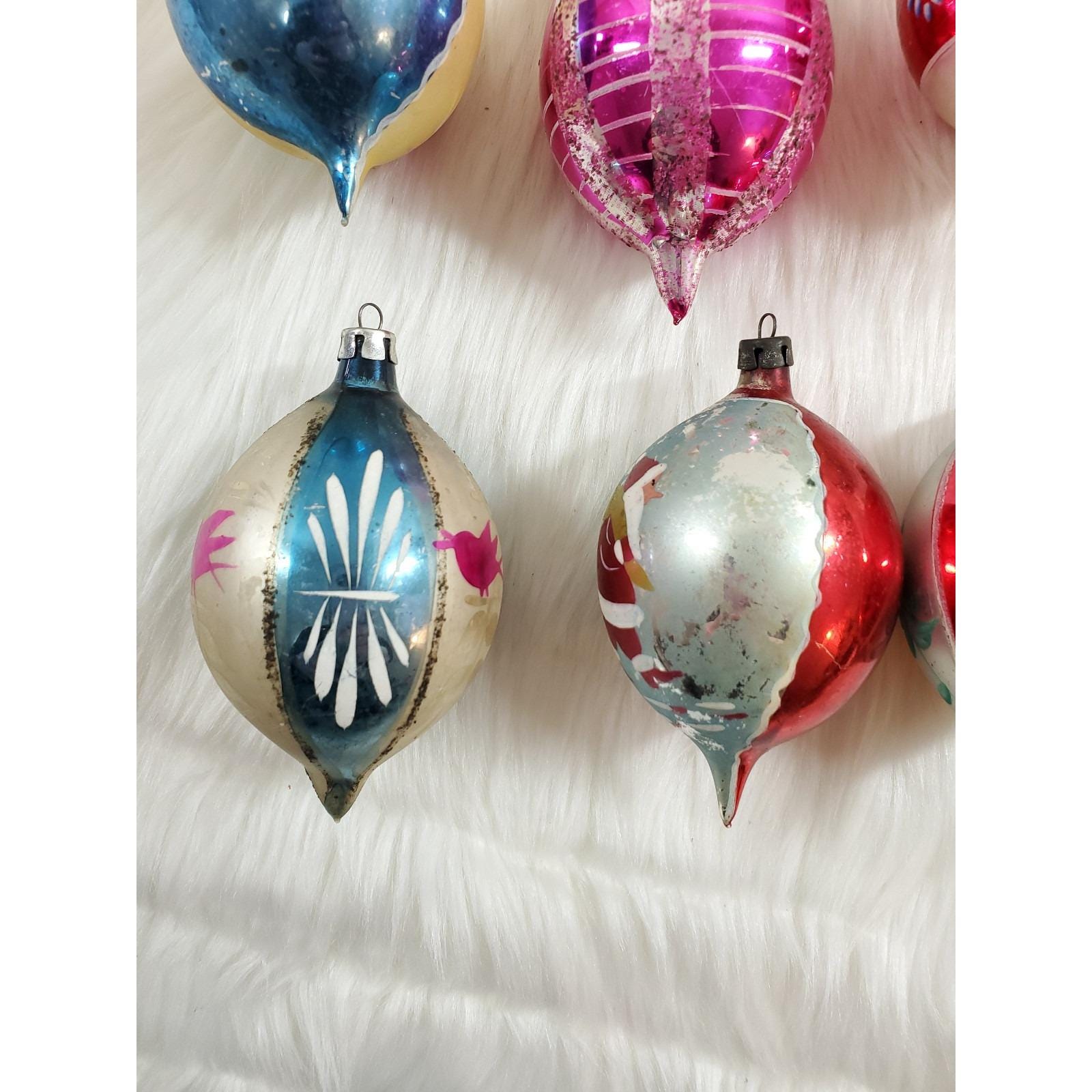 The set of twelve include a beautiful assortment of hand blown and painted teardrop and indent ornaments. Overall in good condition with paint/mica loss from age. Please see all photos for exact condition. Box does not have a lid.