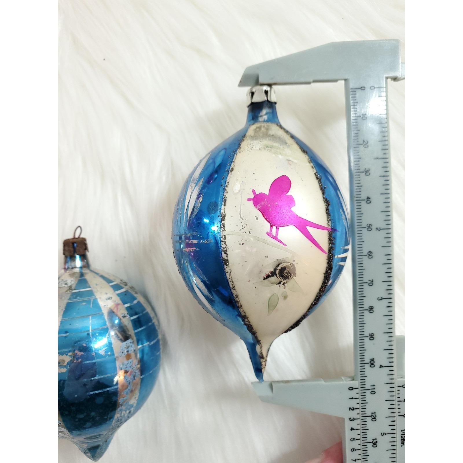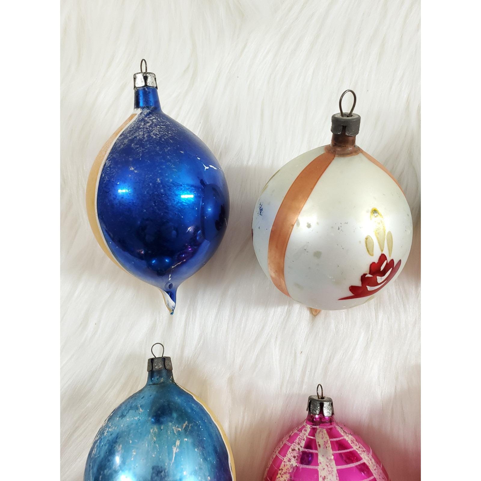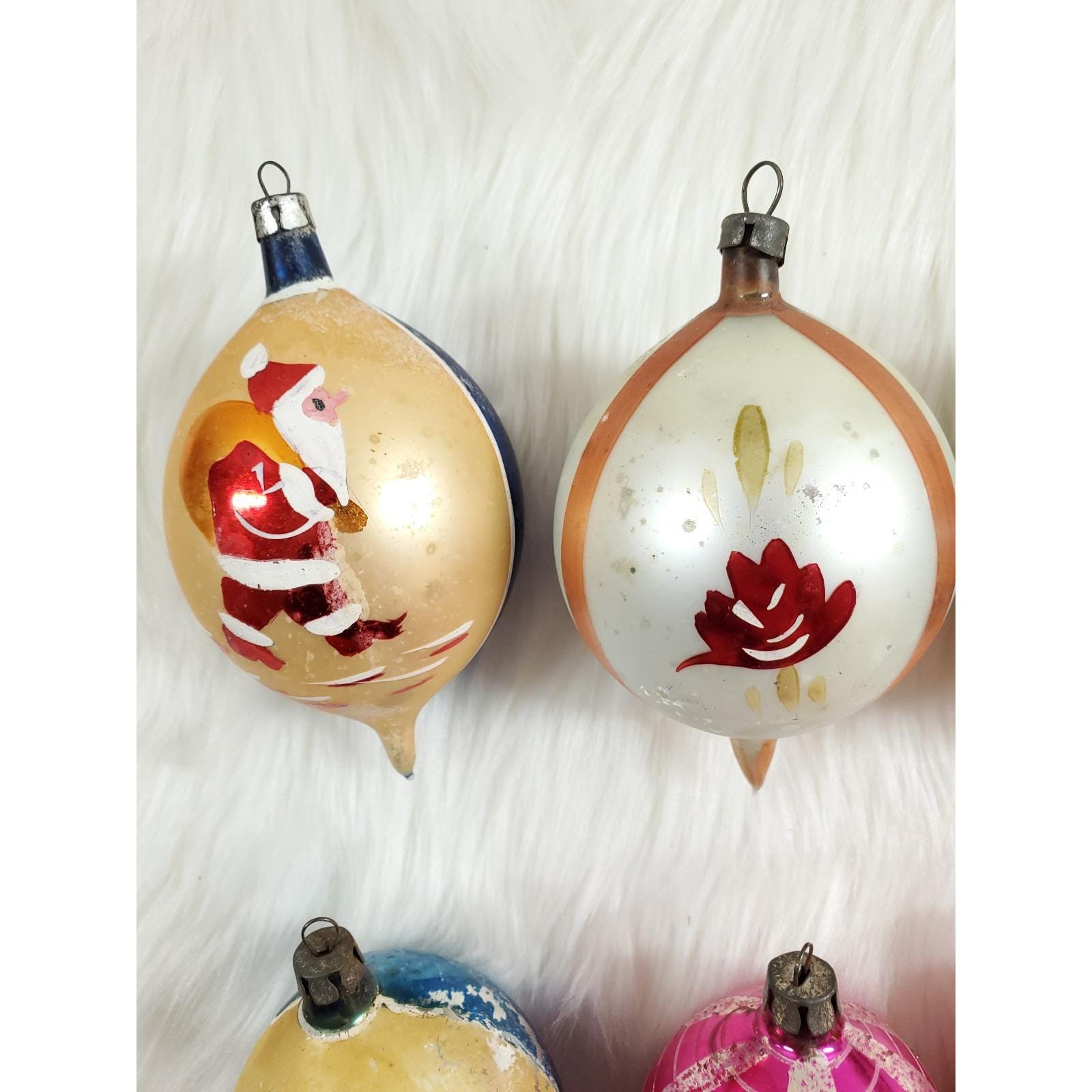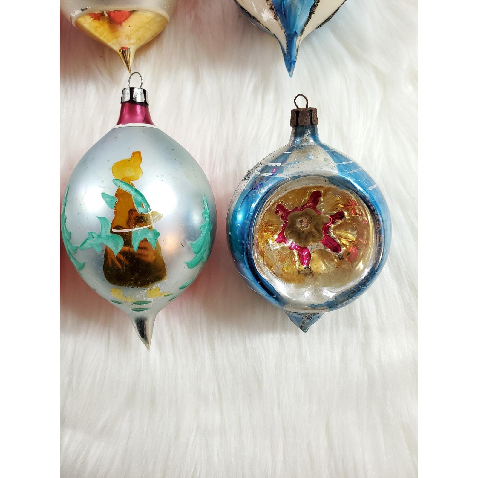 The set of twelve include a beautiful assortment of hand blown and painted teardrop and indent ornaments. Overall in good condition with paint/mica loss from age. Please see all photos for exact condition. Box does not have a lid.