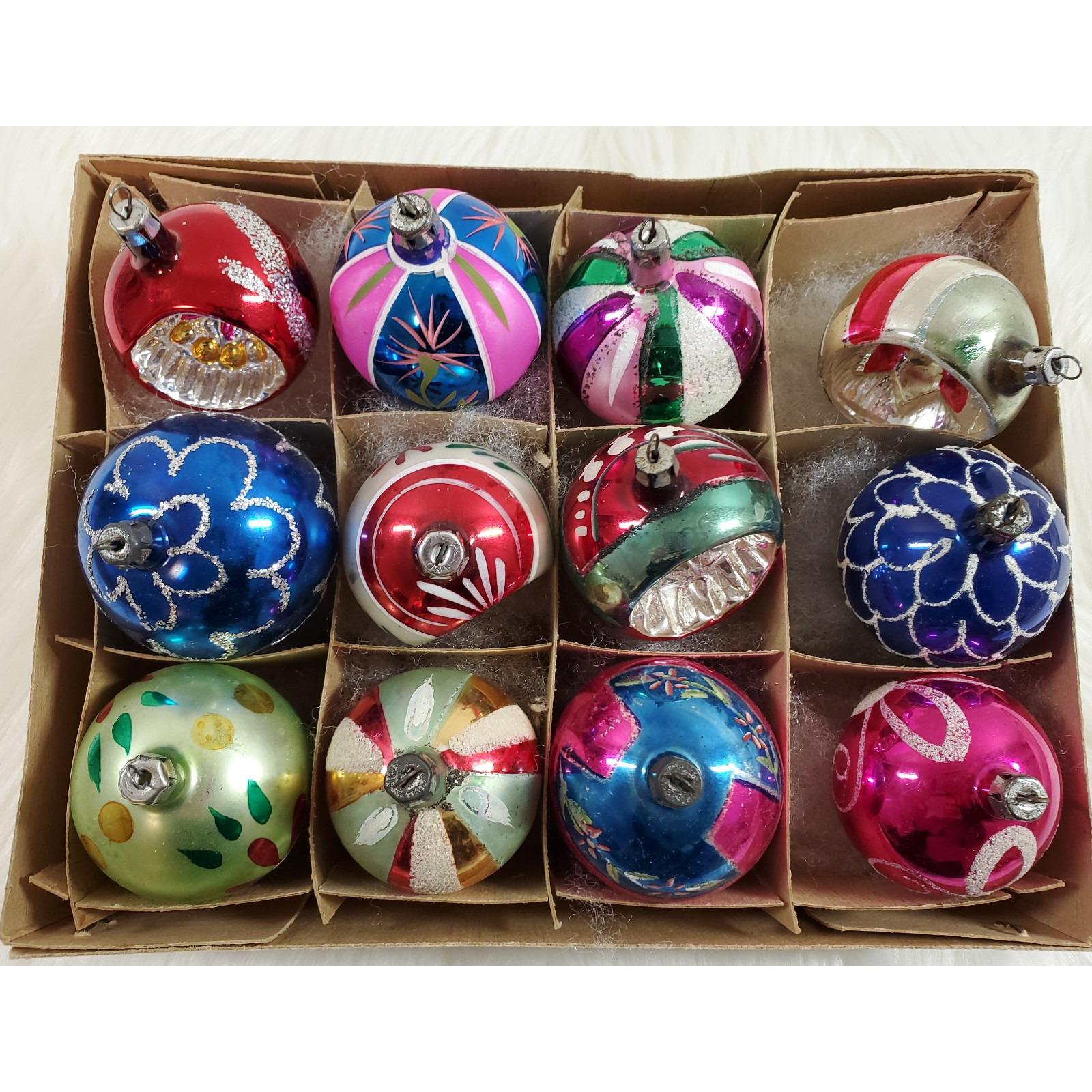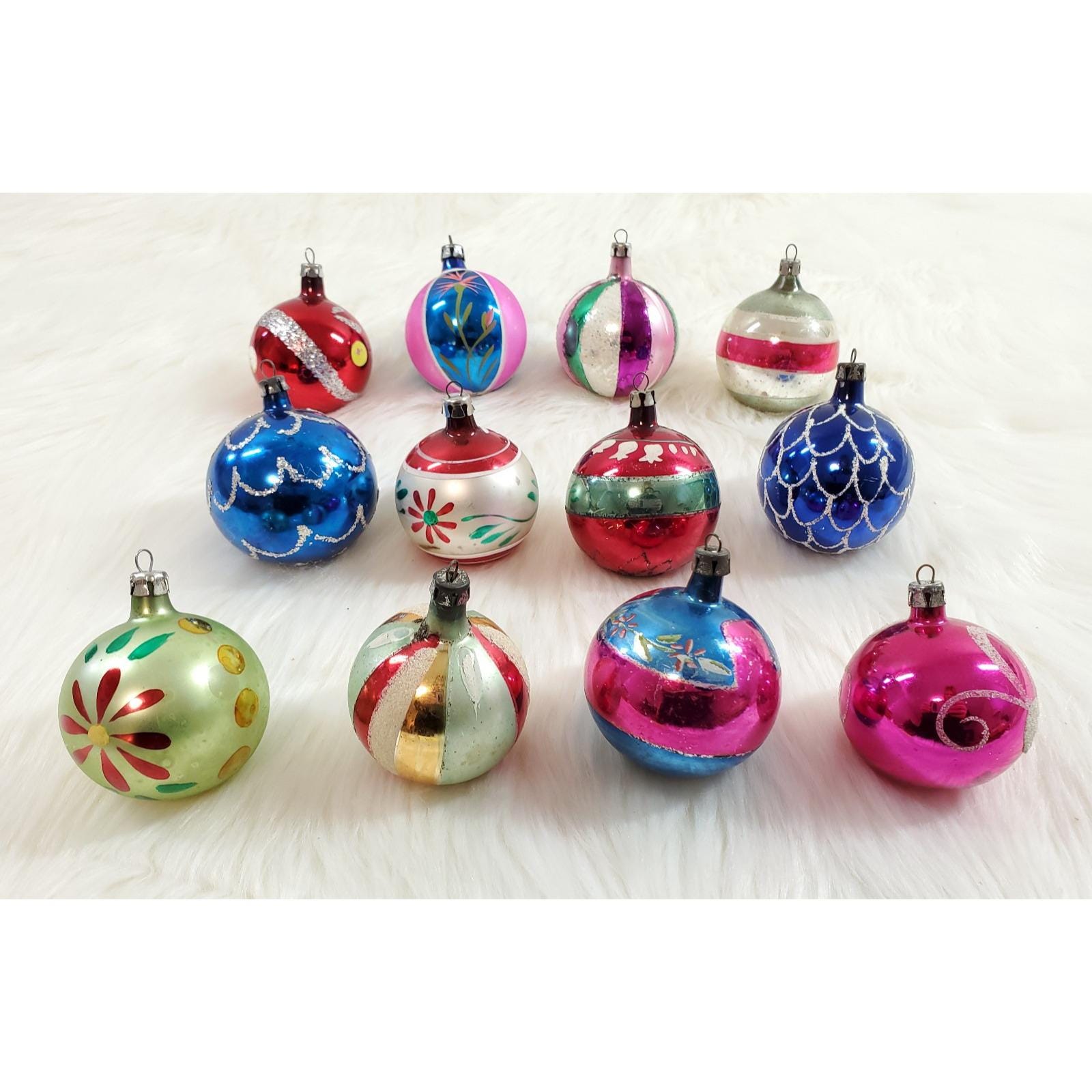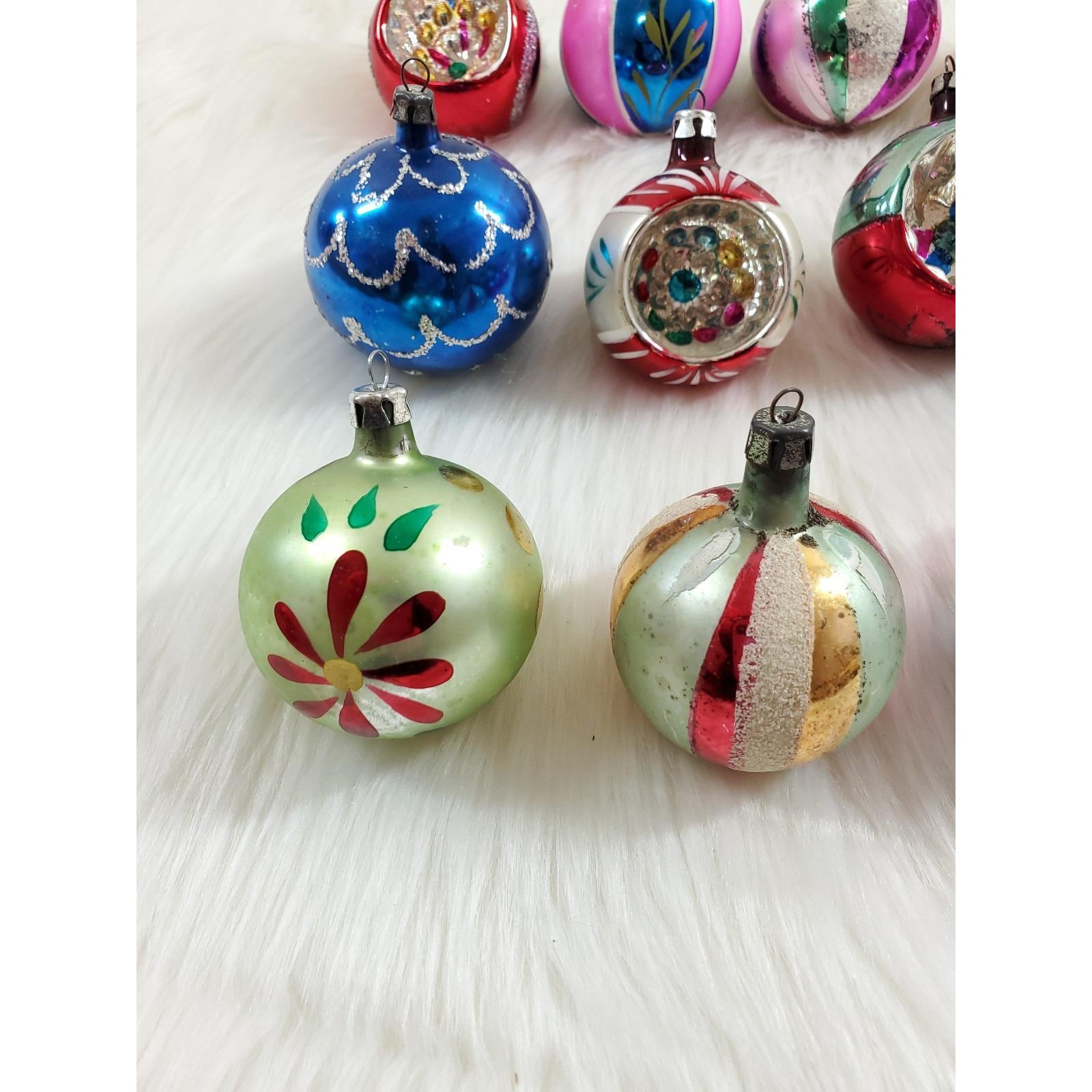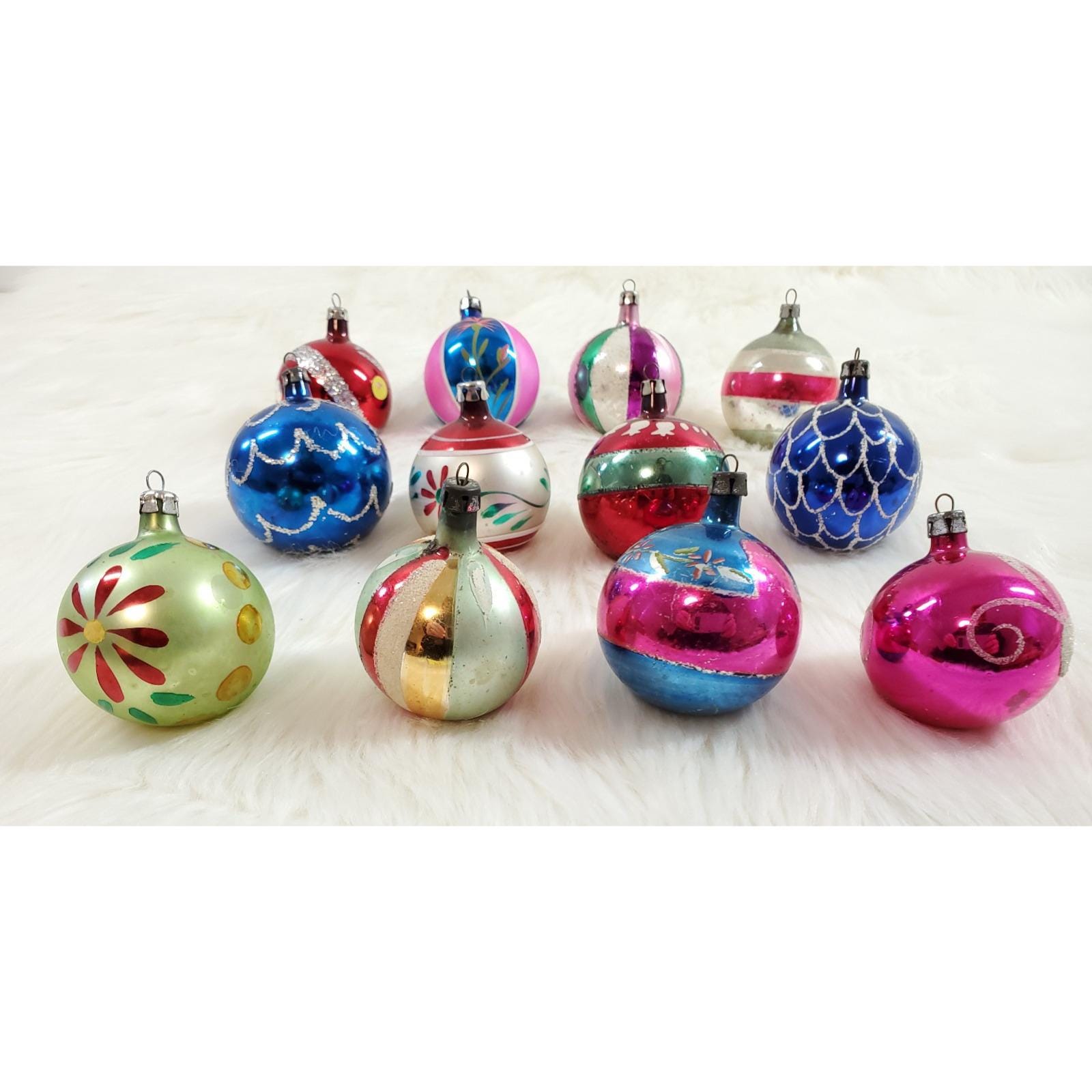 The set of twelve include a beautiful assortment of hand blown and painted ornaments ball ornaments. Overall in good condition with paint/mica loss from age. Please see all photos for exact condition. Box does not have a lid.