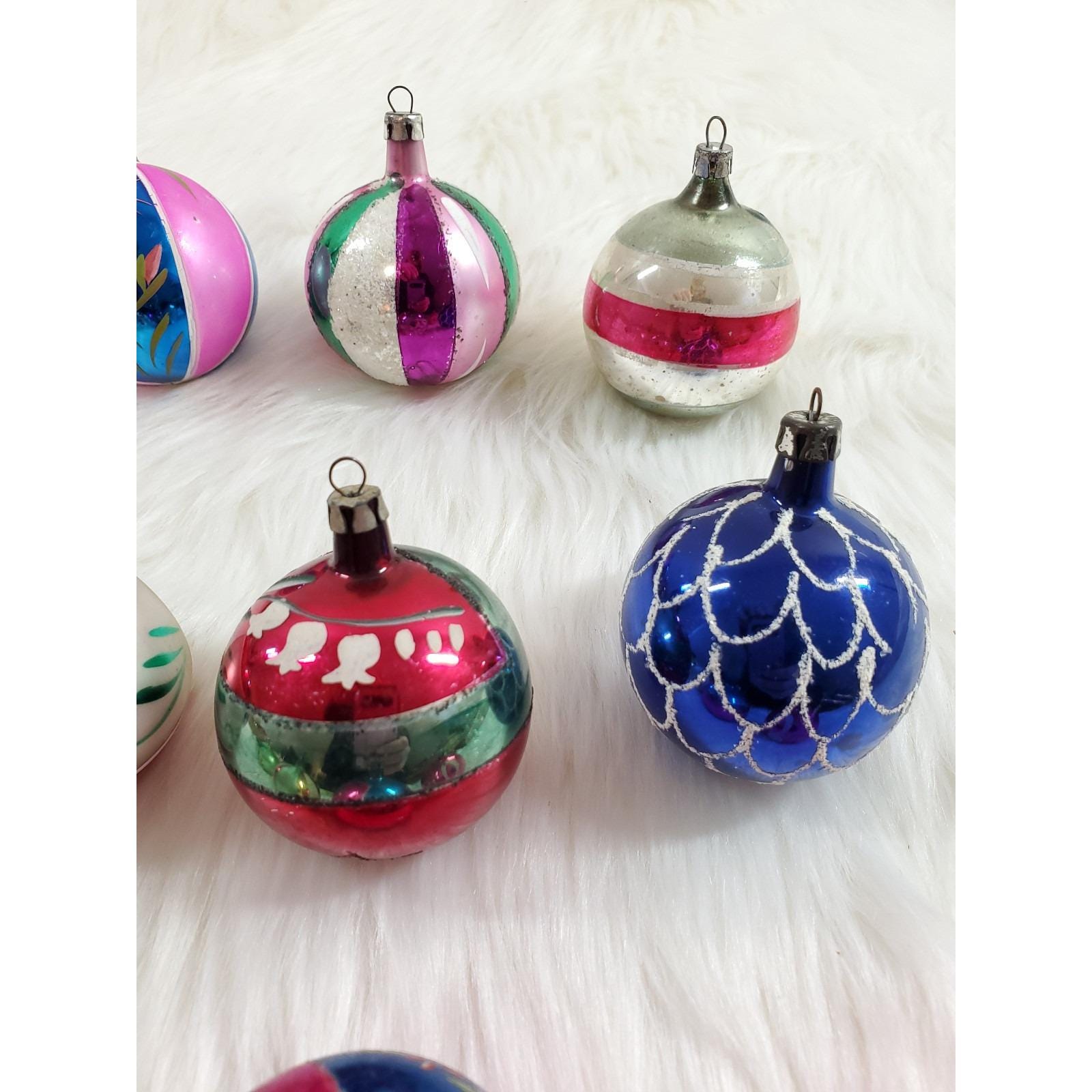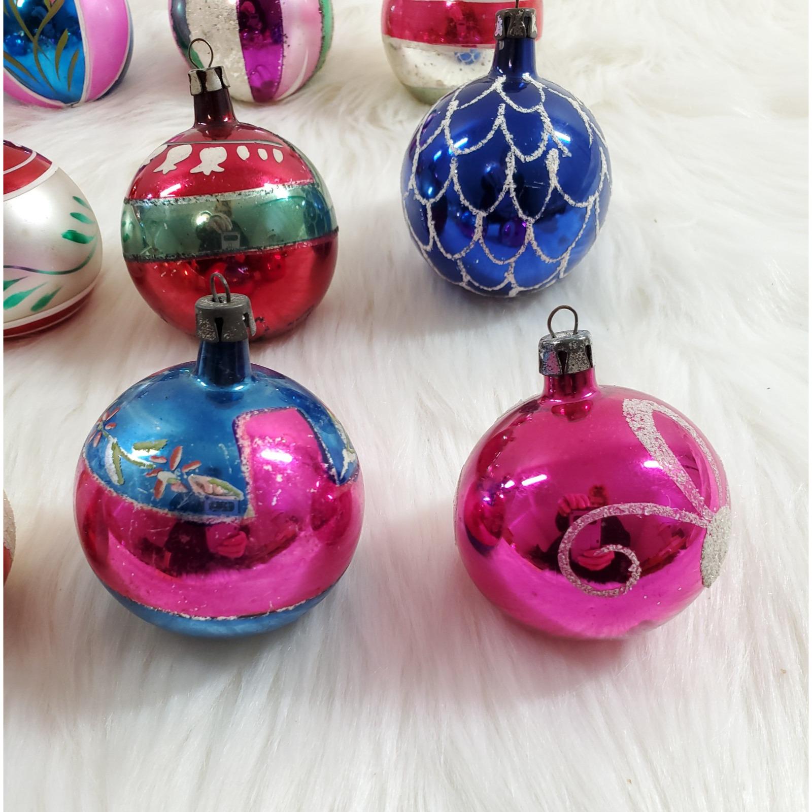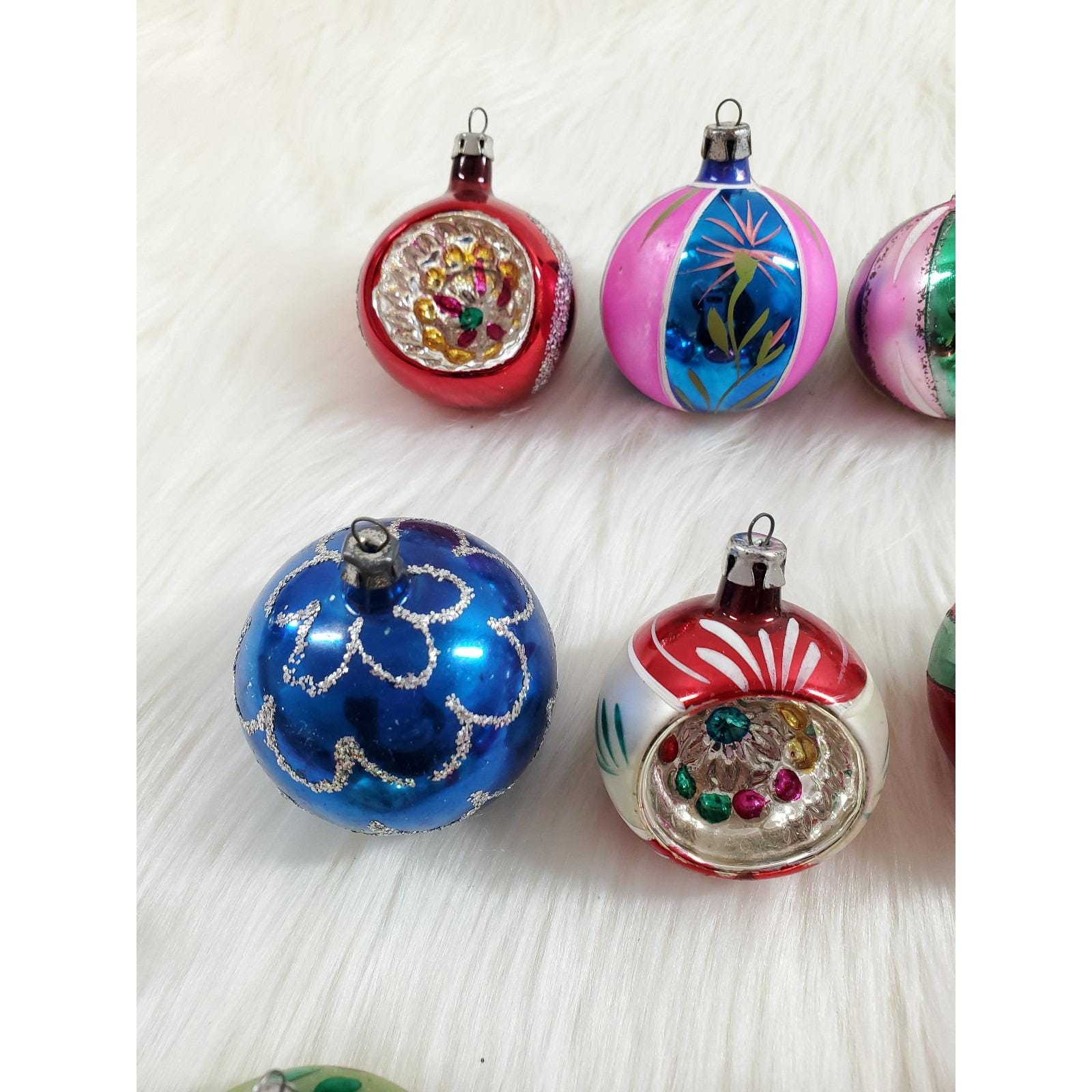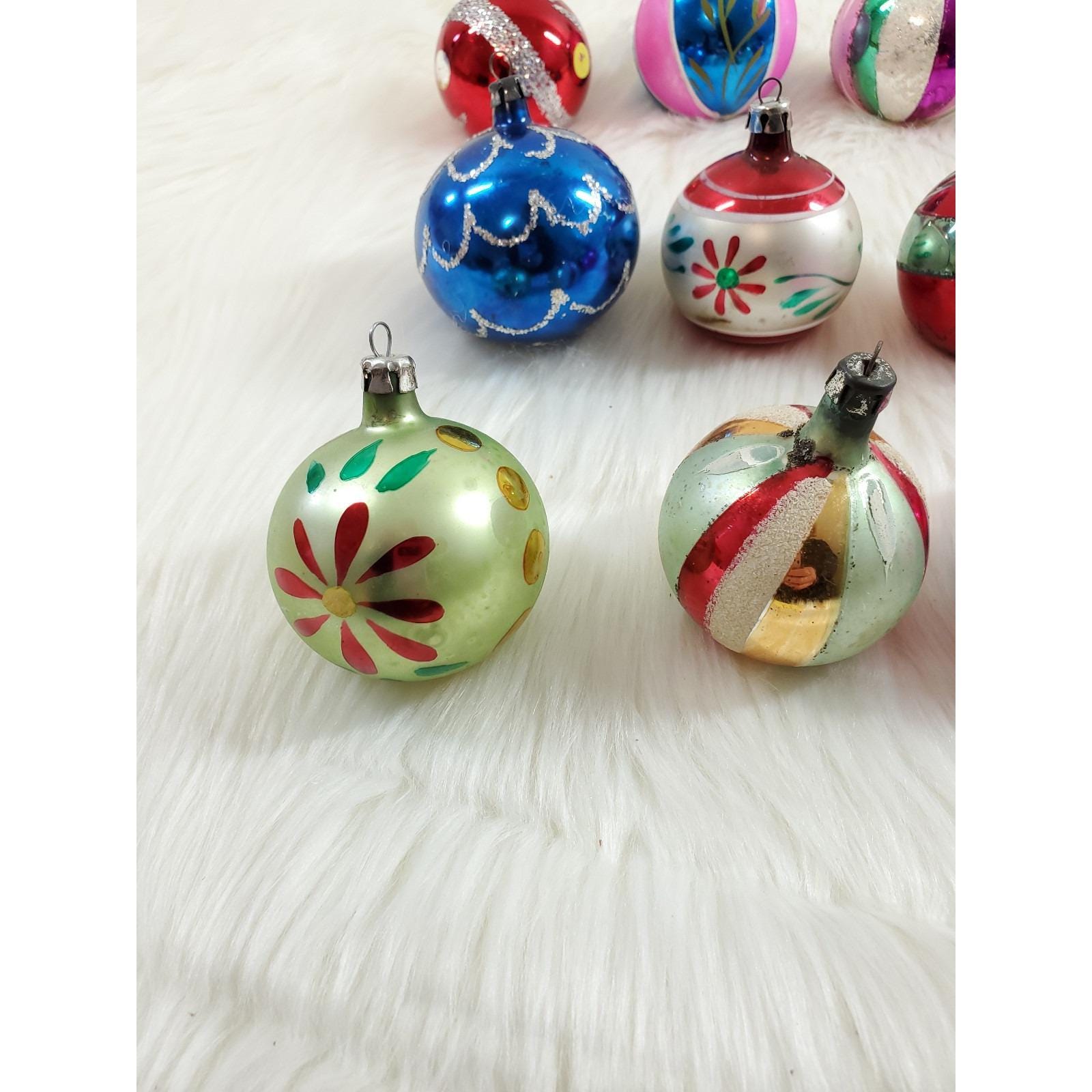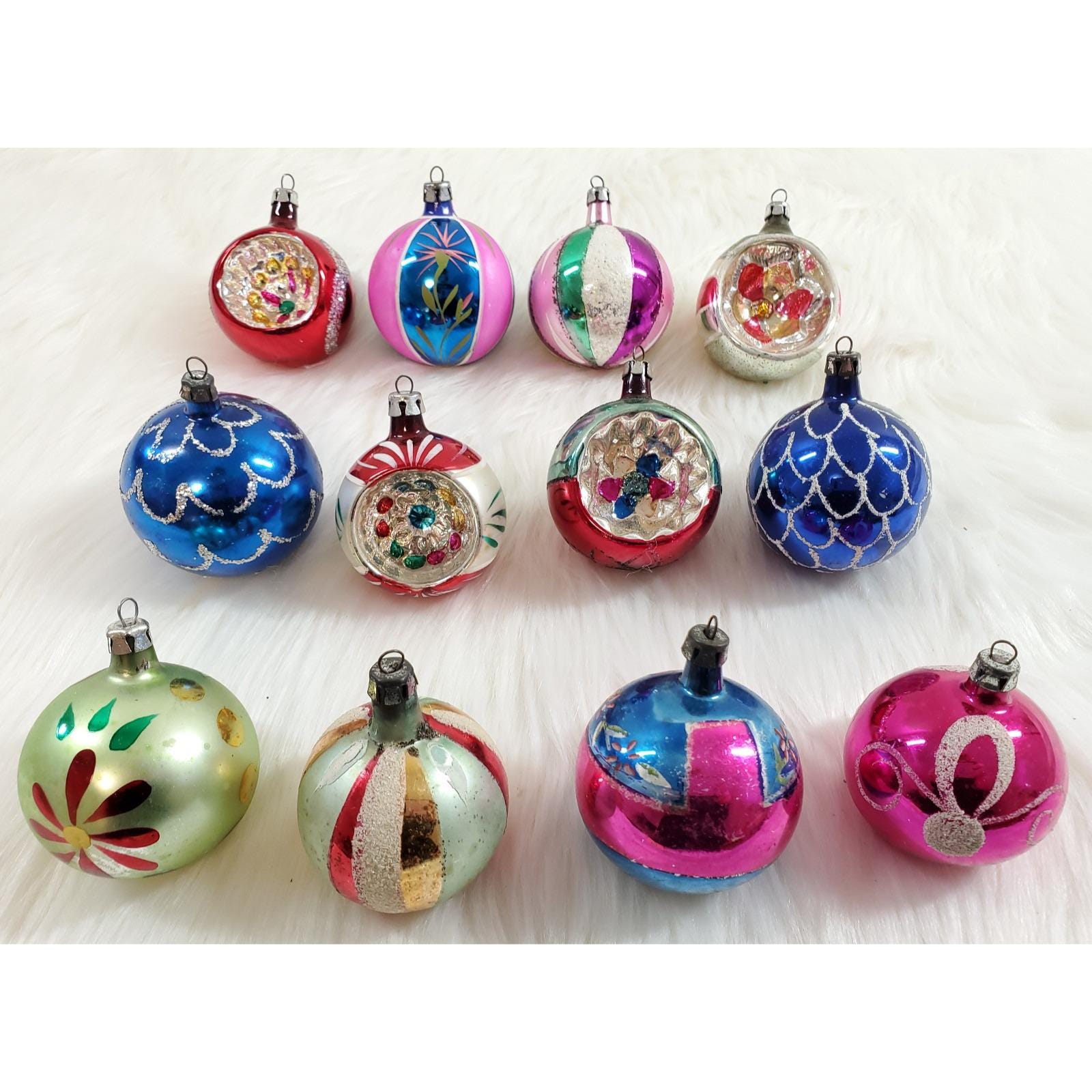 The set of twelve include a beautiful assortment of hand blown and painted ornaments ball ornaments. Overall in good condition with paint/mica loss from age. Please see all photos for exact condition. Box does not have a lid.