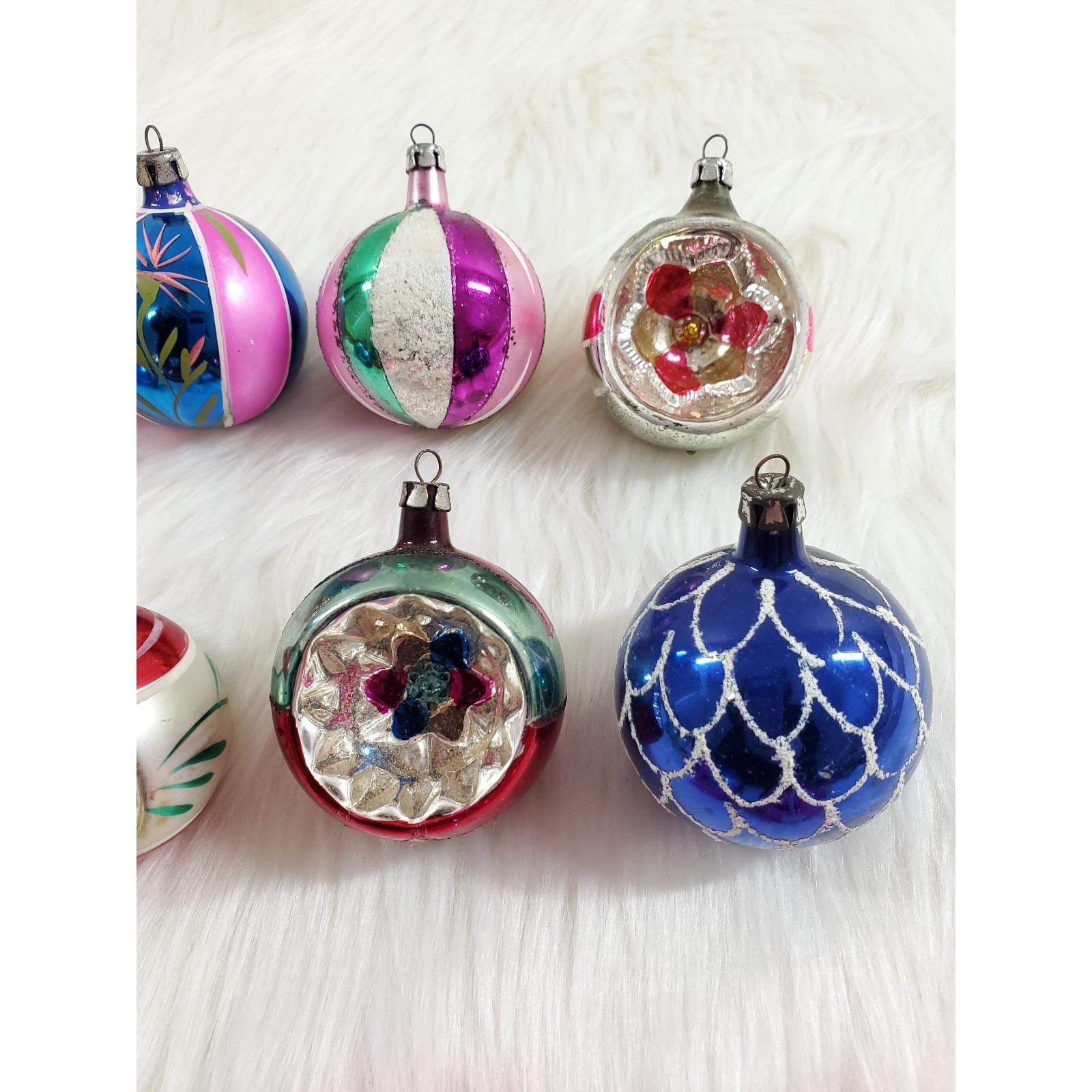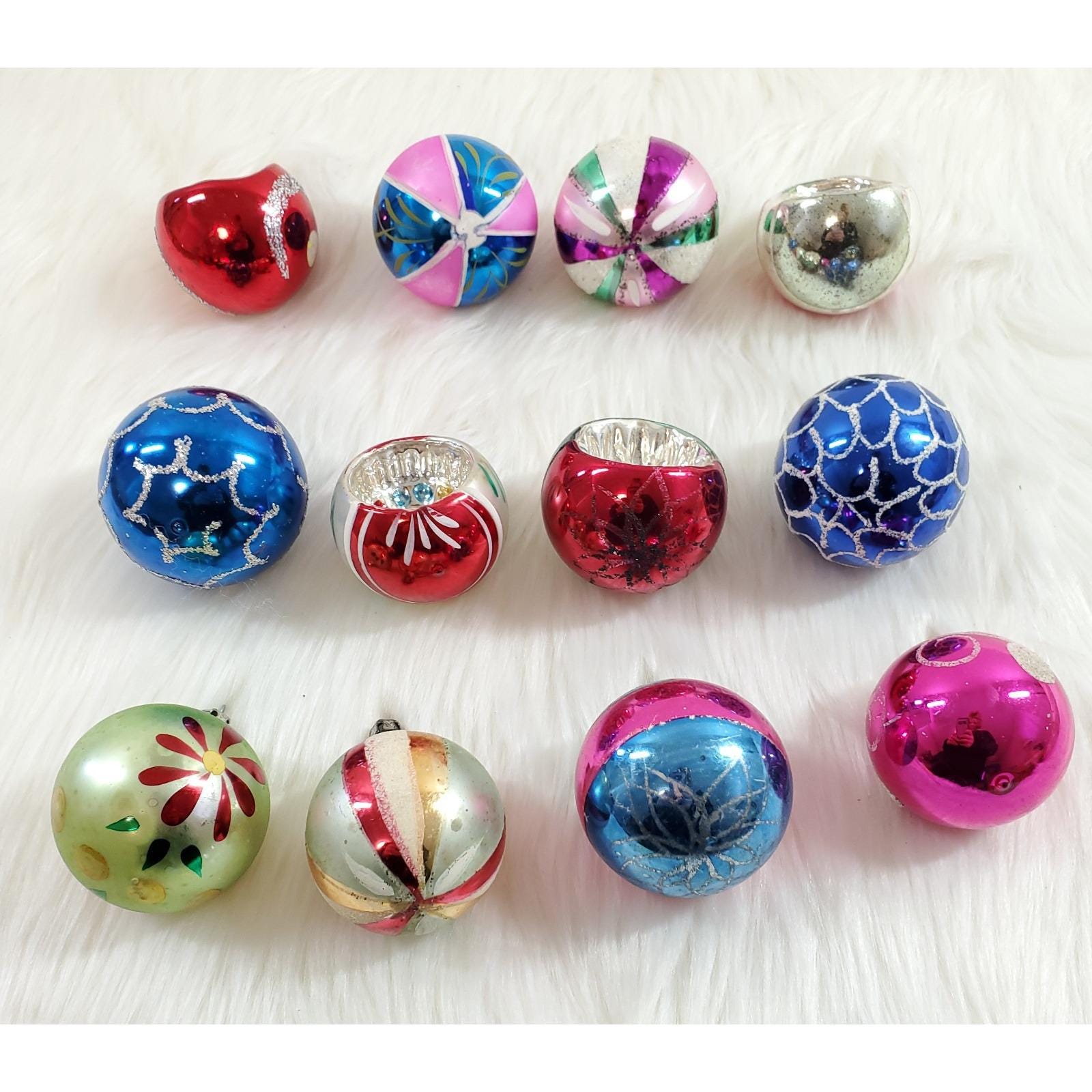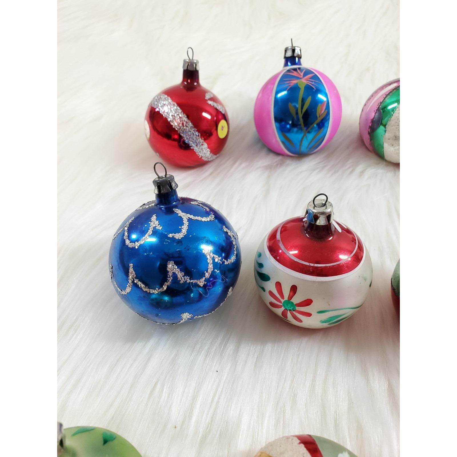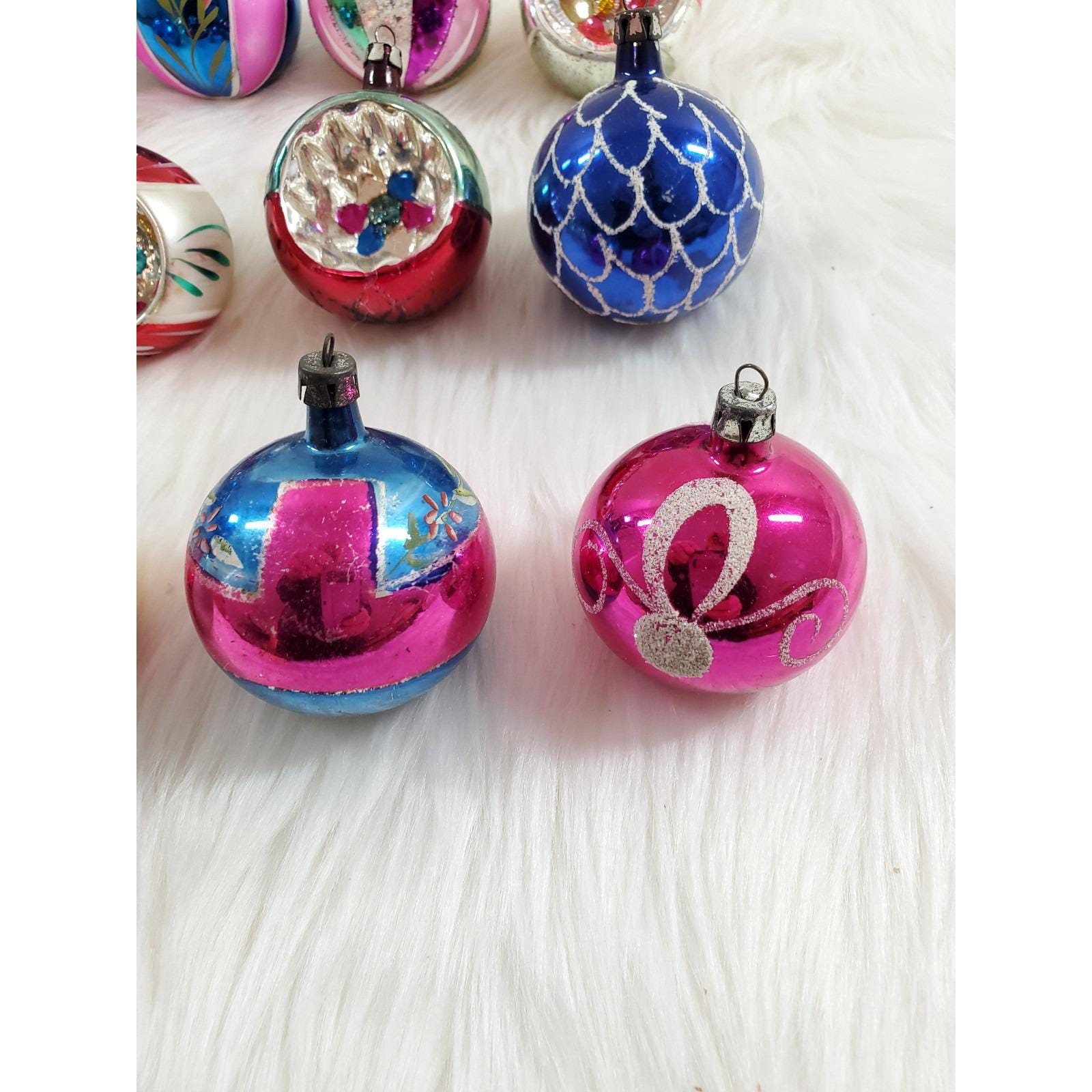 The set of twelve include a beautiful assortment of hand blown and painted ornaments ball ornaments. Overall in good condition with paint/mica loss from age. Please see all photos for exact condition. Box does not have a lid.