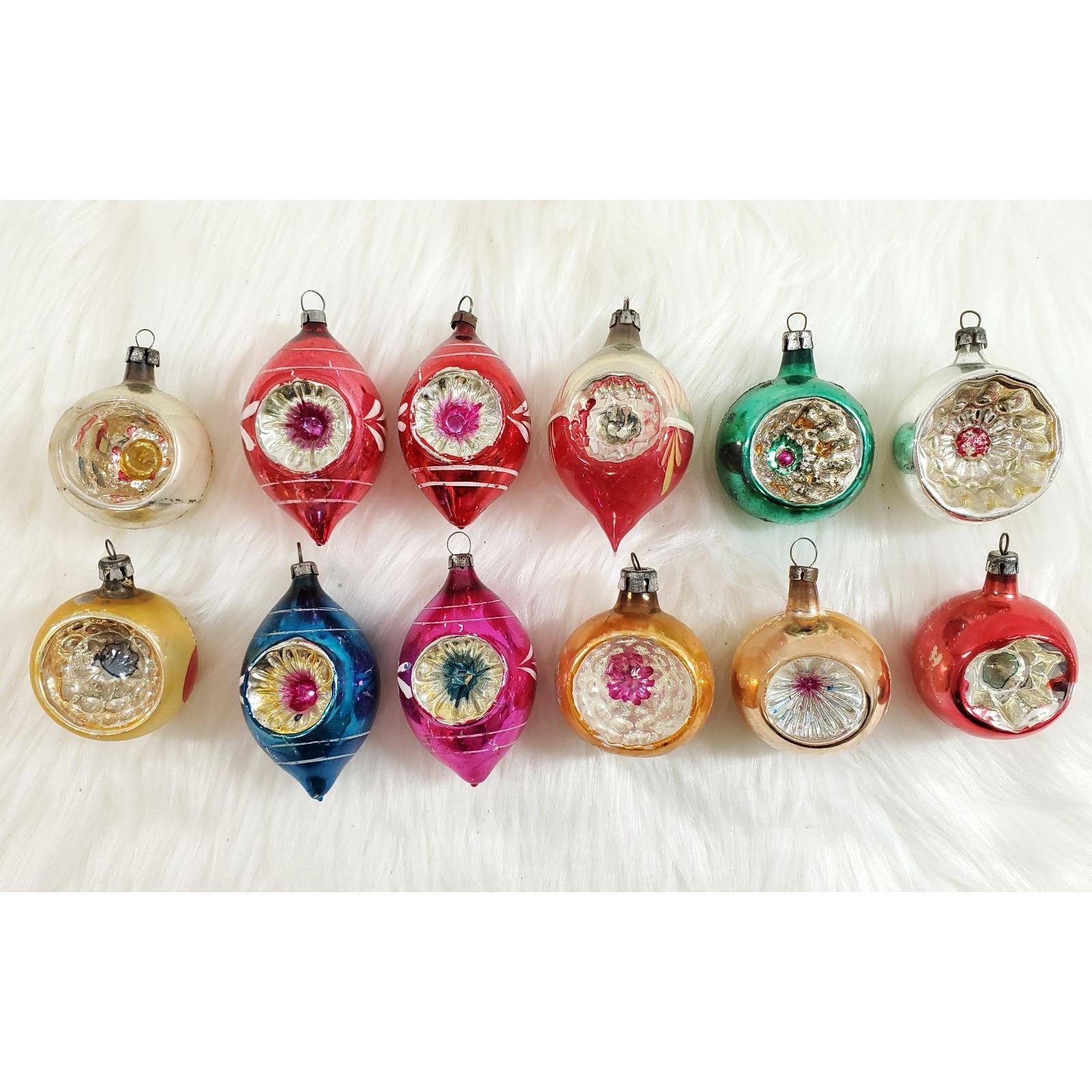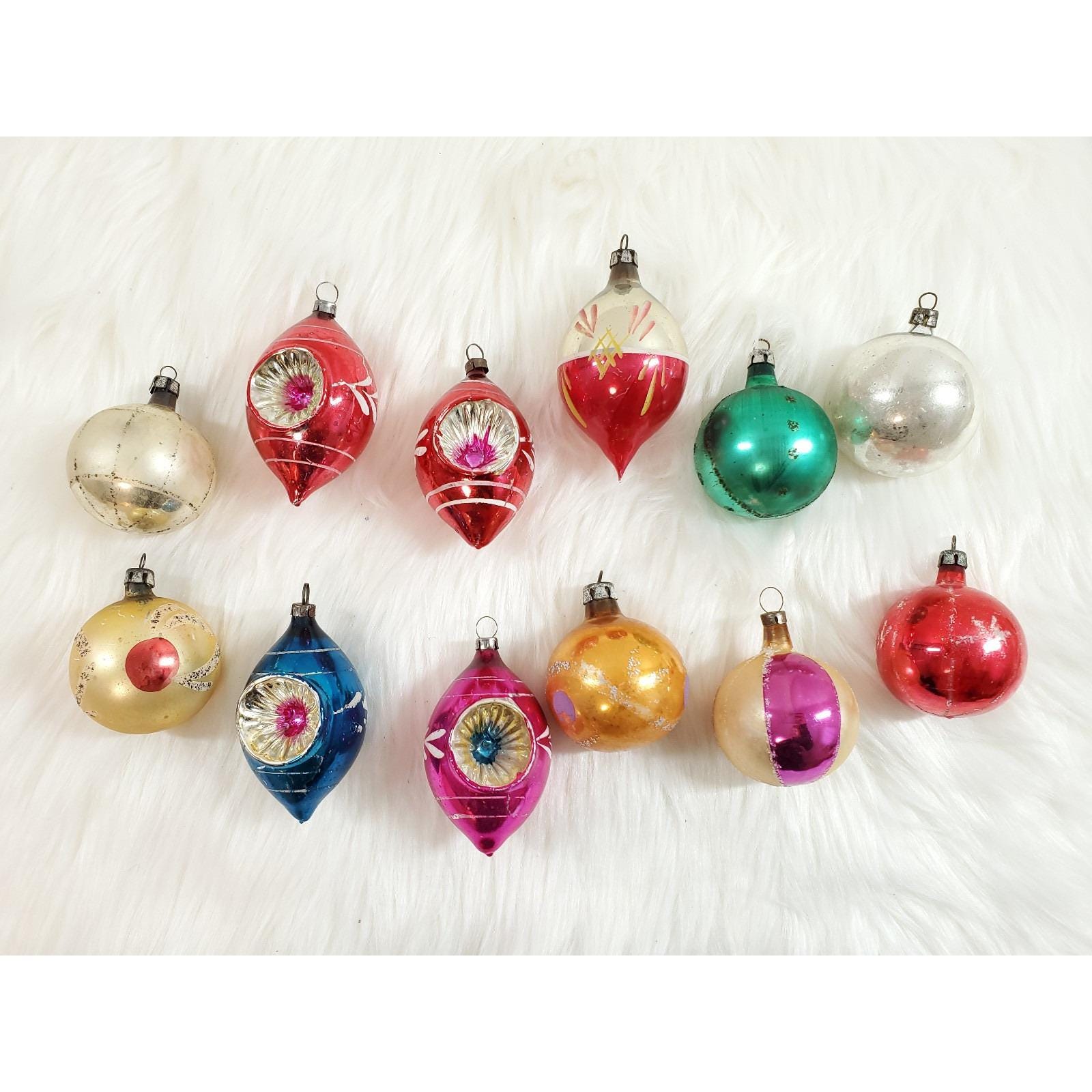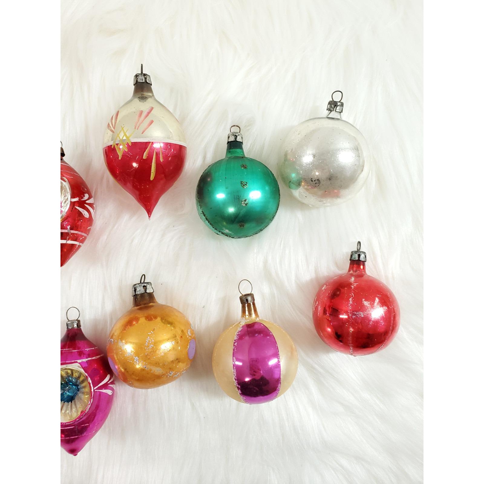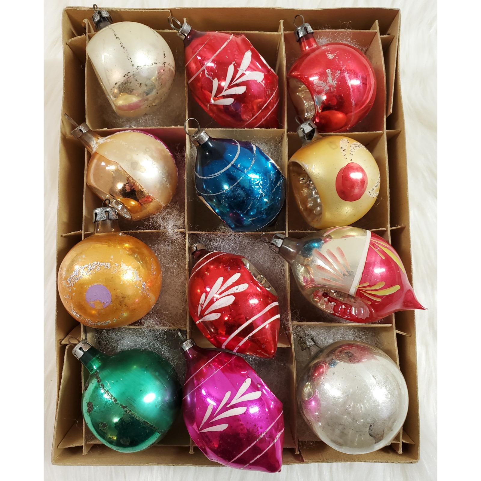 The set of twelve include a beautiful assortment of hand blown and painted ornaments ball ornaments. Overall in good condition with minor paint/mica loss from age. Two indents have small holes as shown. Please see all photos for exact condition.