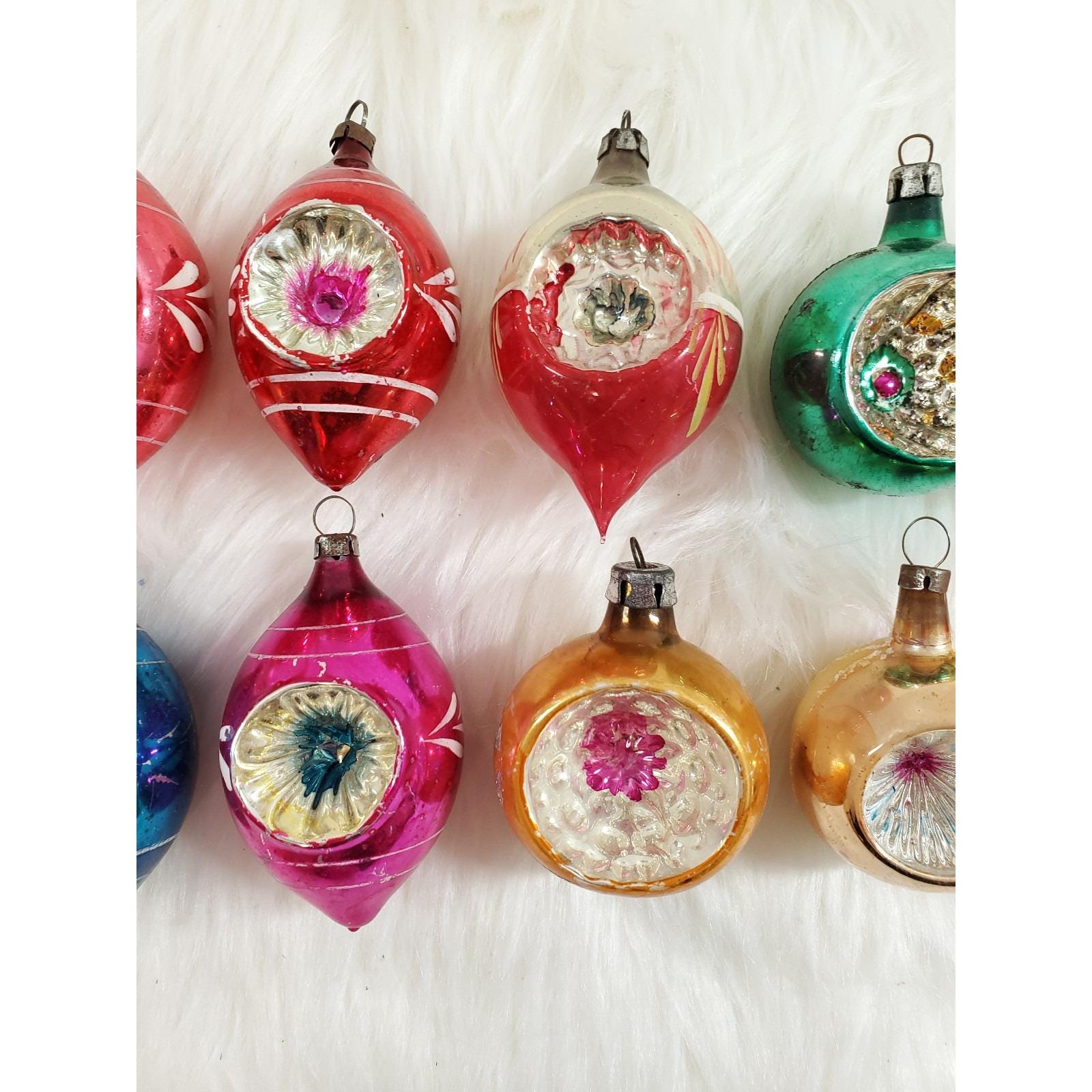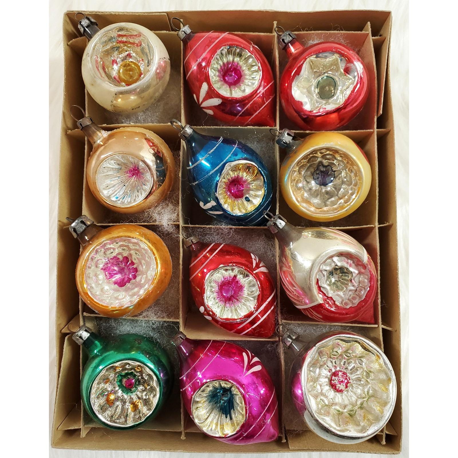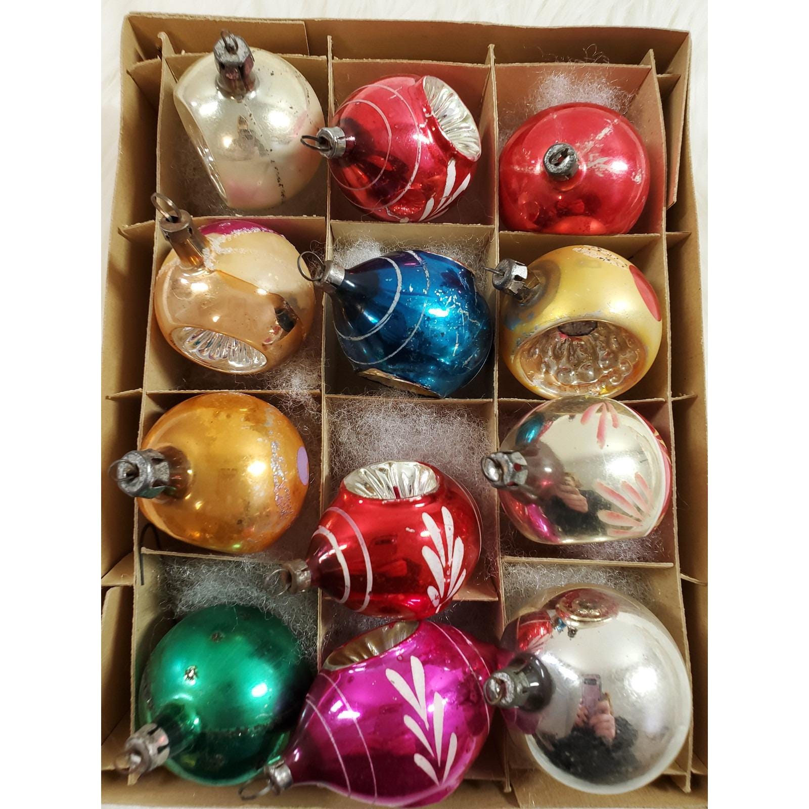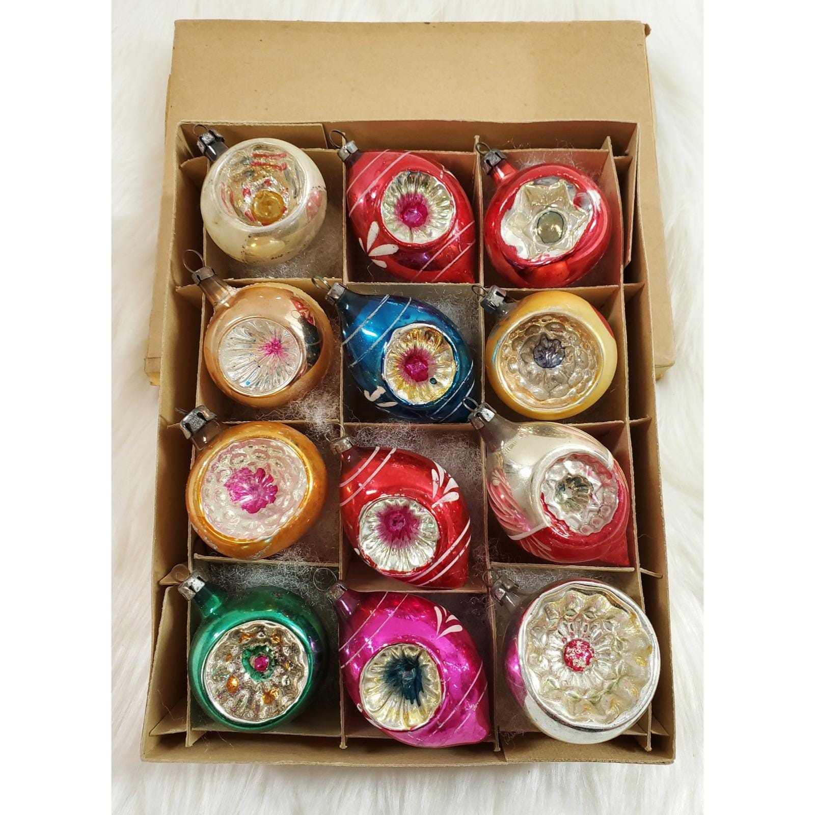The set of twelve include a beautiful assortment of hand blown and painted ornaments ball ornaments. Overall in good condition with minor paint/mica loss from age. Two indents have small holes as shown. Please see all photos for exact condition.