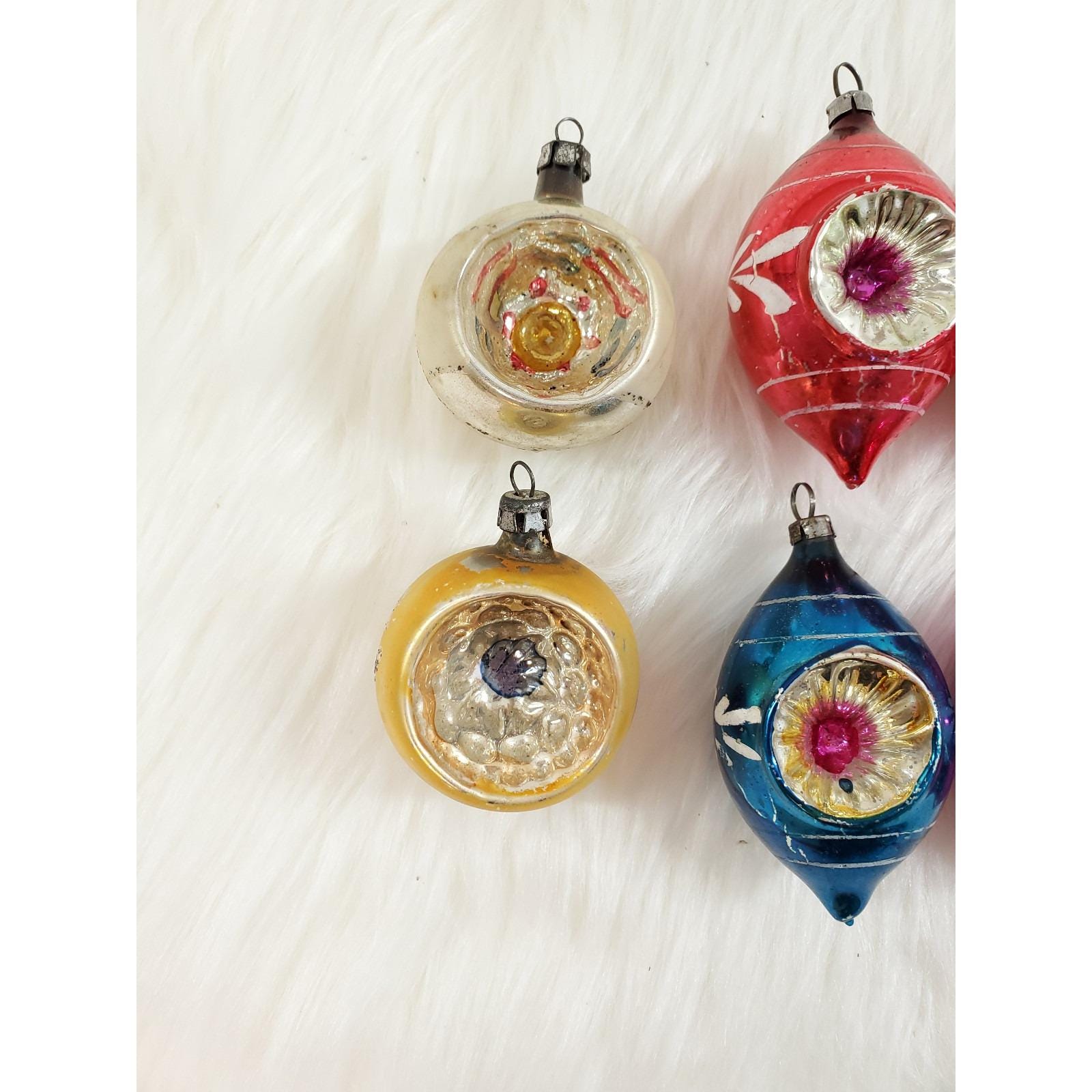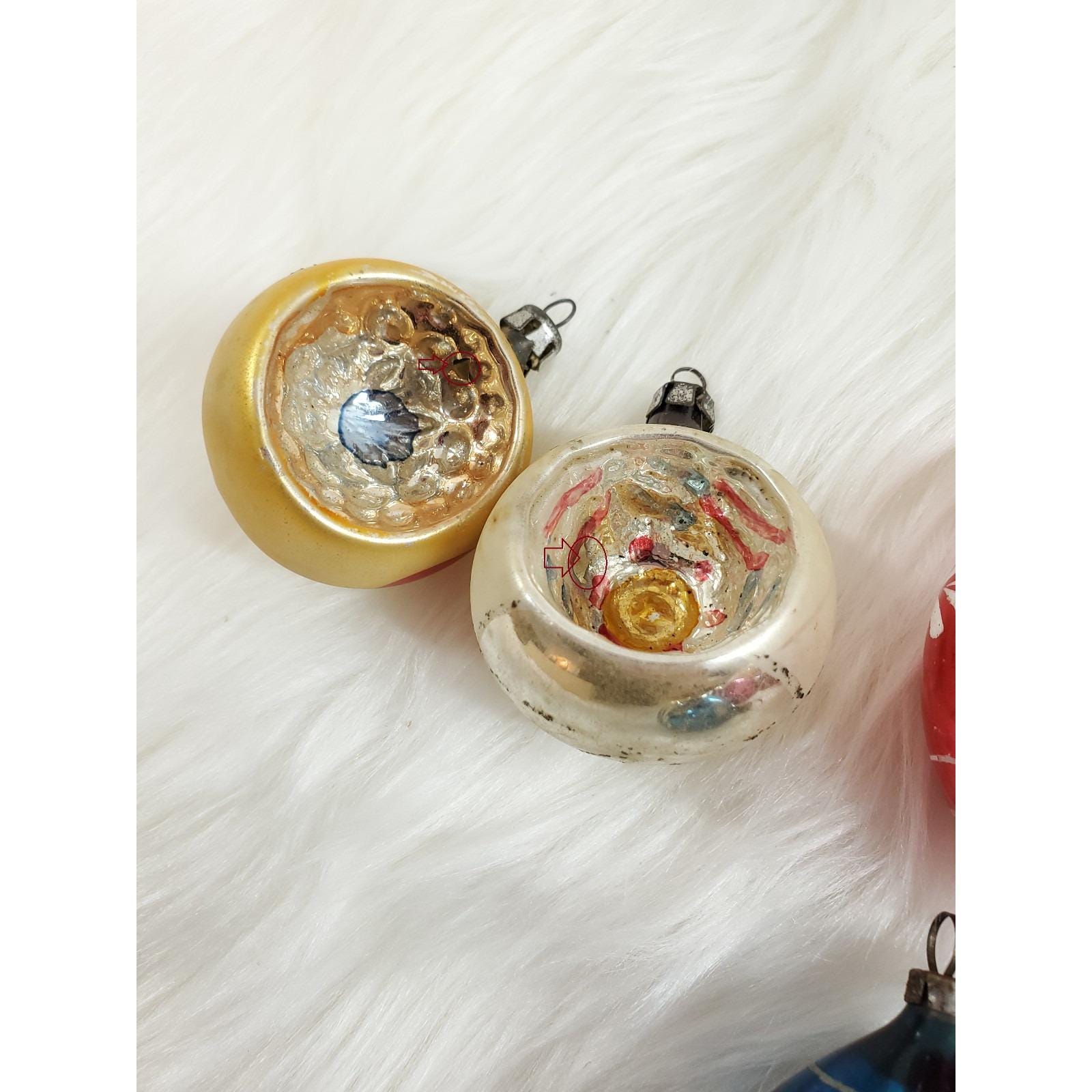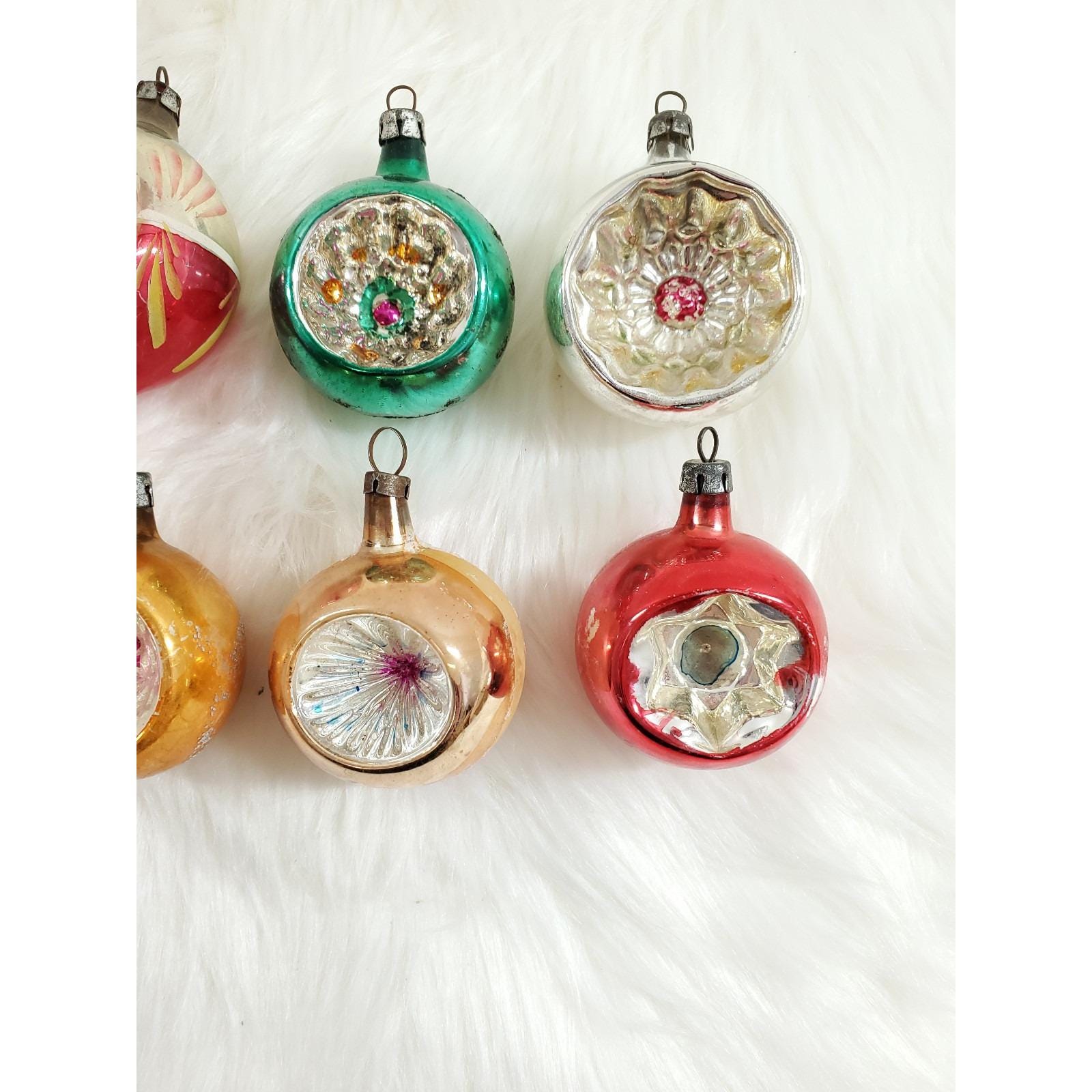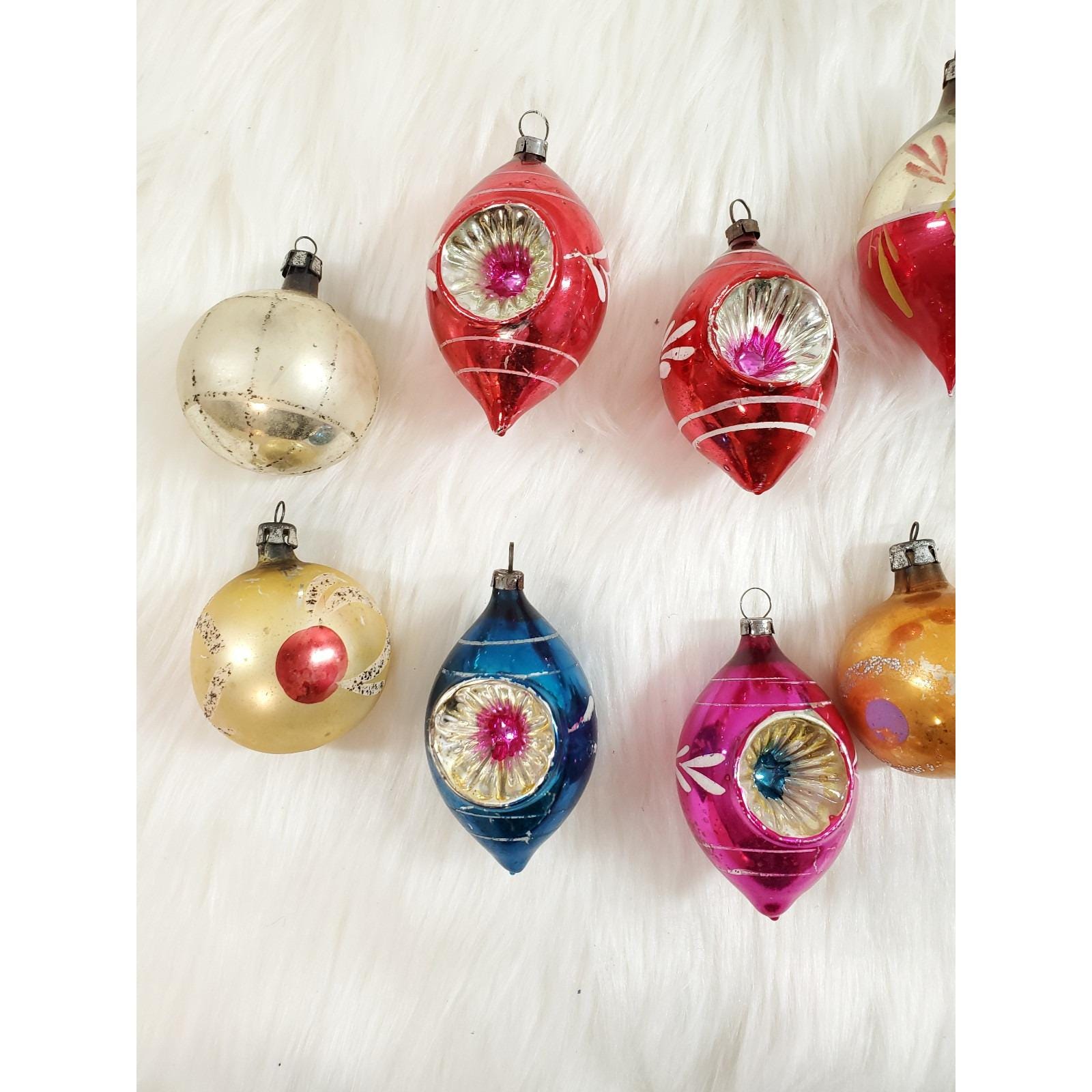 The set of twelve include a beautiful assortment of hand blown and painted ornaments ball ornaments. Overall in good condition with minor paint/mica loss from age. Two indents have small holes as shown. Please see all photos for exact condition.