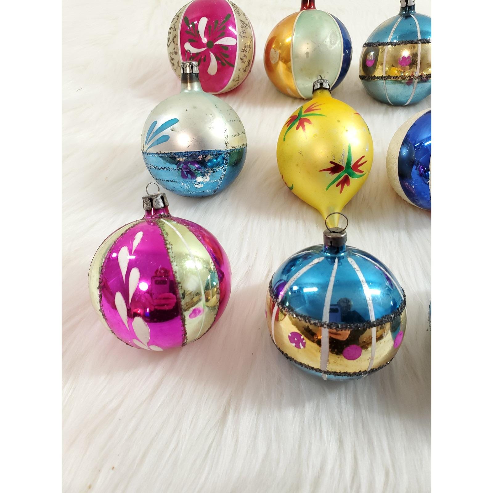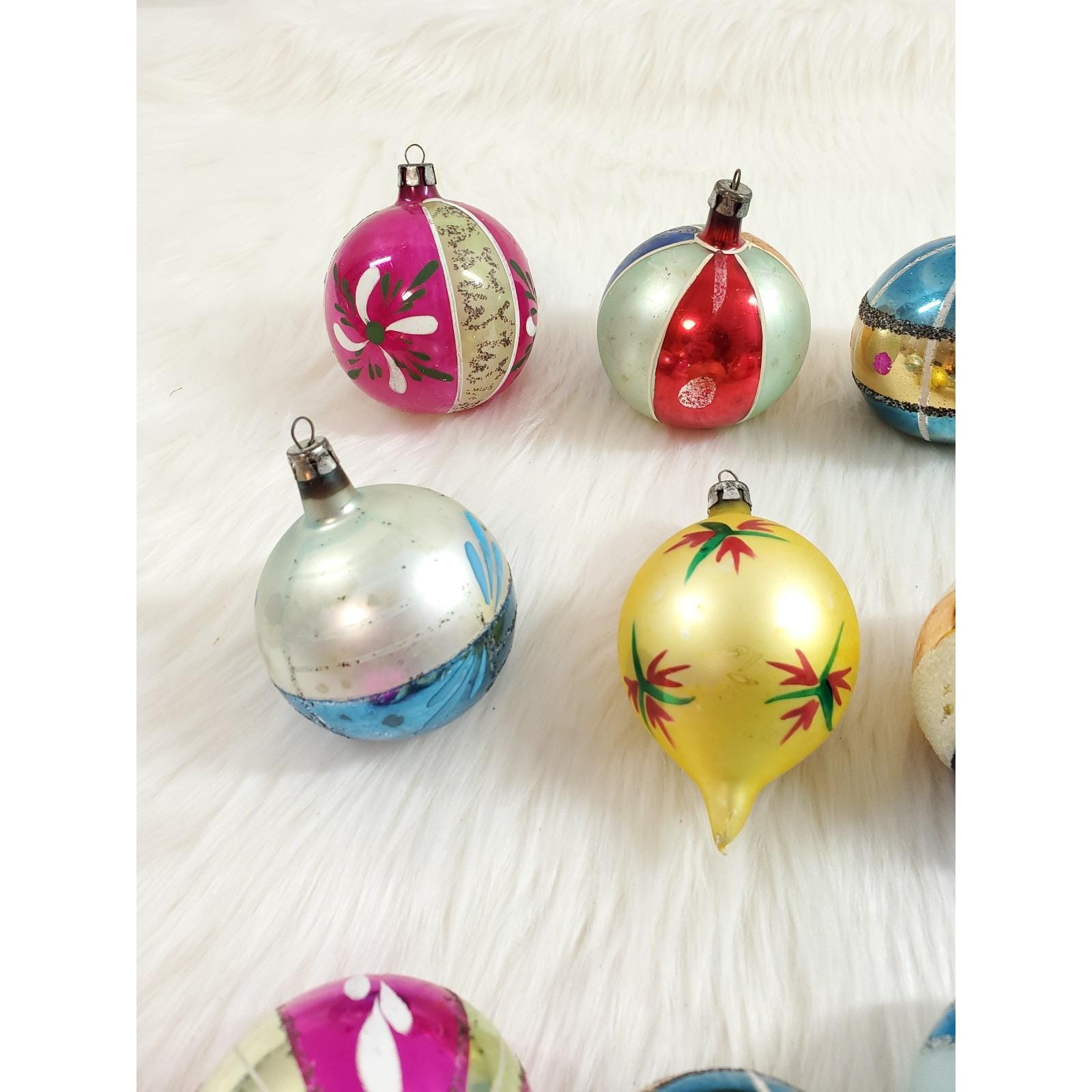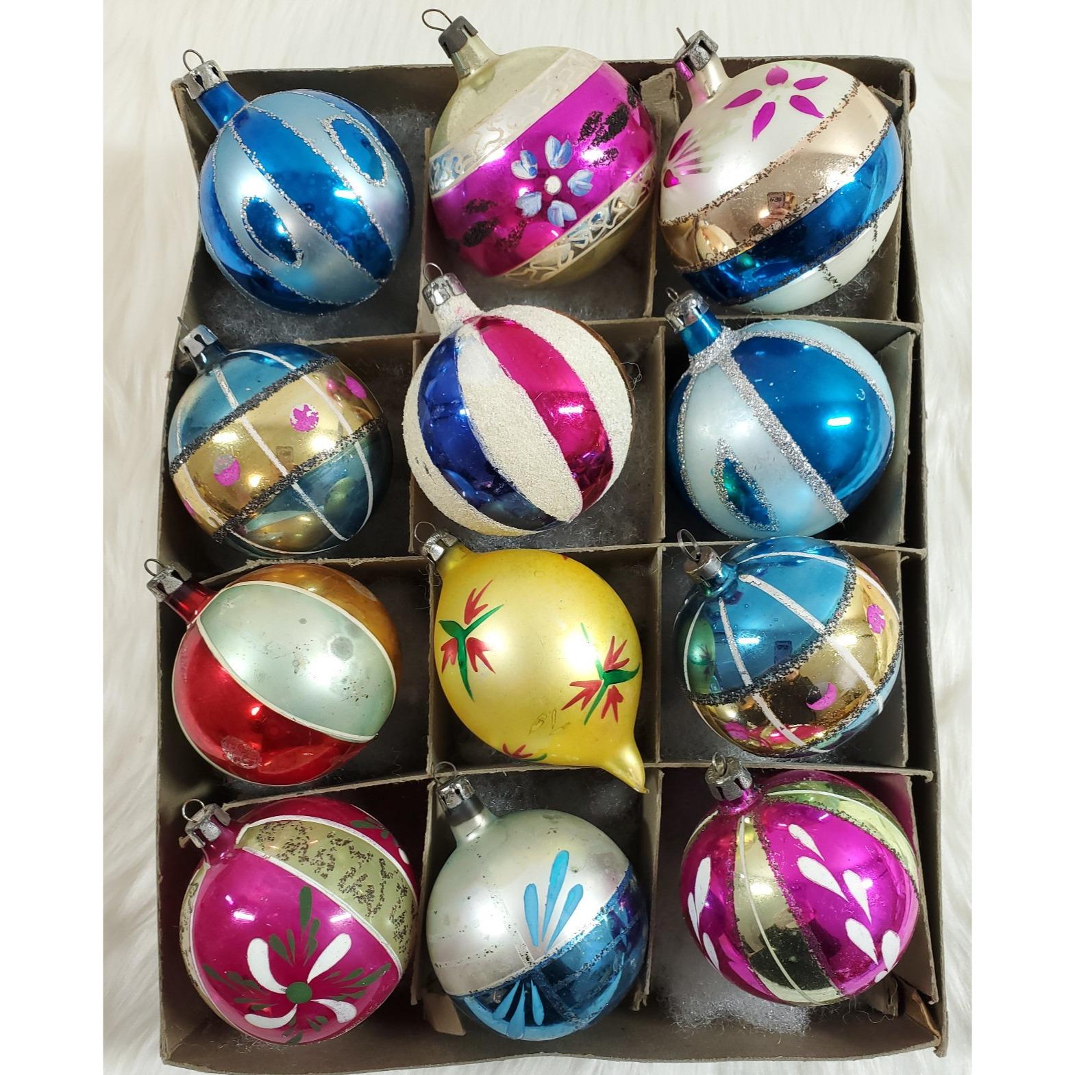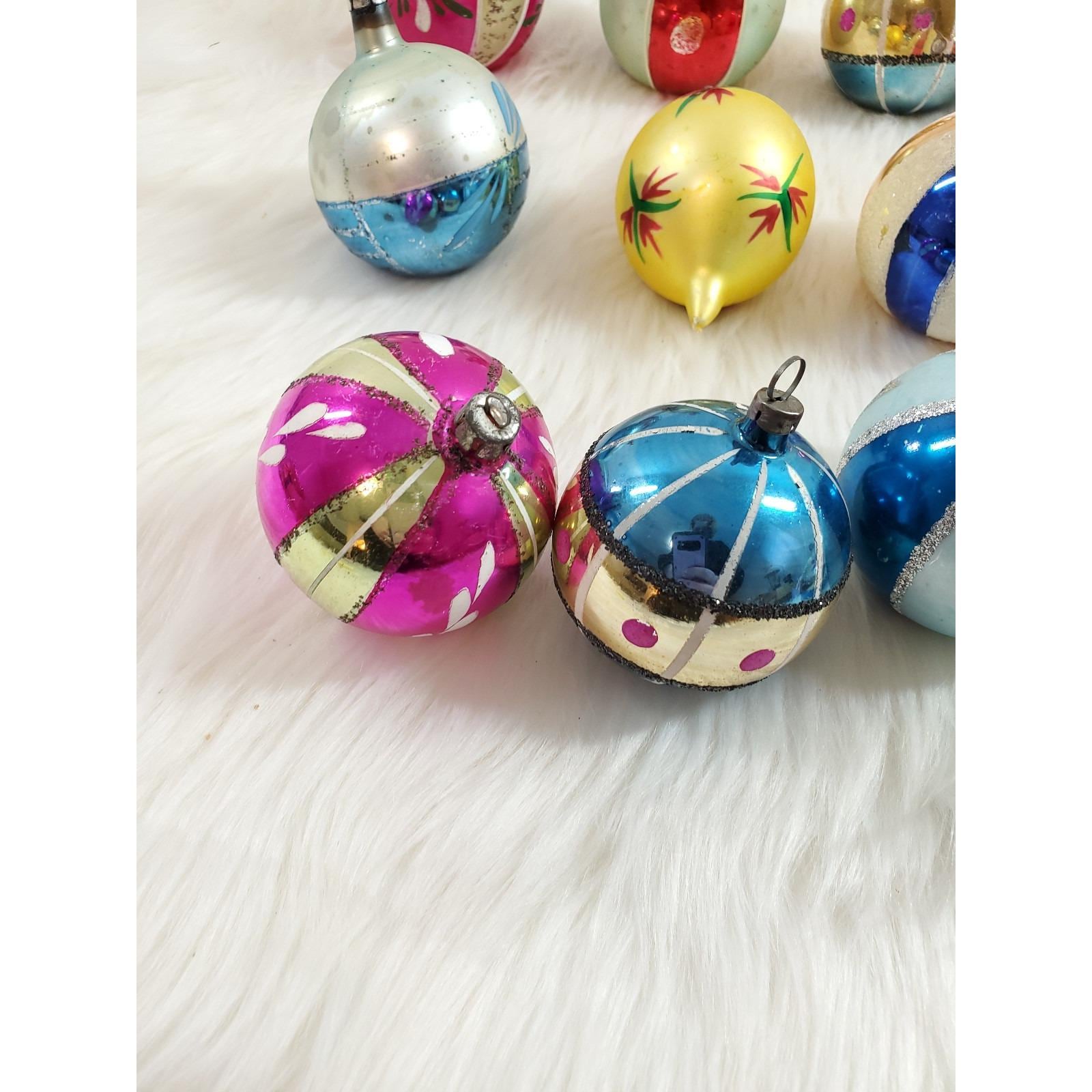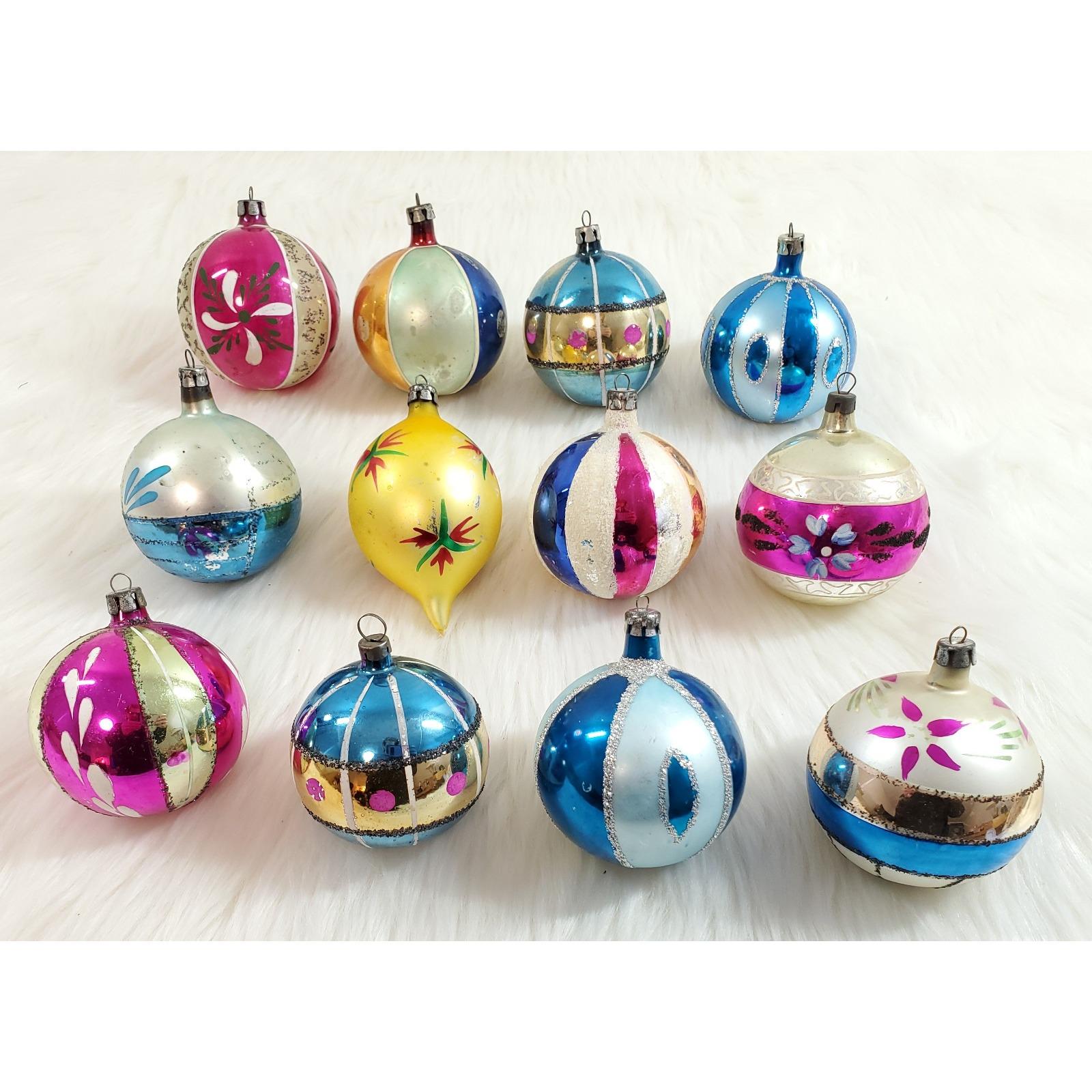 The set of twelve include a beautiful assortment of hand blown and painted ornaments. Overall in good condition with paint/mica loss from age. Please see all photos for exact condition.