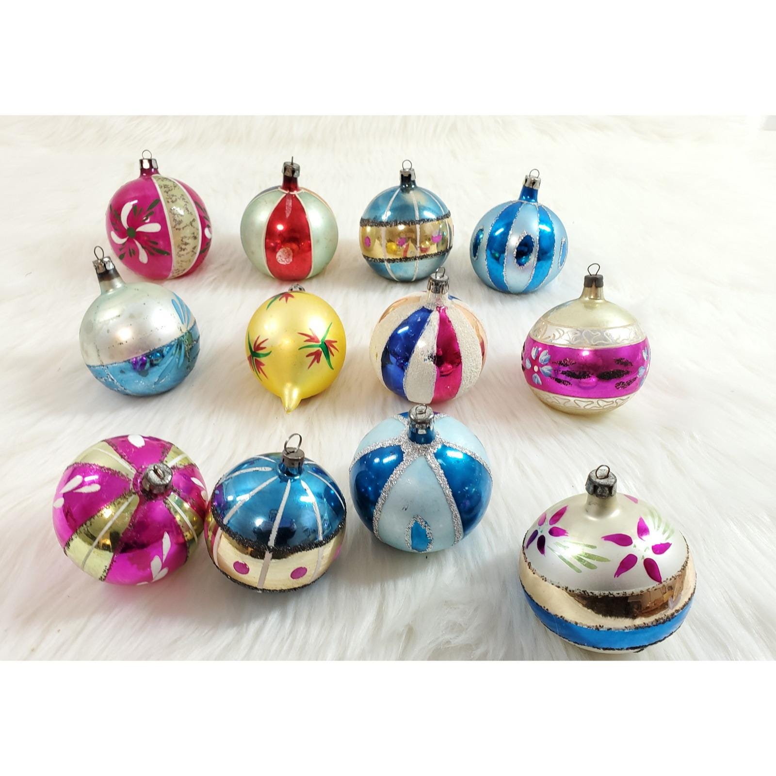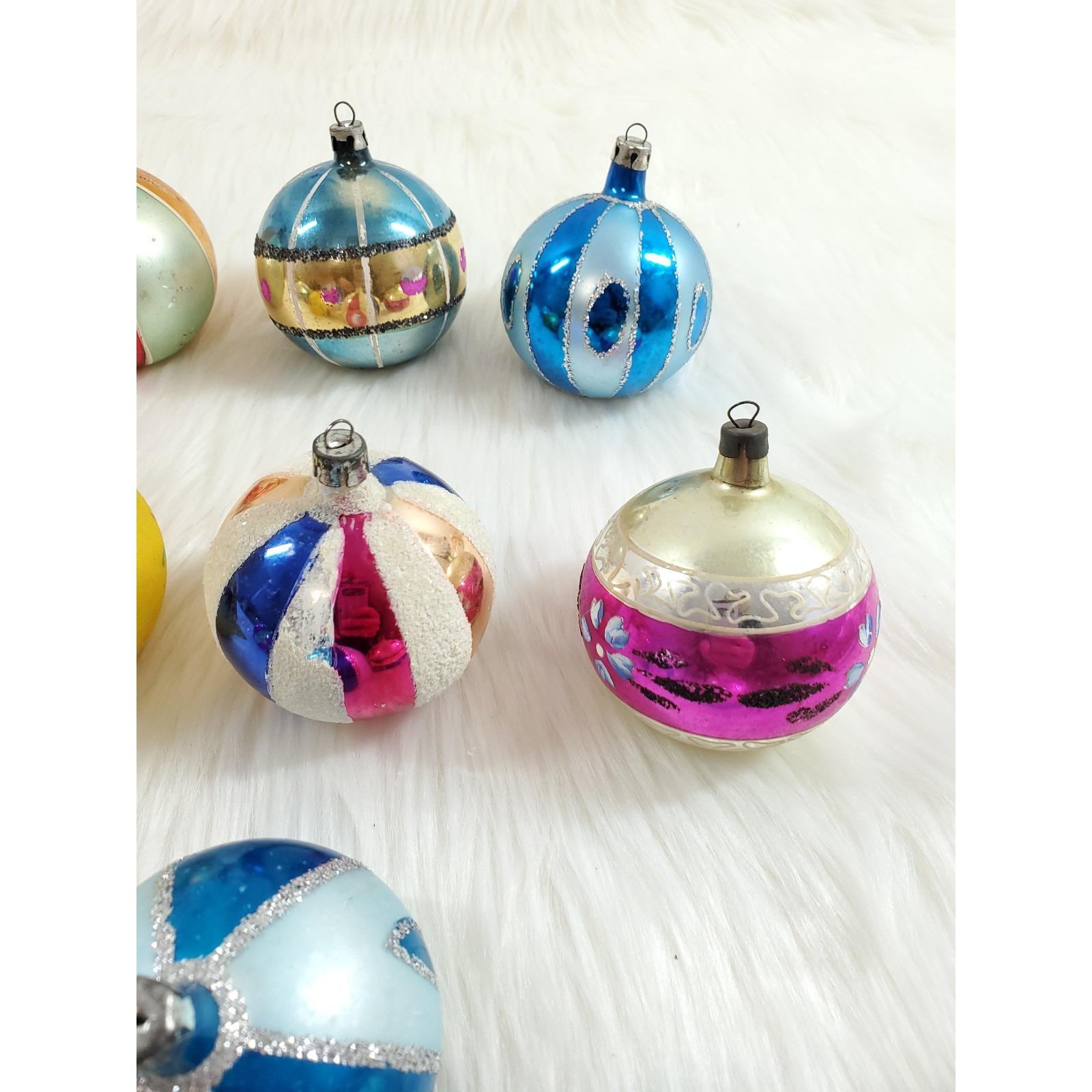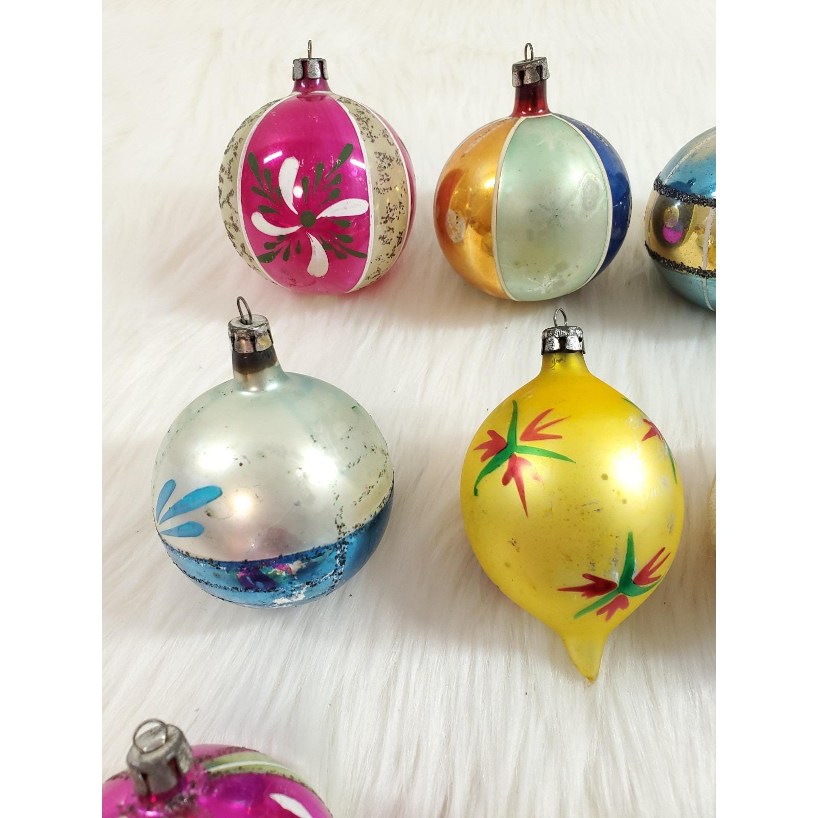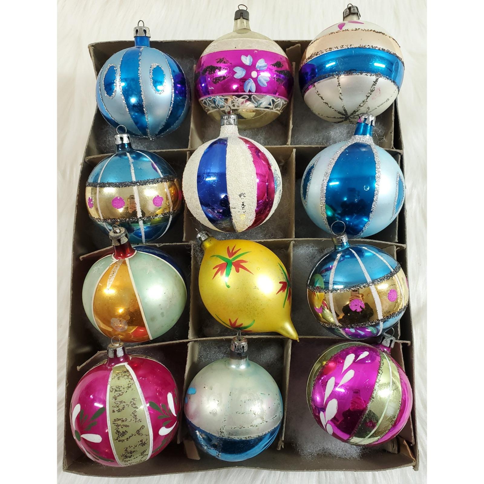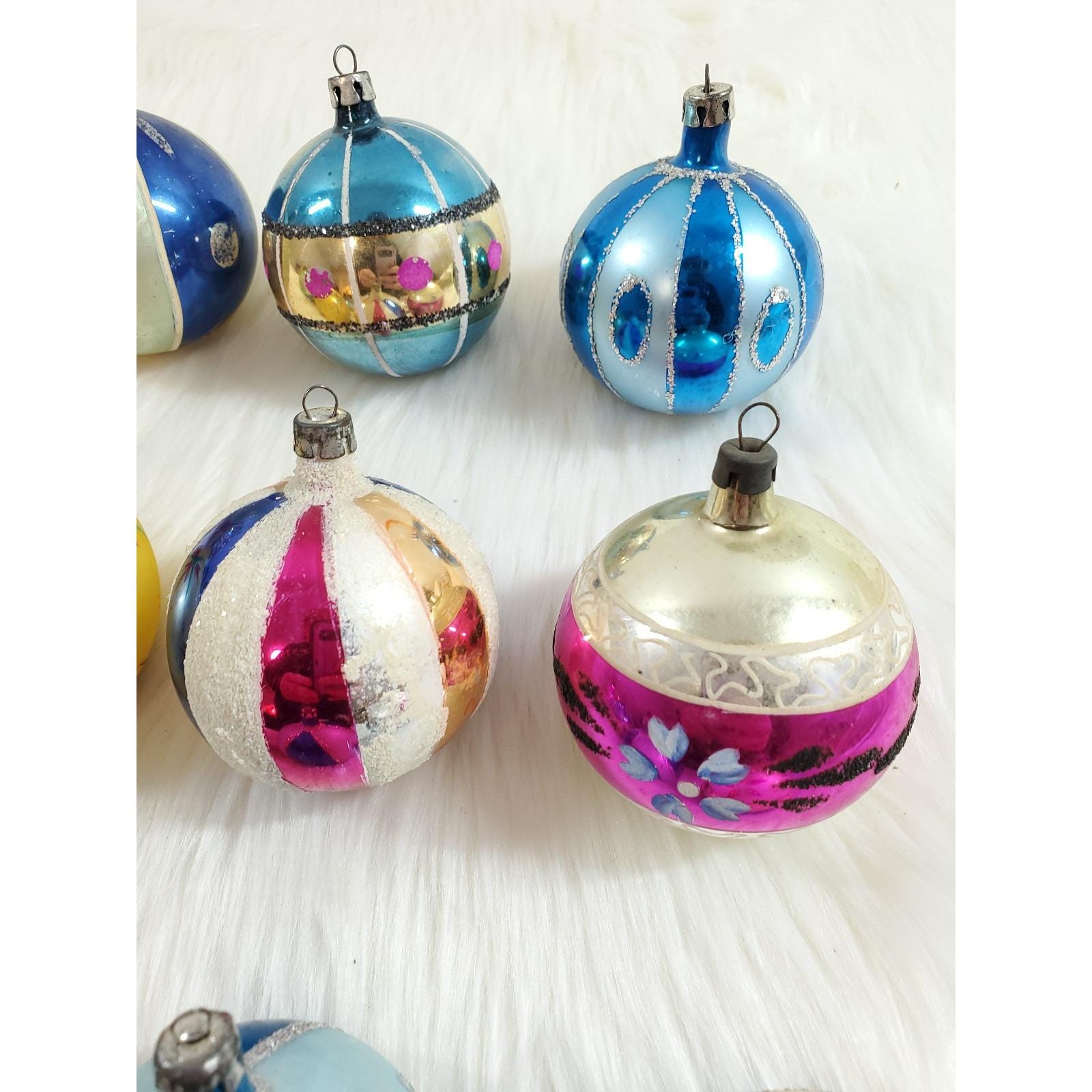 The set of twelve include a beautiful assortment of hand blown and painted ornaments. Overall in good condition with paint/mica loss from age. Please see all photos for exact condition.
