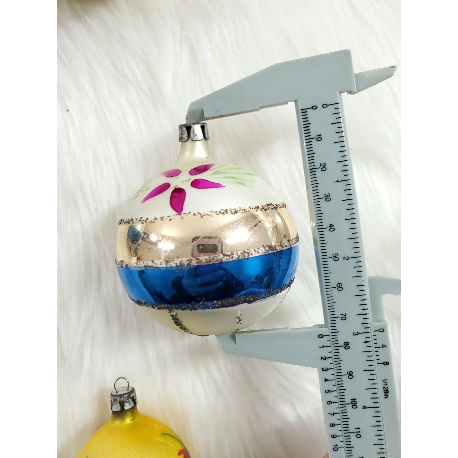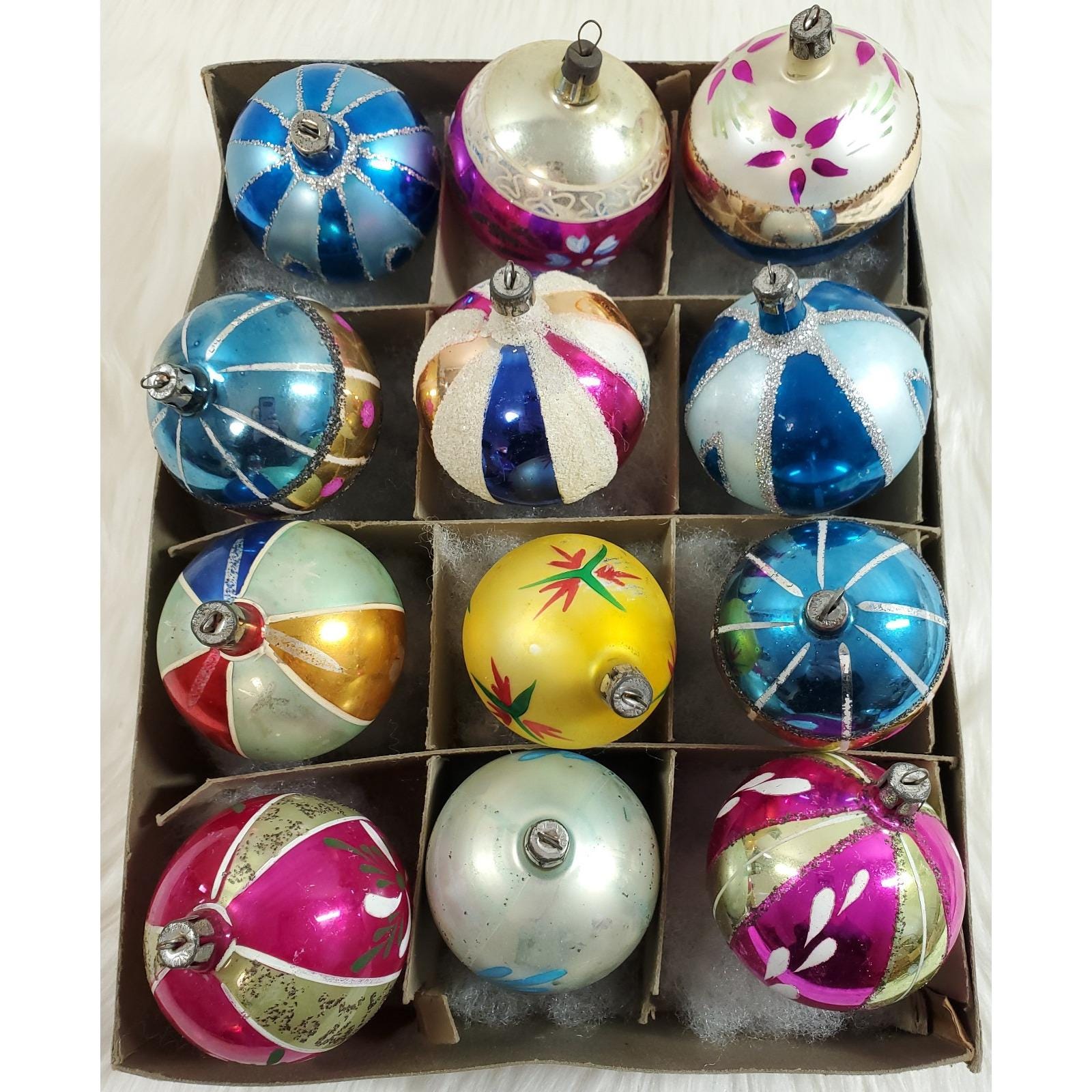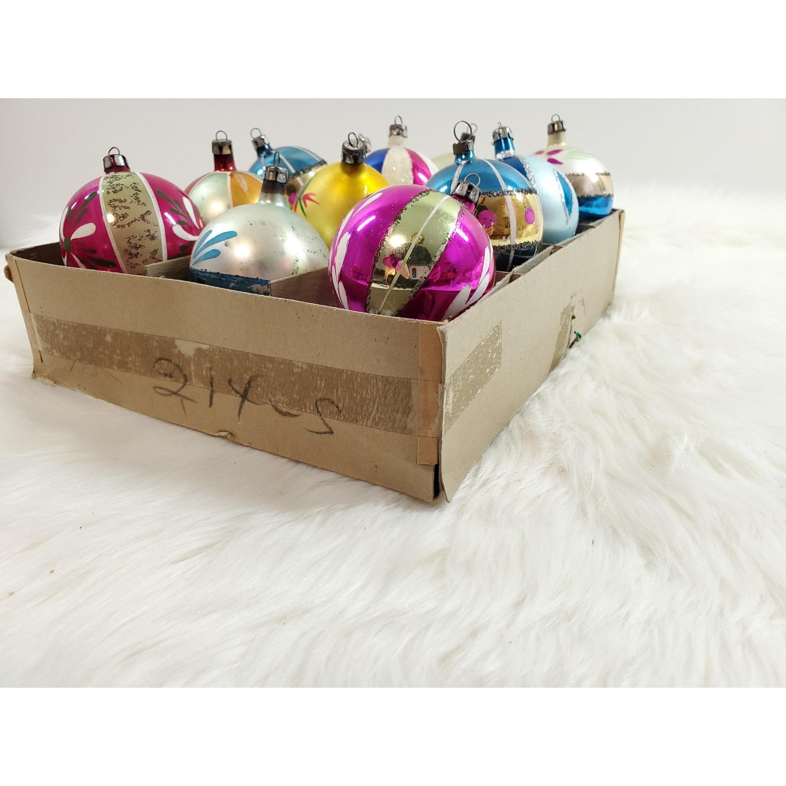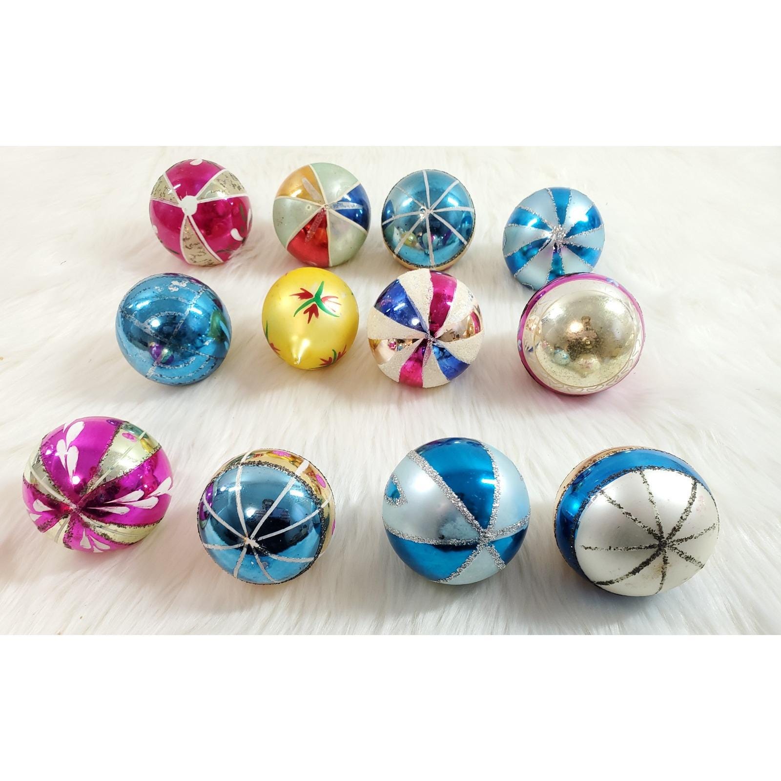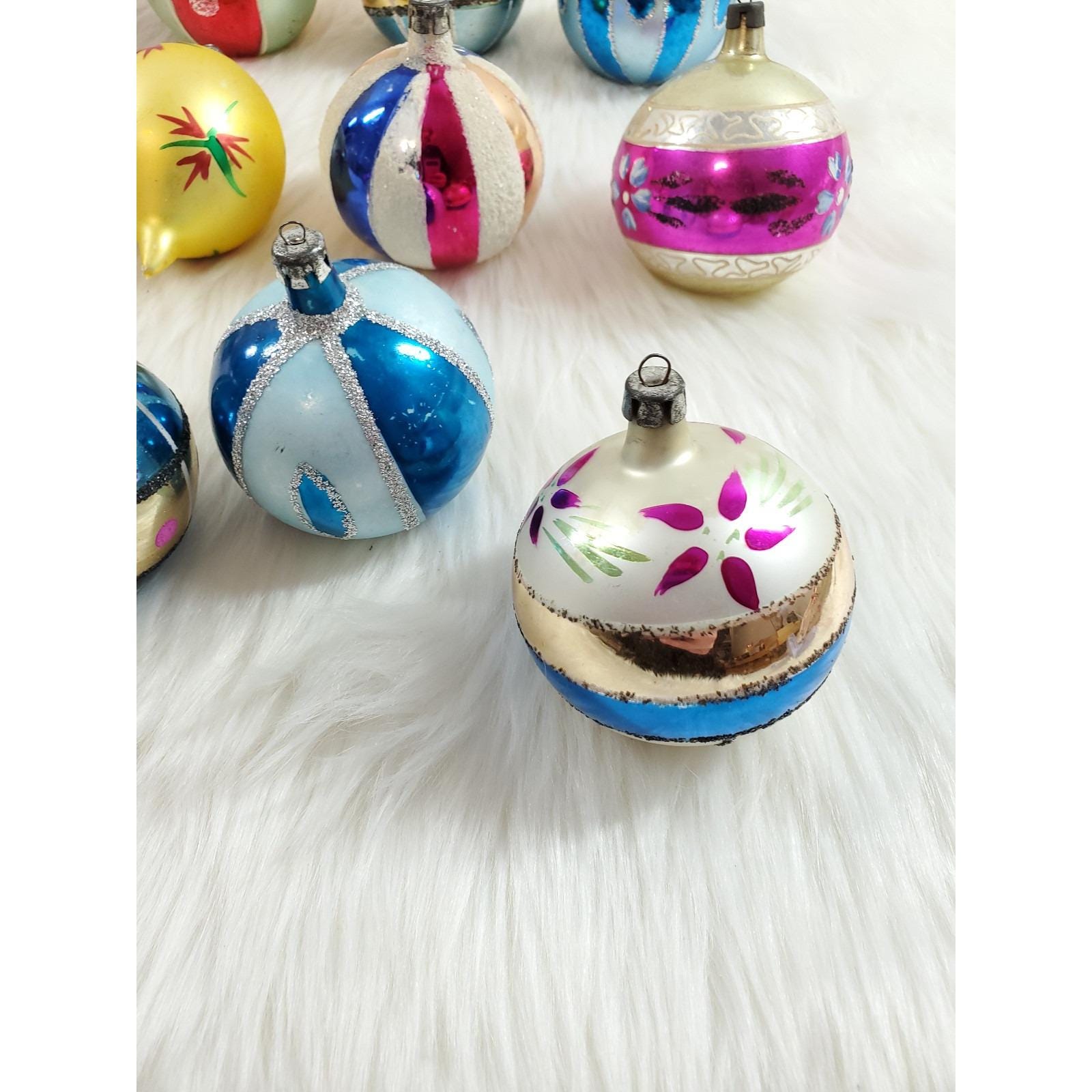 The set of twelve include a beautiful assortment of hand blown and painted ornaments. Overall in good condition with paint/mica loss from age. Please see all photos for exact condition.