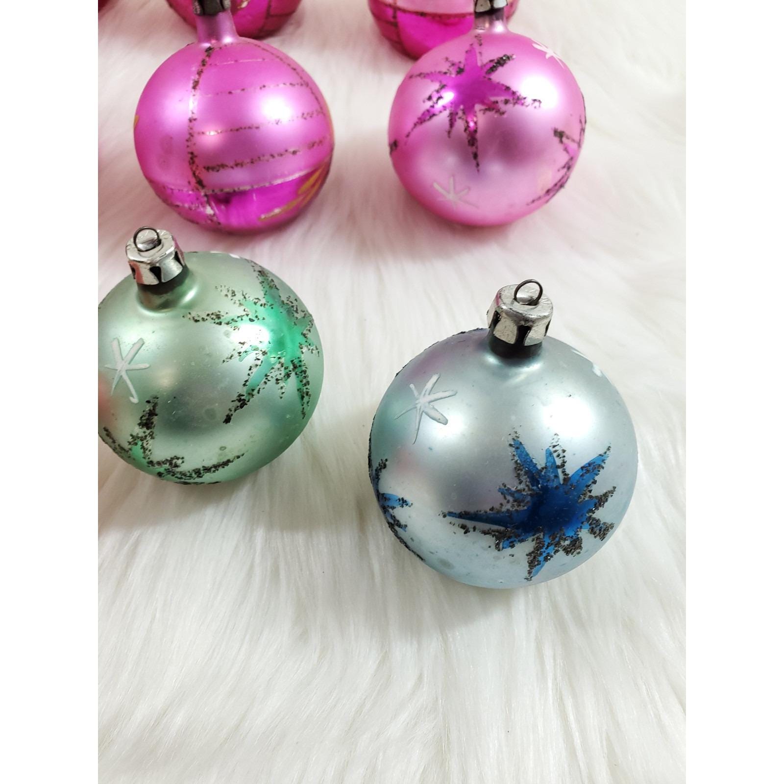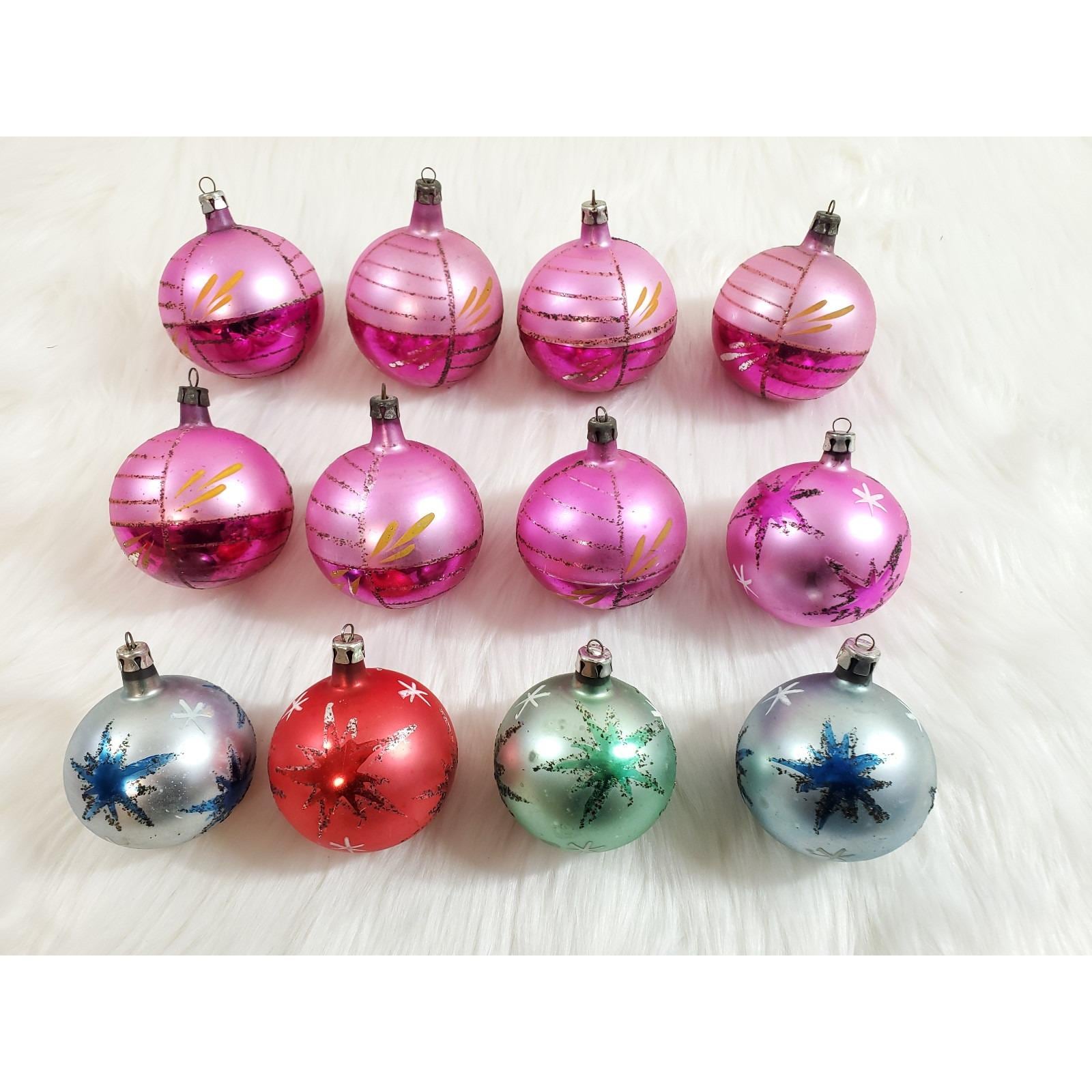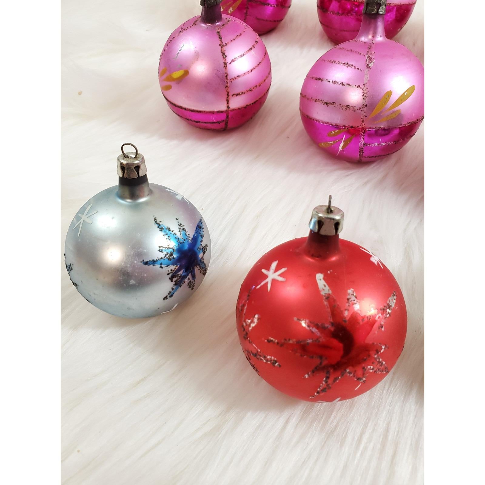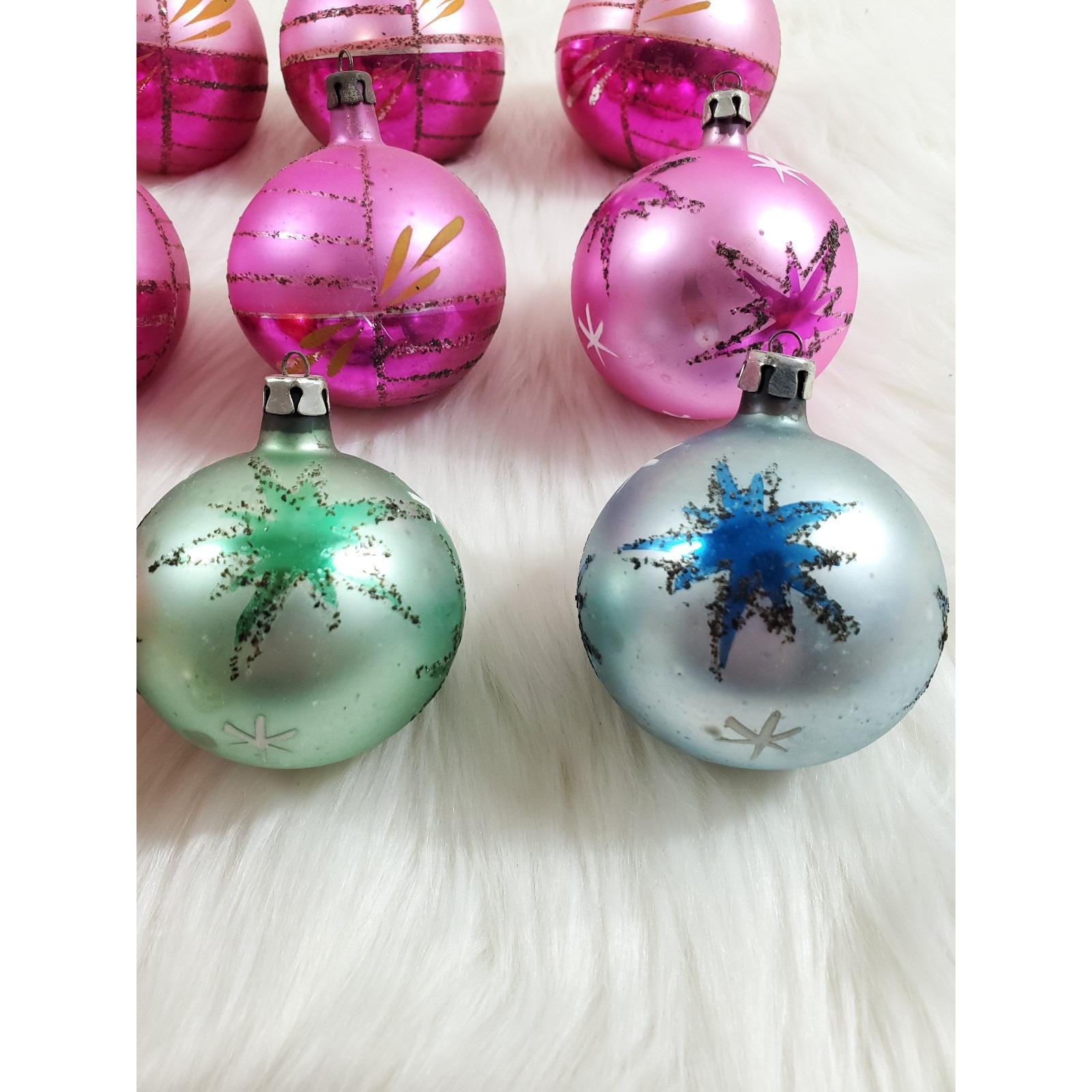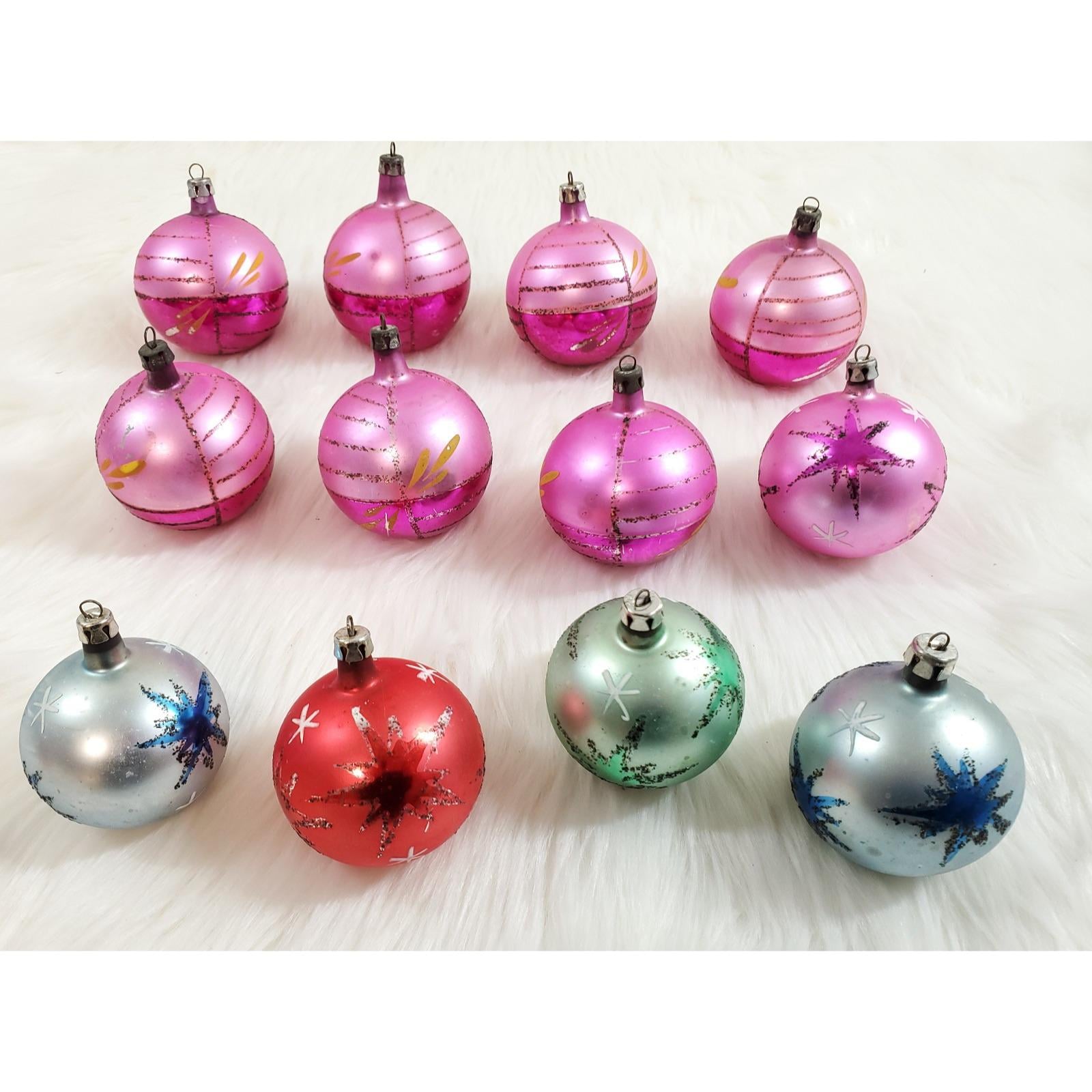 The set of twelve include a beautiful assortment of hand blown and painted ornaments. Overall in good condition with paint/mica loss from age. Please see all photos for exact condition.