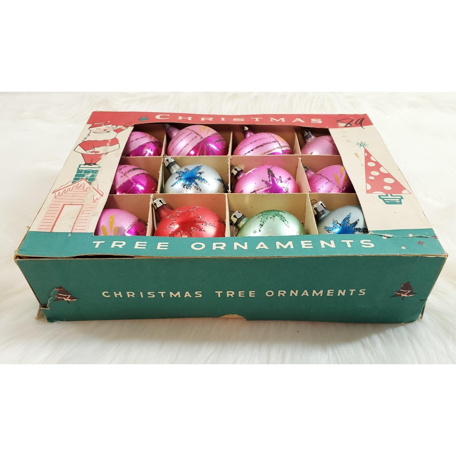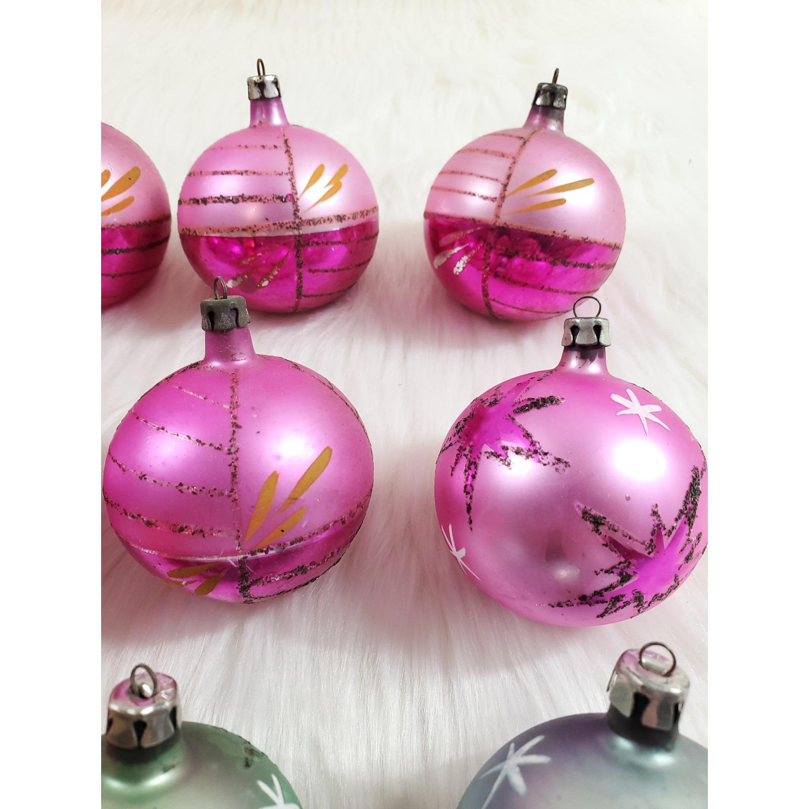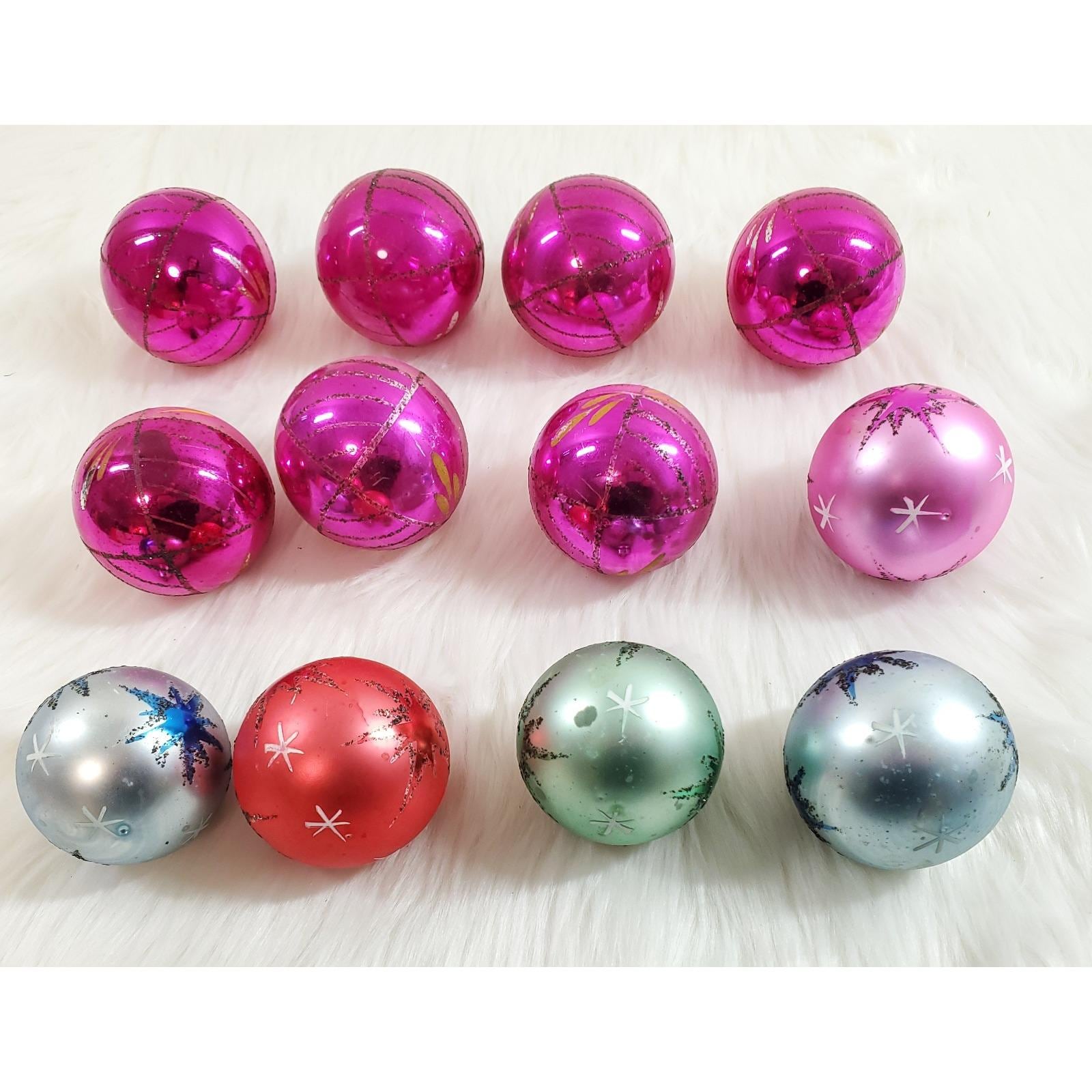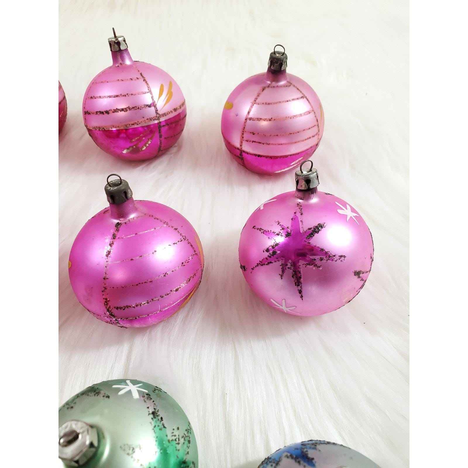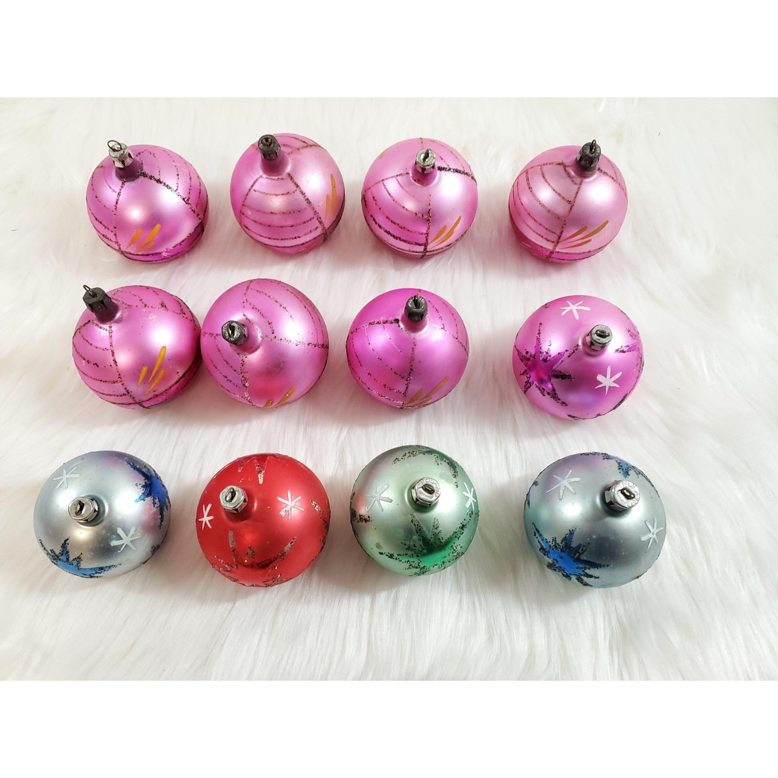 The set of twelve include a beautiful assortment of hand blown and painted ornaments. Overall in good condition with paint/mica loss from age. Please see all photos for exact condition.