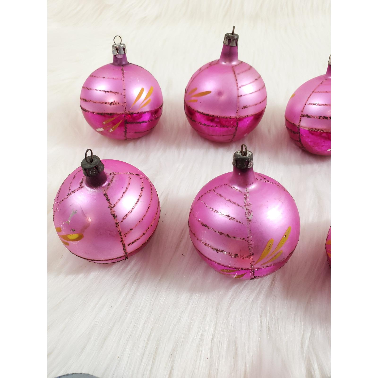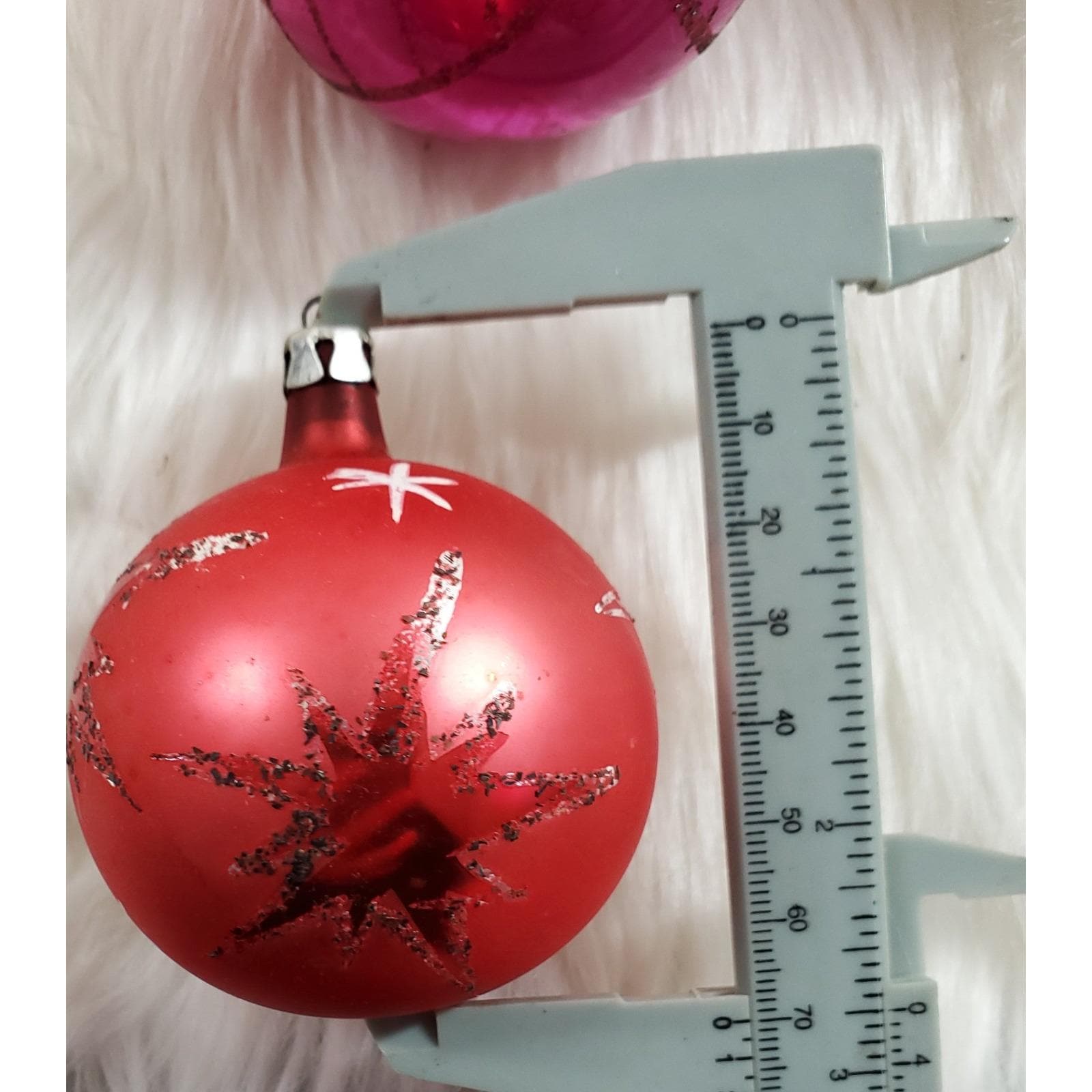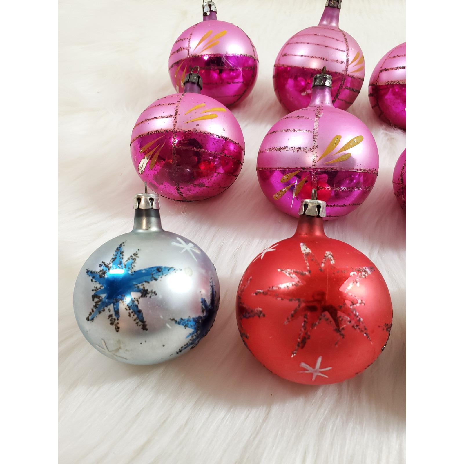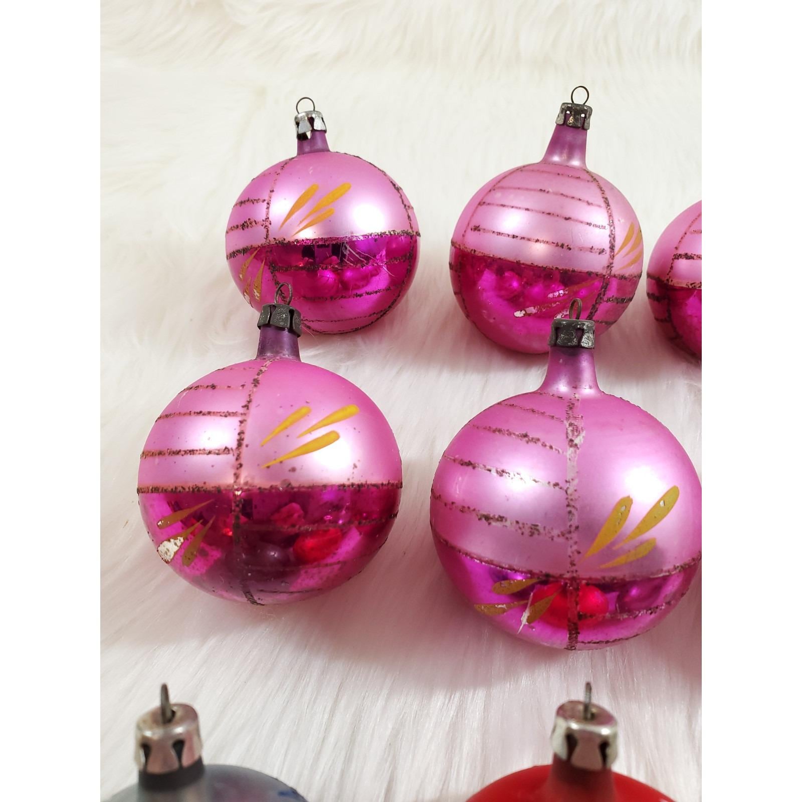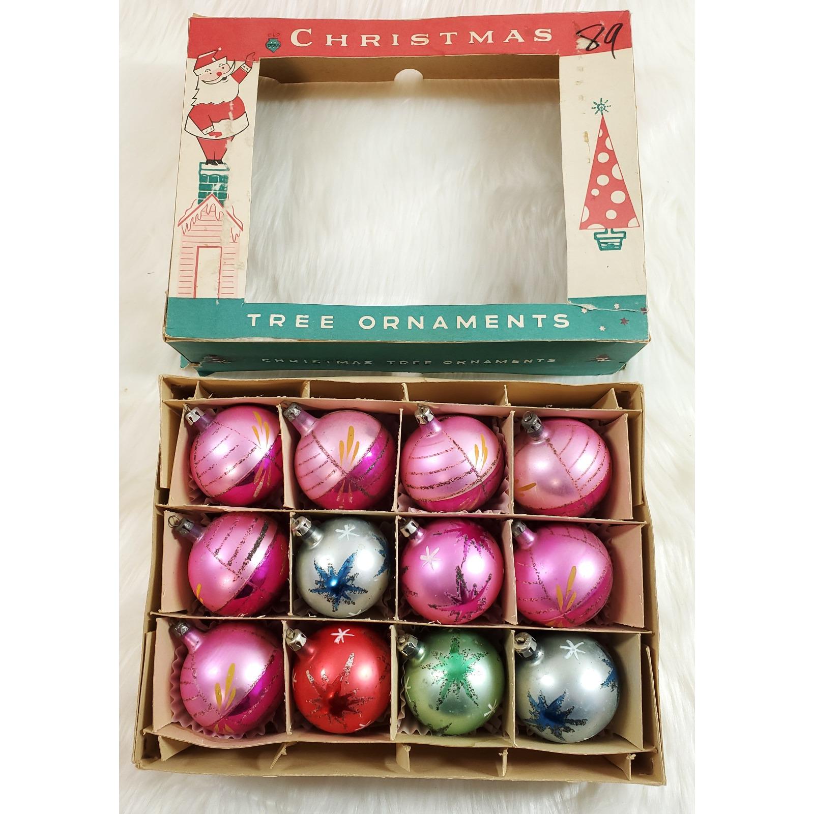 The set of twelve include a beautiful assortment of hand blown and painted ornaments. Overall in good condition with paint/mica loss from age. Please see all photos for exact condition.