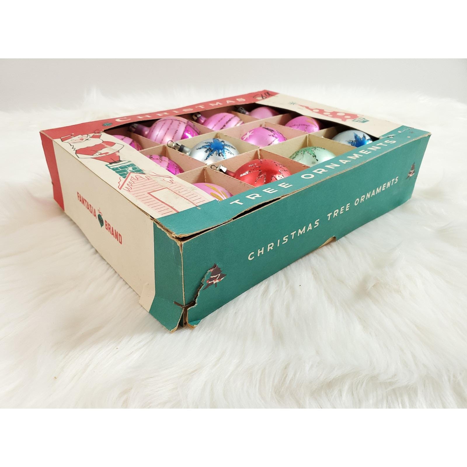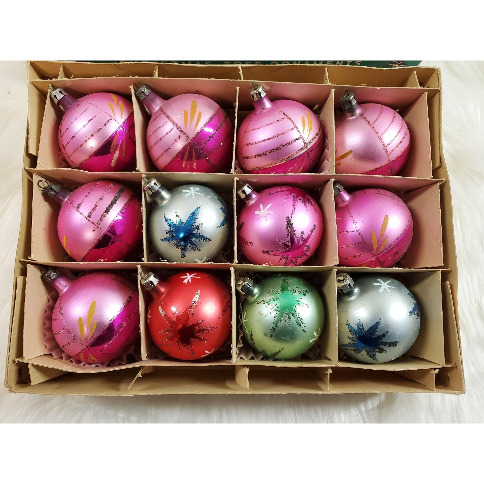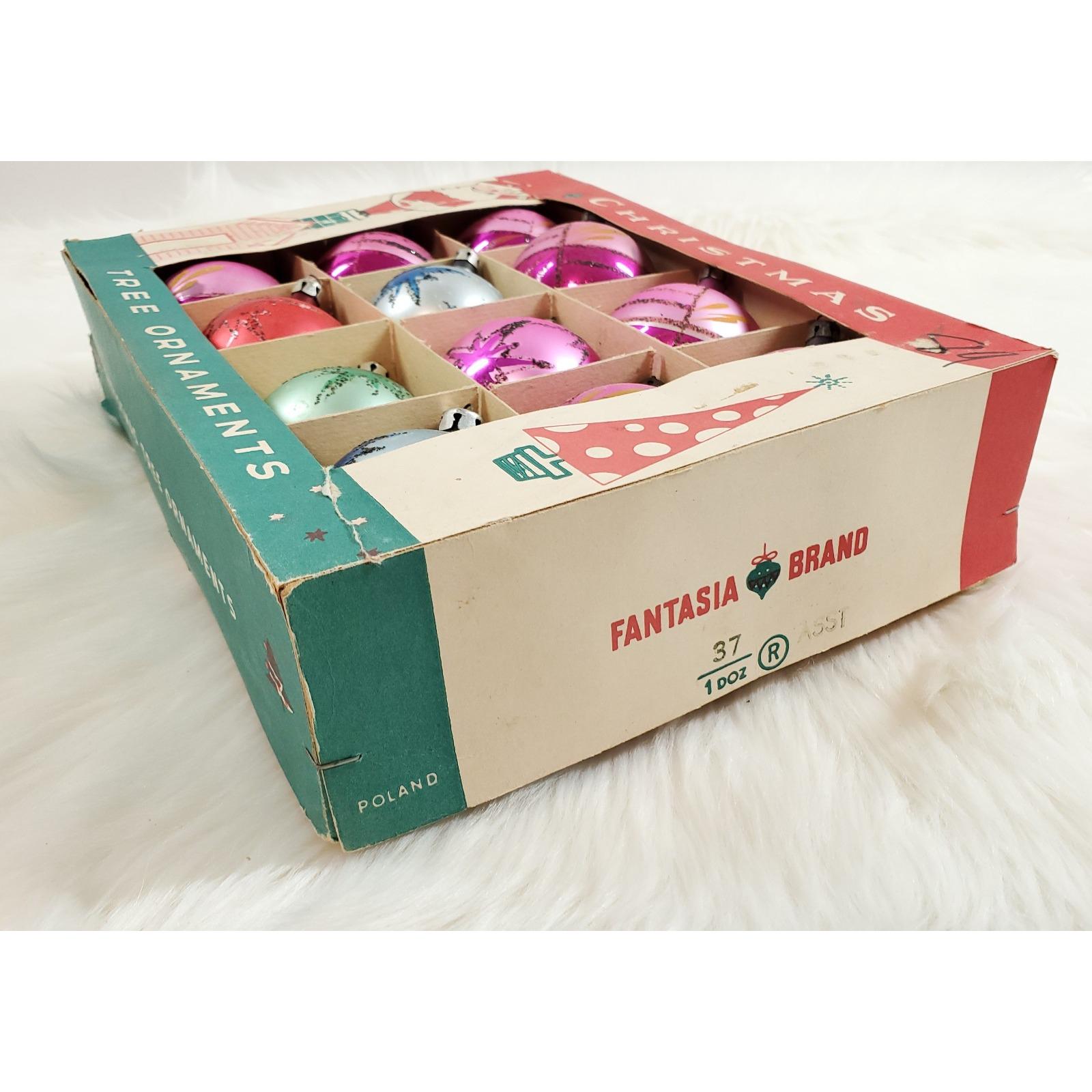 Vintage Poland Fantasia Mica Hand Painted Ball Glass Christmas Ornaments Box 12