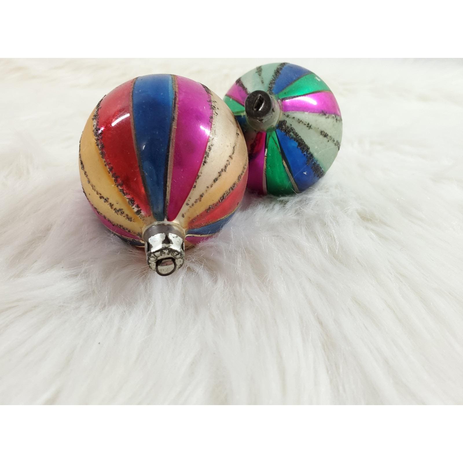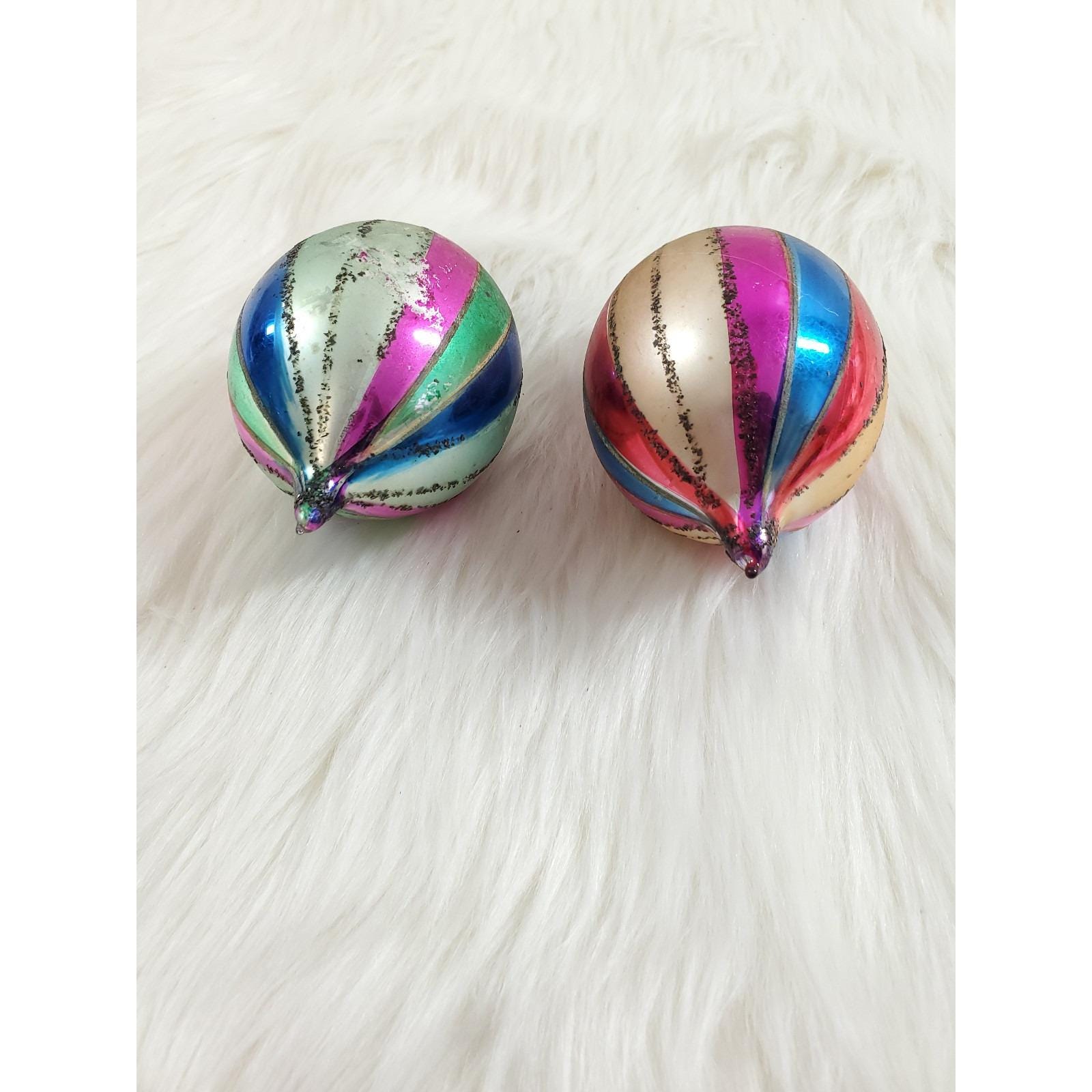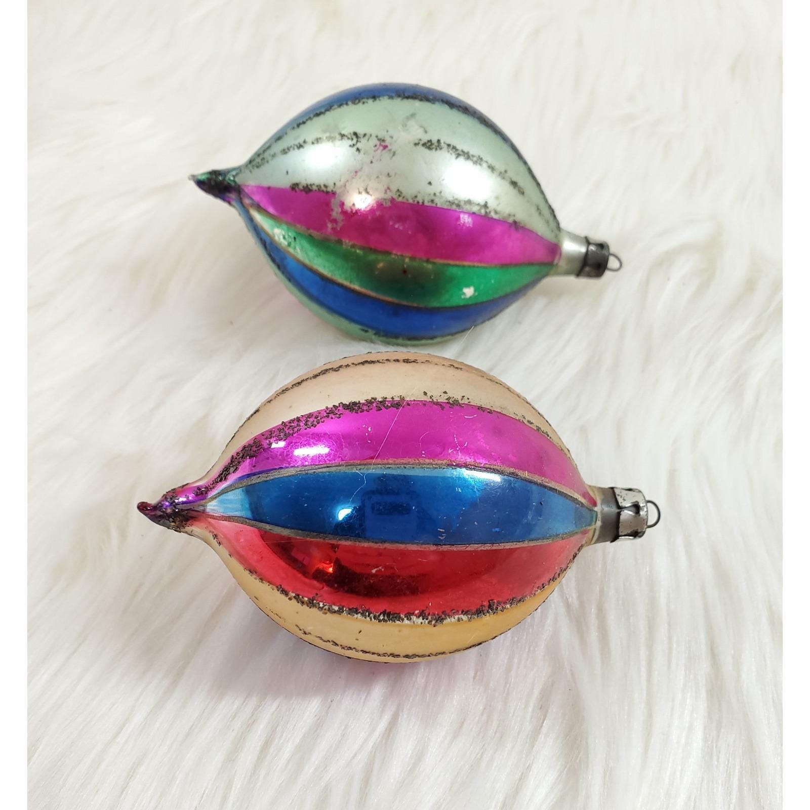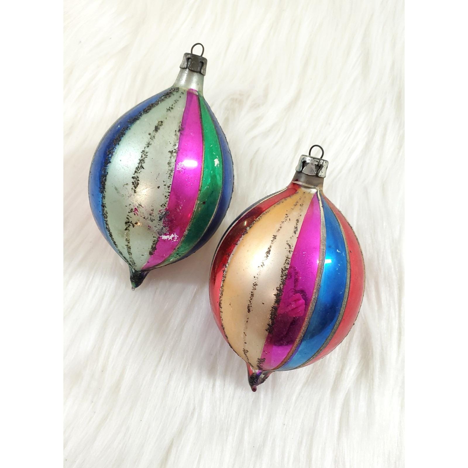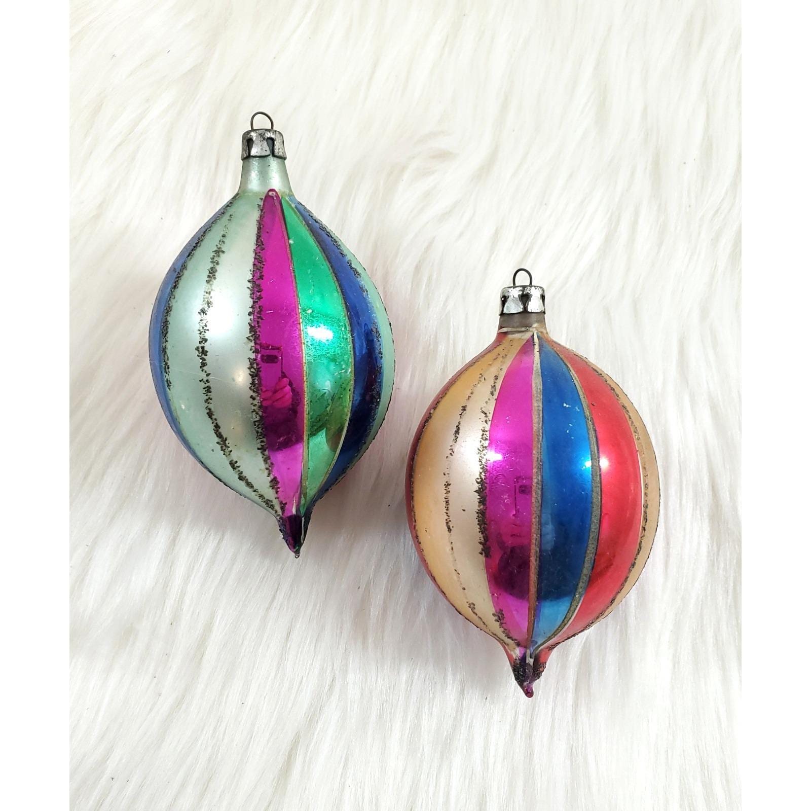 2 Vintage Poland Striped Harlequin Mica Teardrop Glass Christmas Ornaments