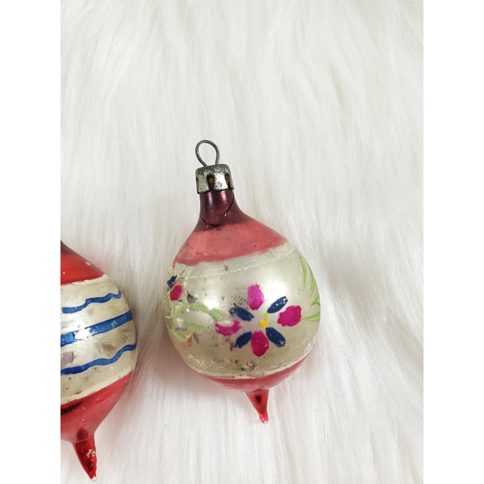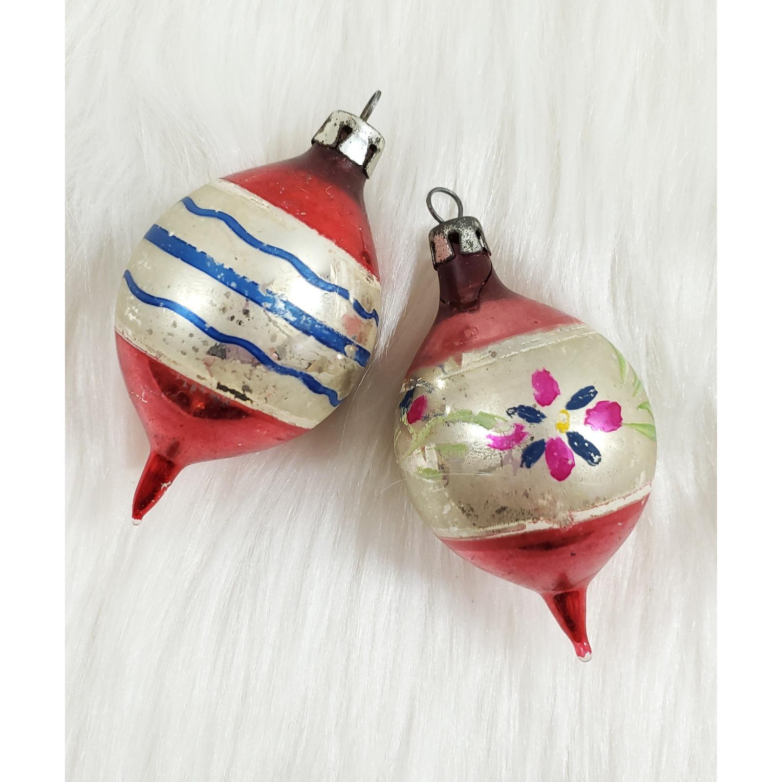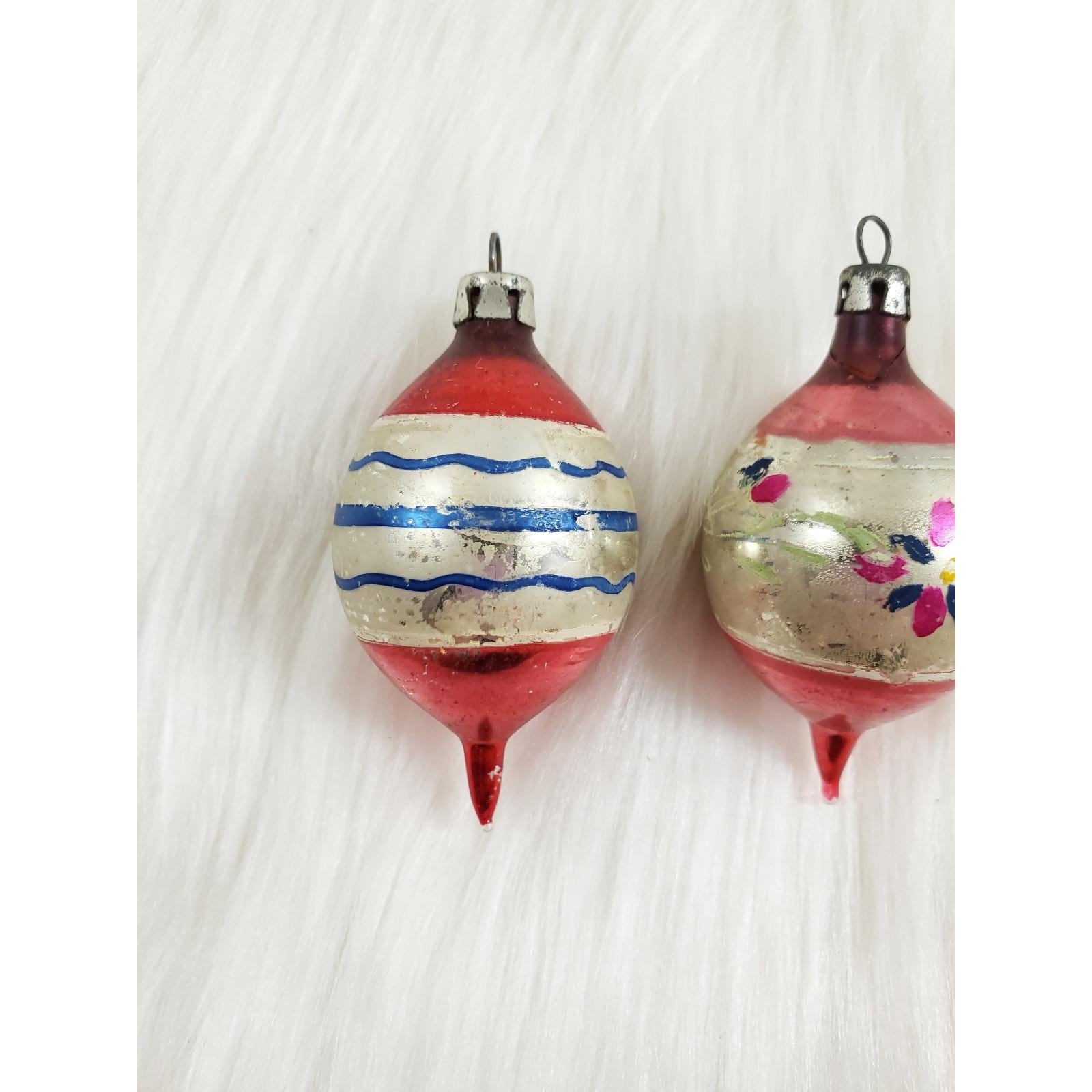 2 Vintage Poland Feather Tree Teardrop 2" Hand Painted Glass Christmas Ornaments