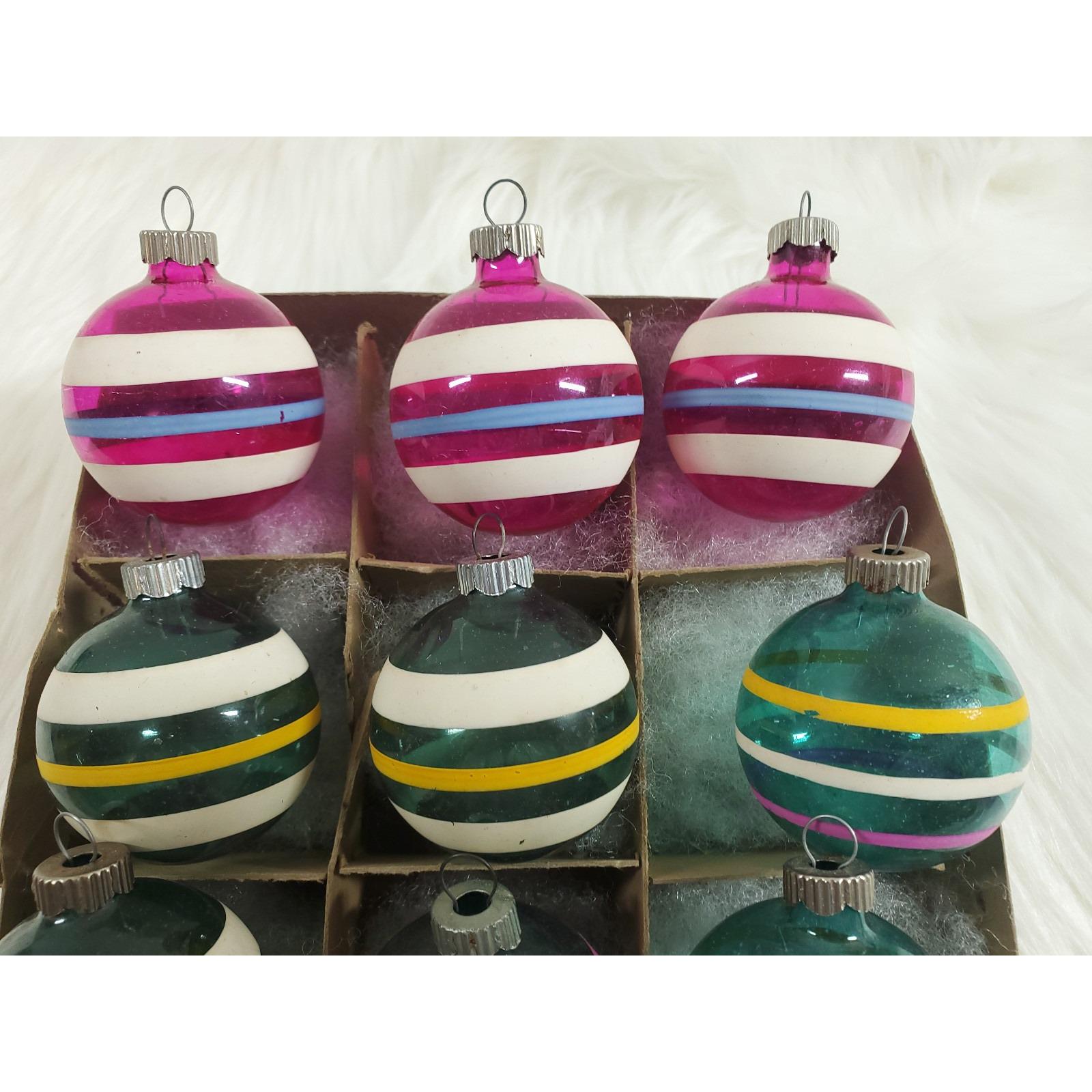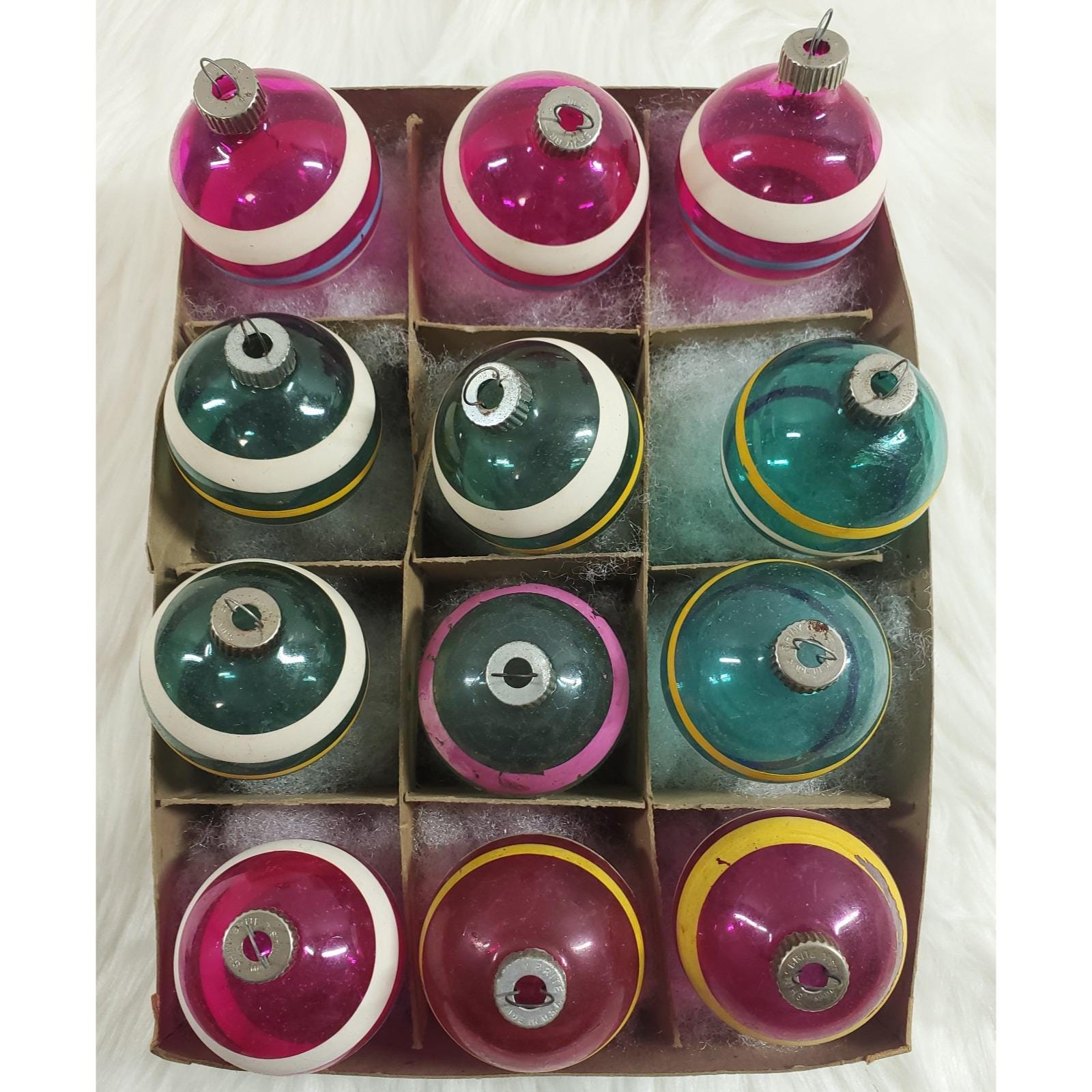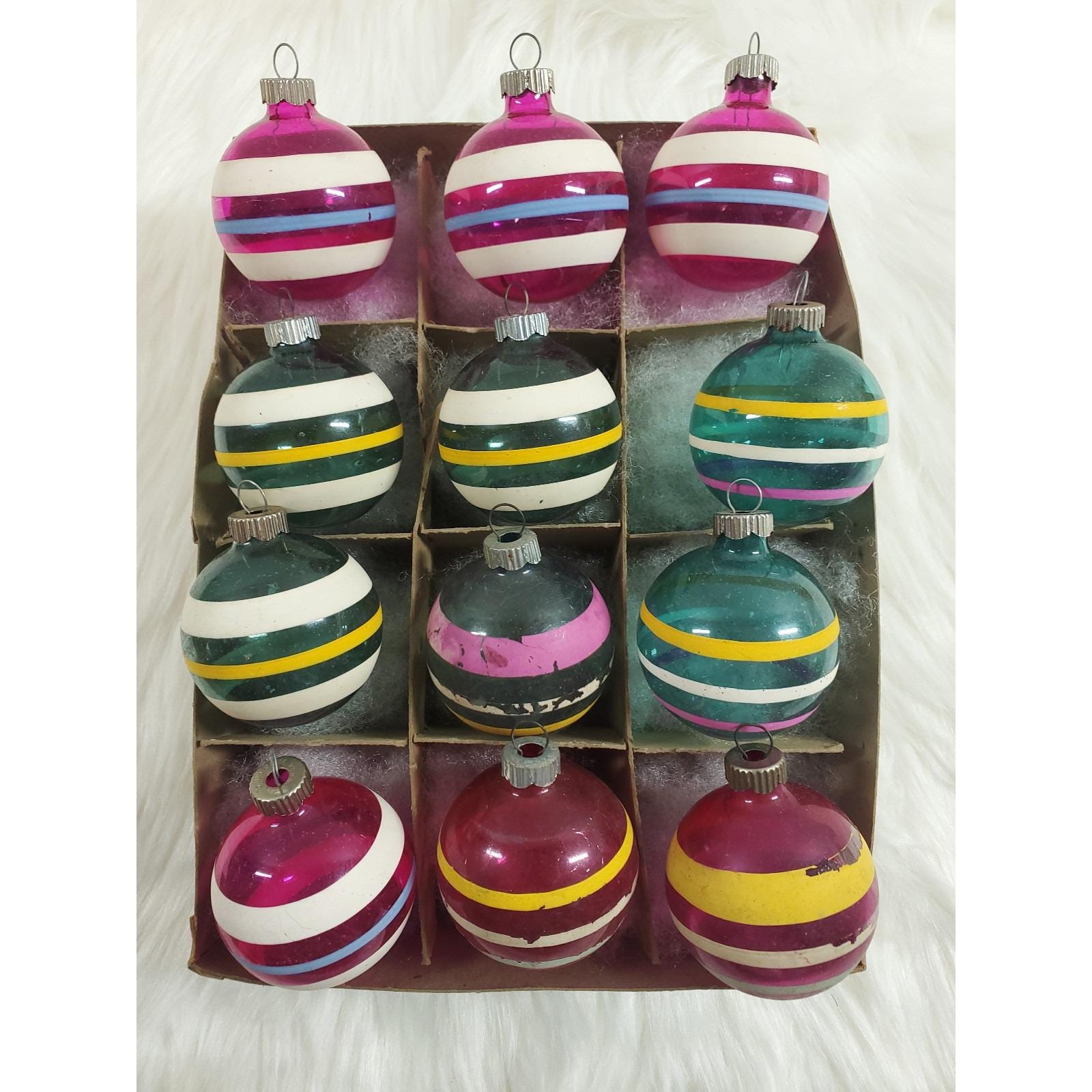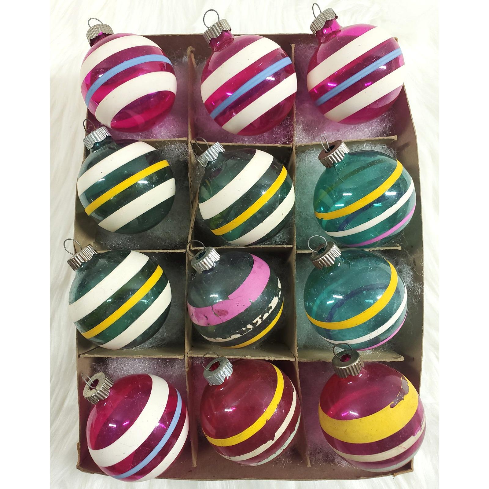 Vintage WWII Era Unsilvered Shiny Brite Stripe Glass Christmas Ornaments Box 12
