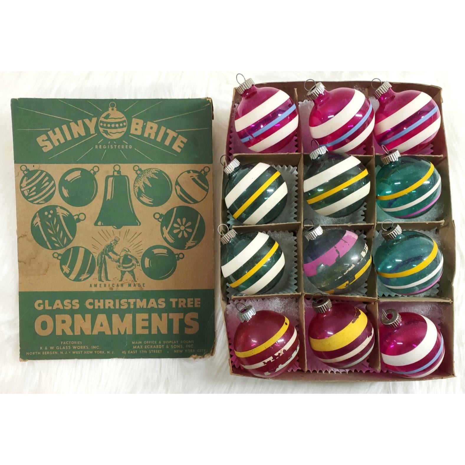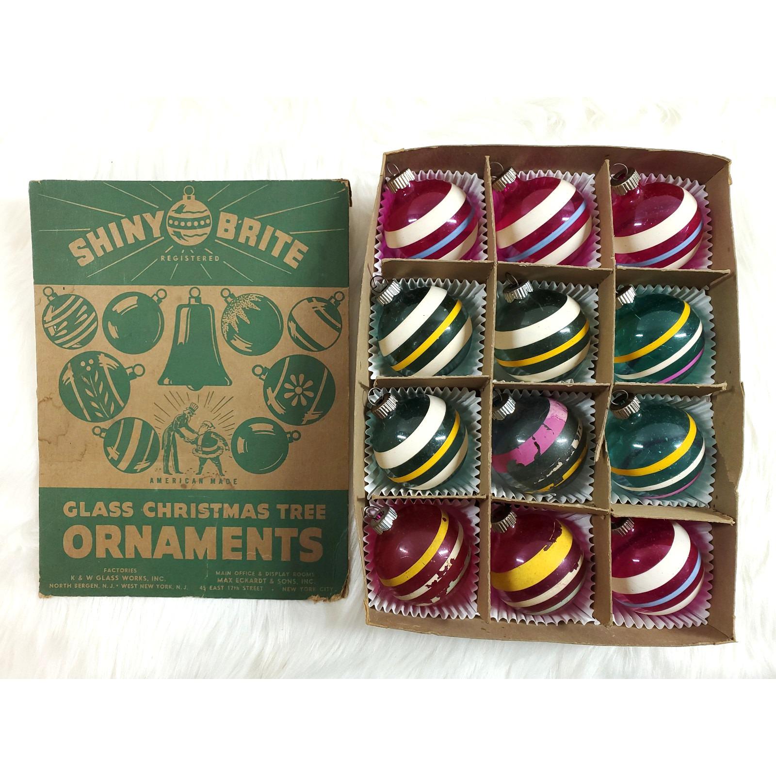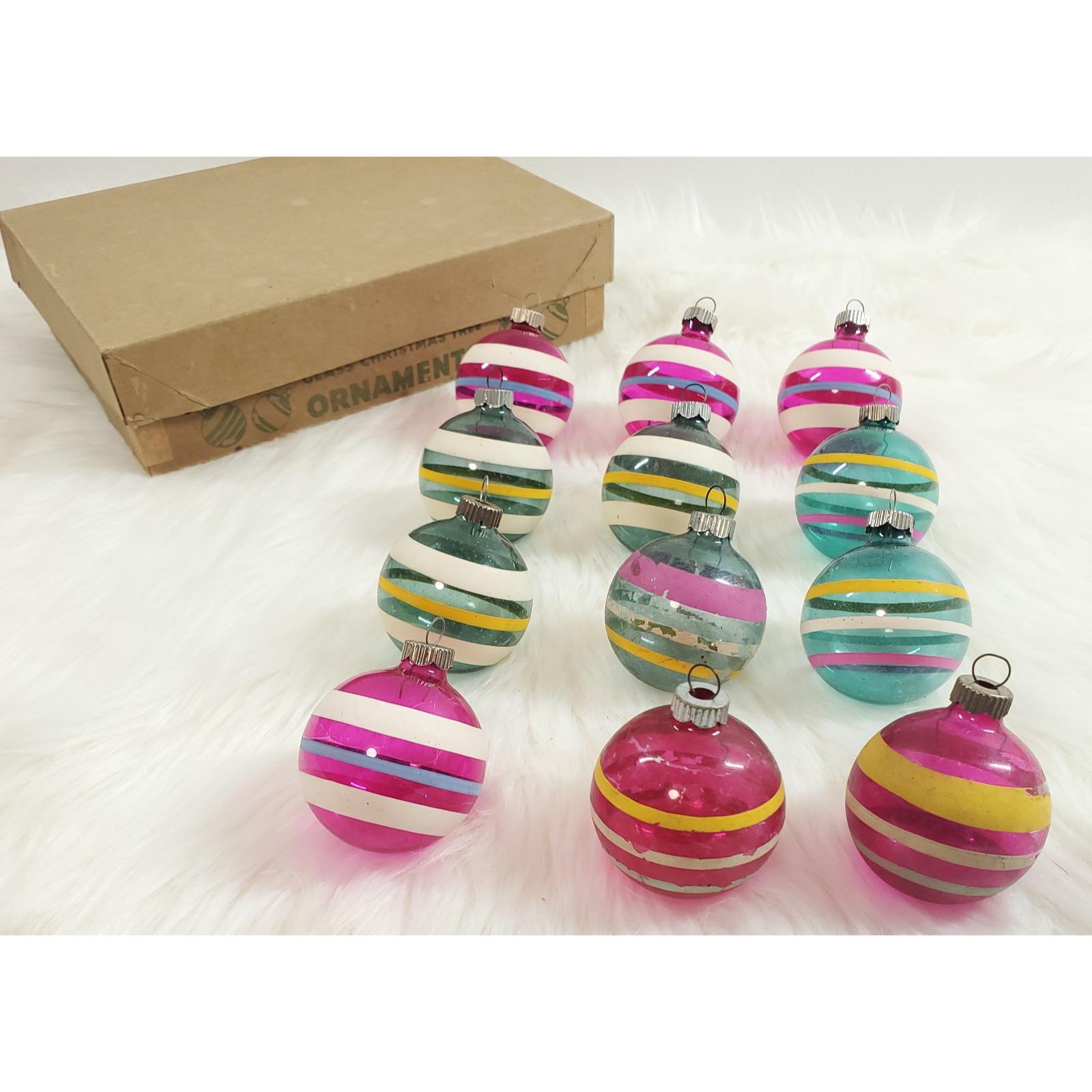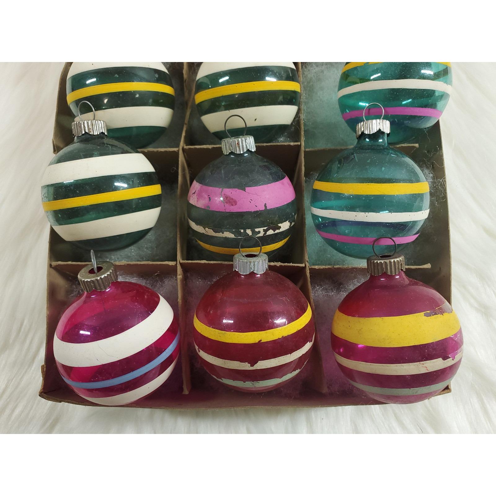 Vintage WWII Era Unsilvered Shiny Brite Stripe Glass Christmas Ornaments Box 12