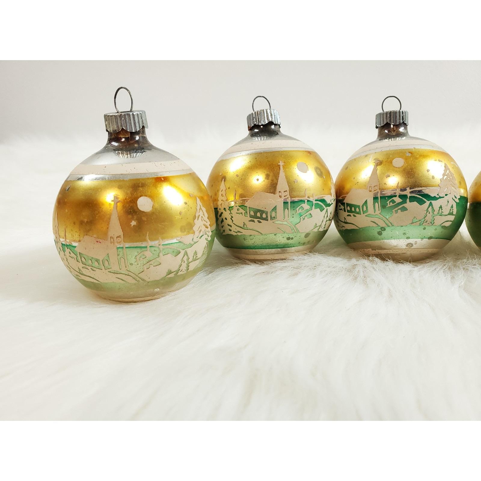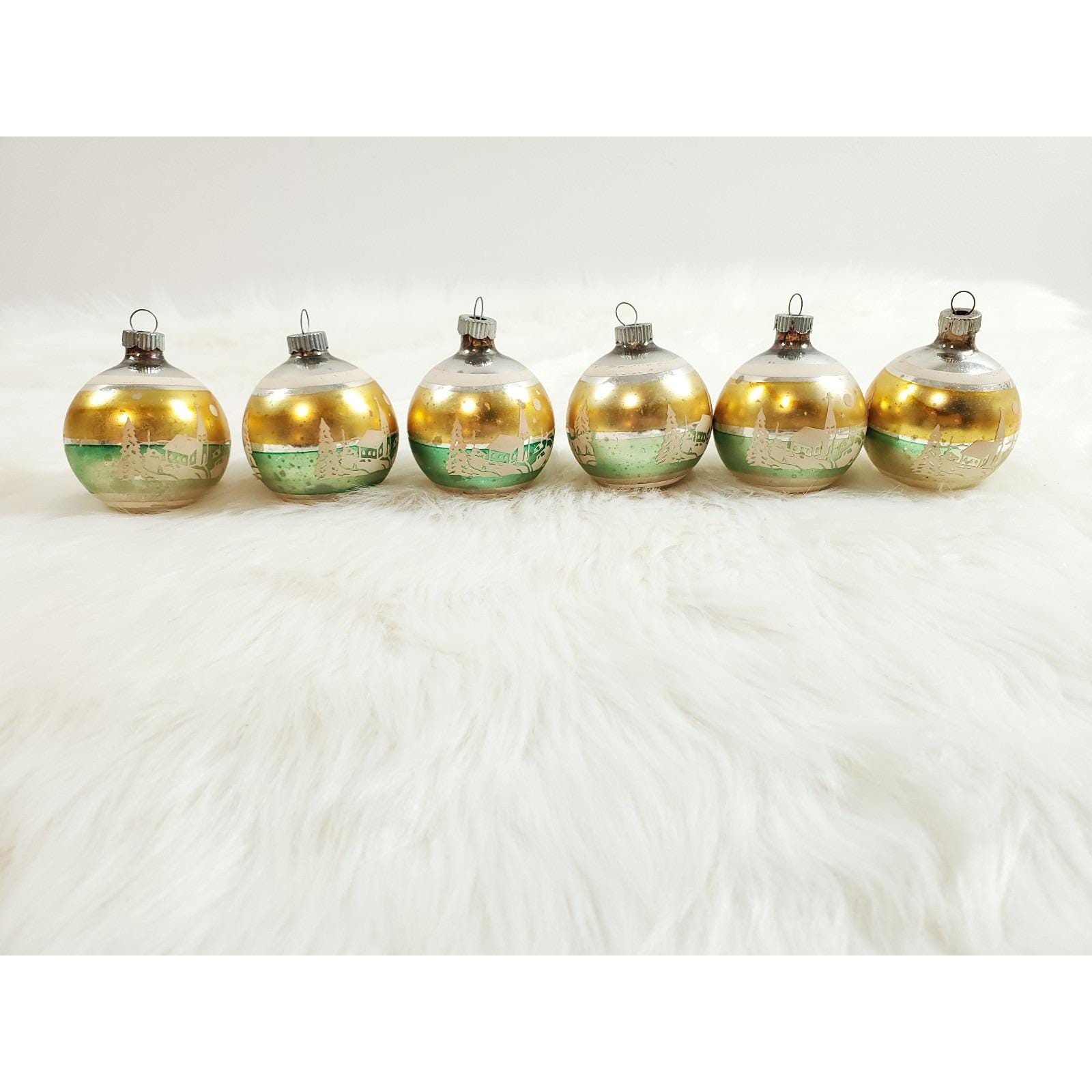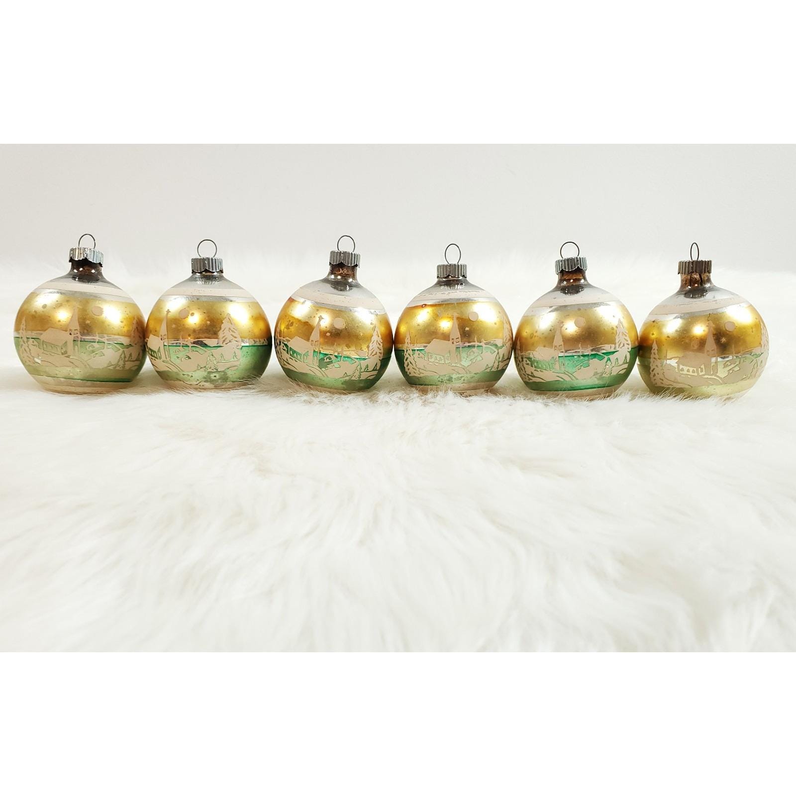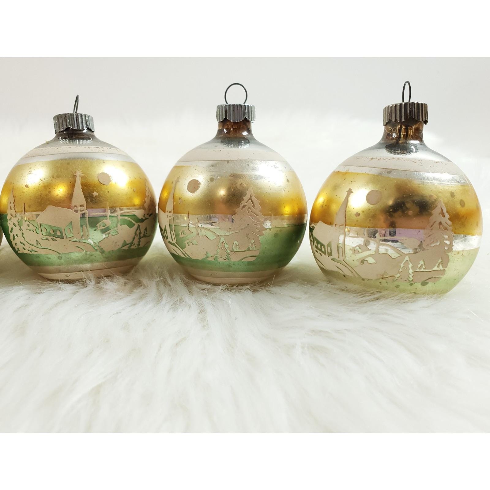 6 Vintage Shiny Brite Church Village Scene Gold Stripe Stencil Glass Ornaments