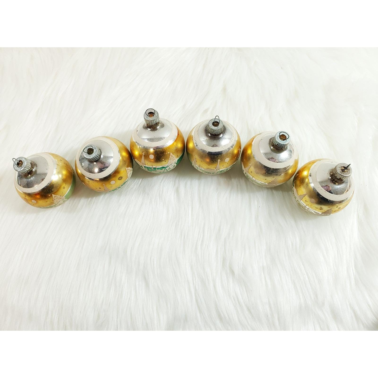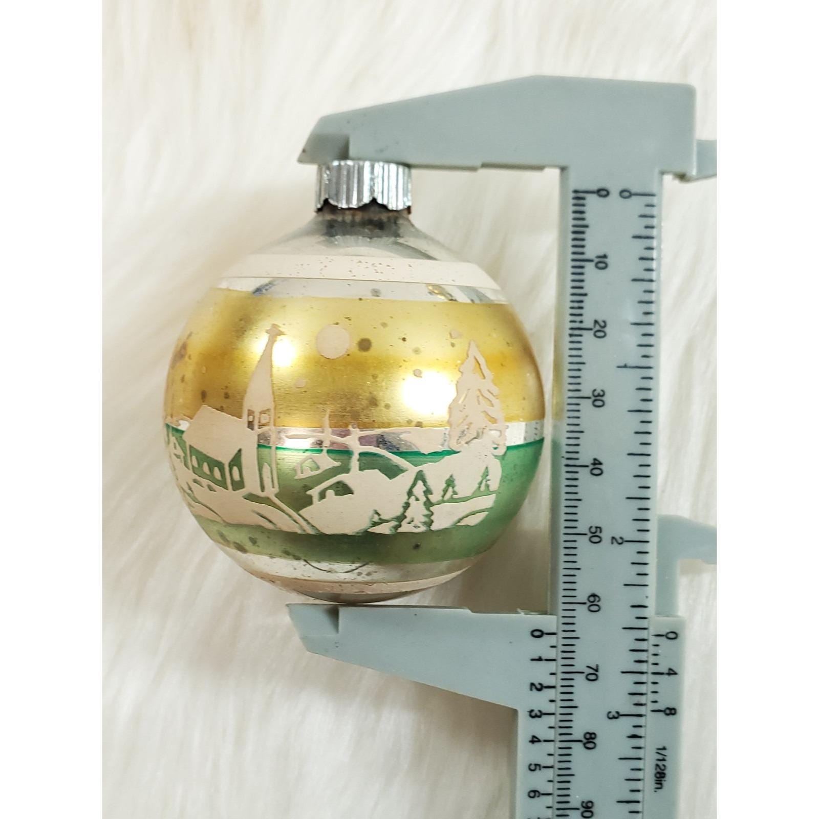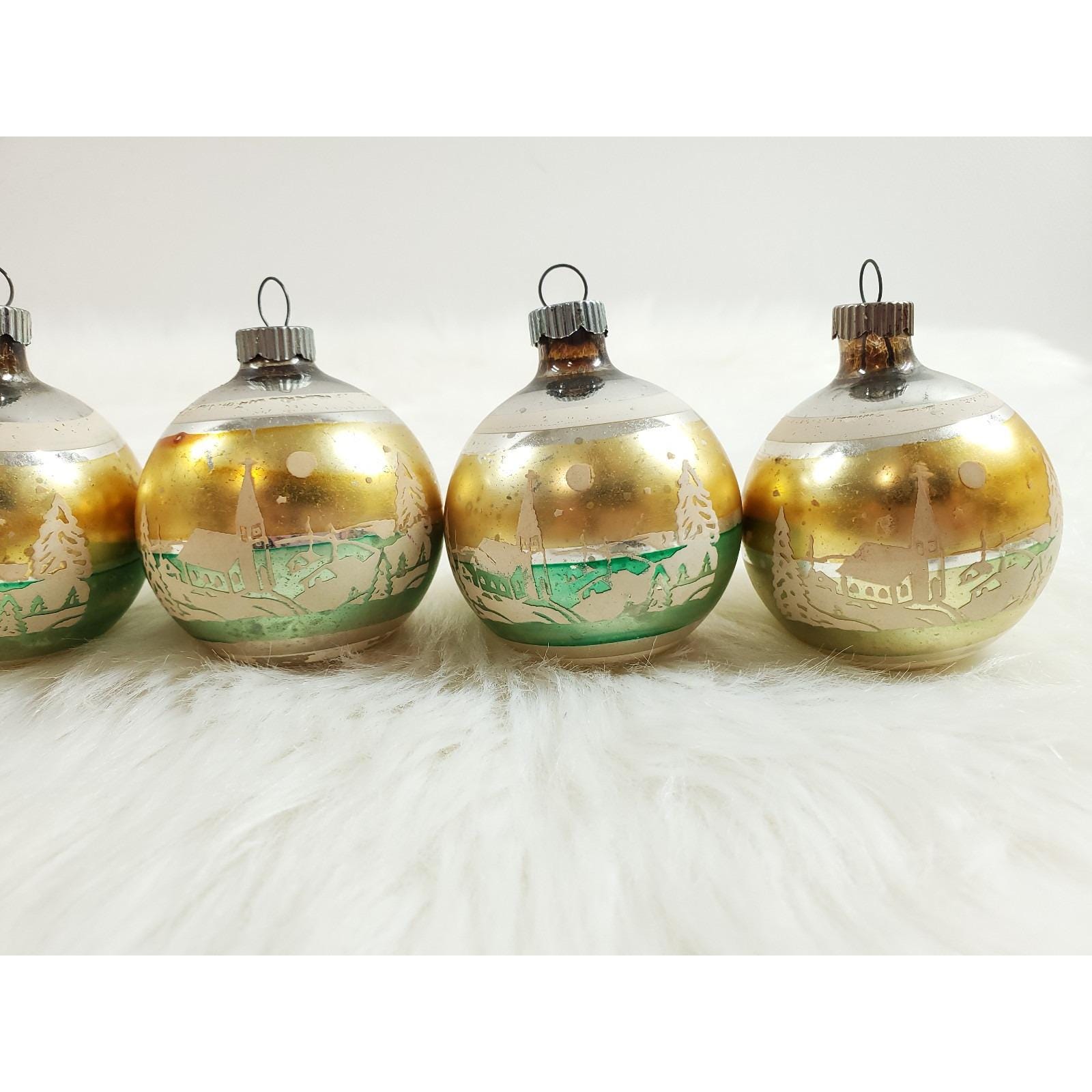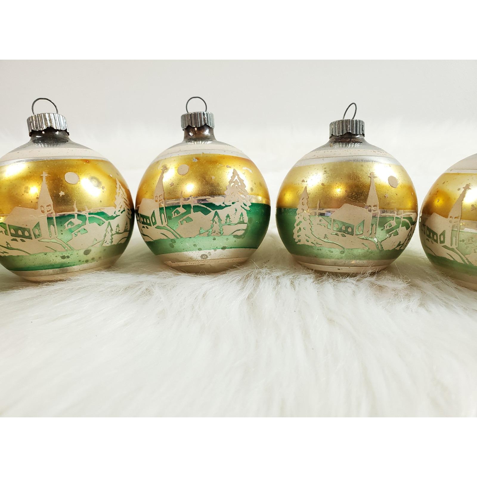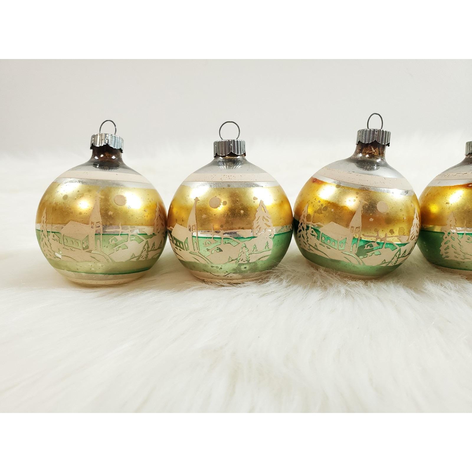 6 Vintage Shiny Brite Church Village Scene Gold Stripe Stencil Glass Ornaments