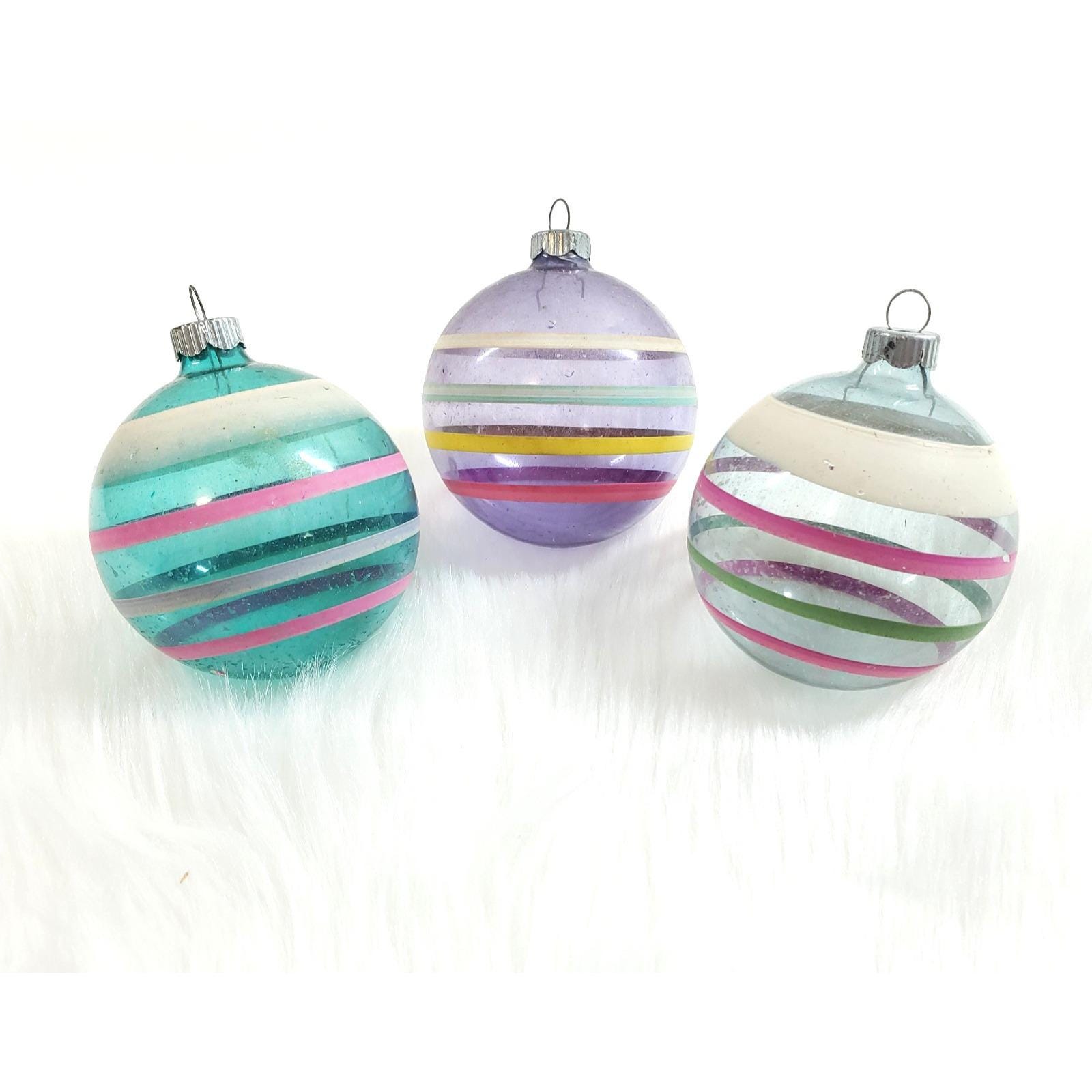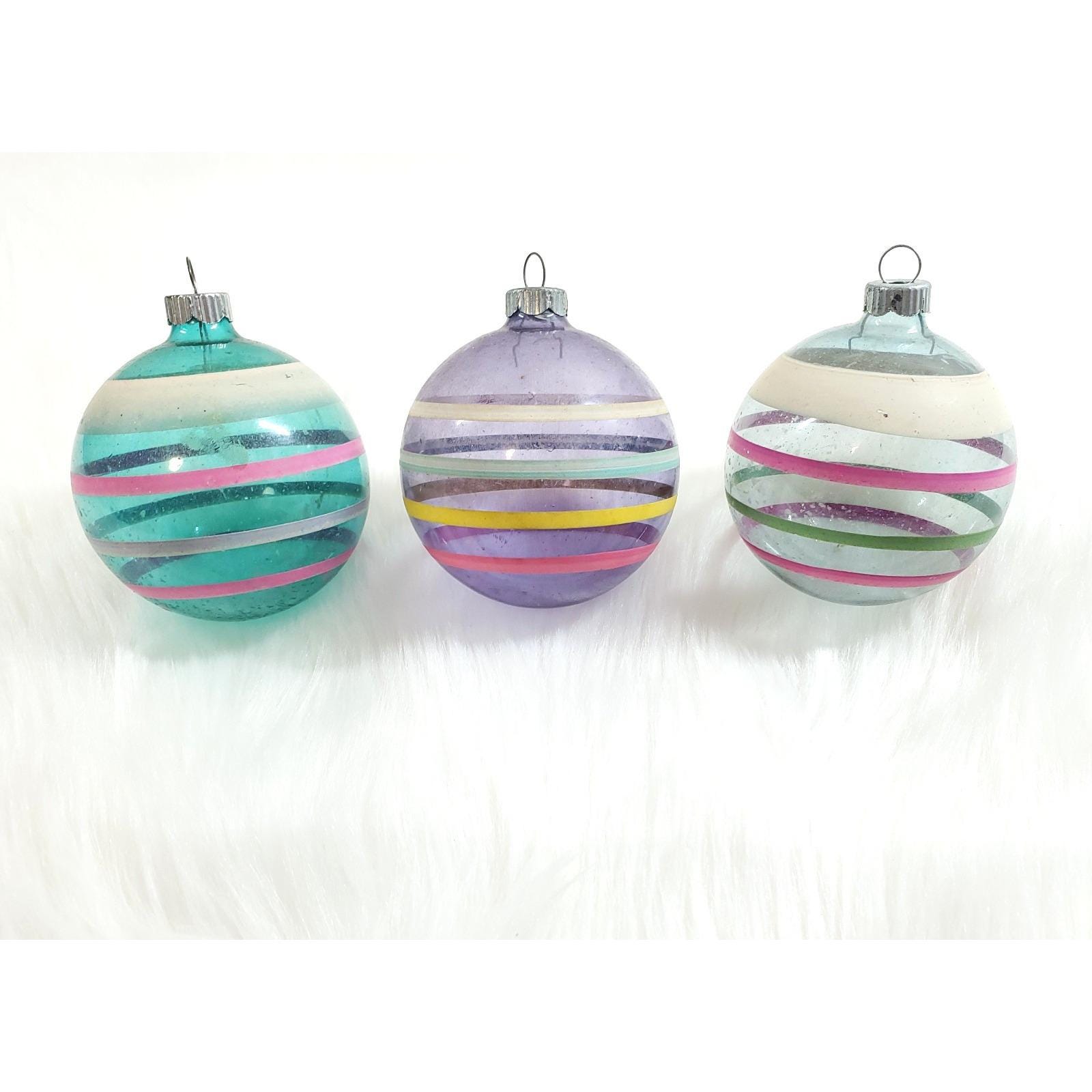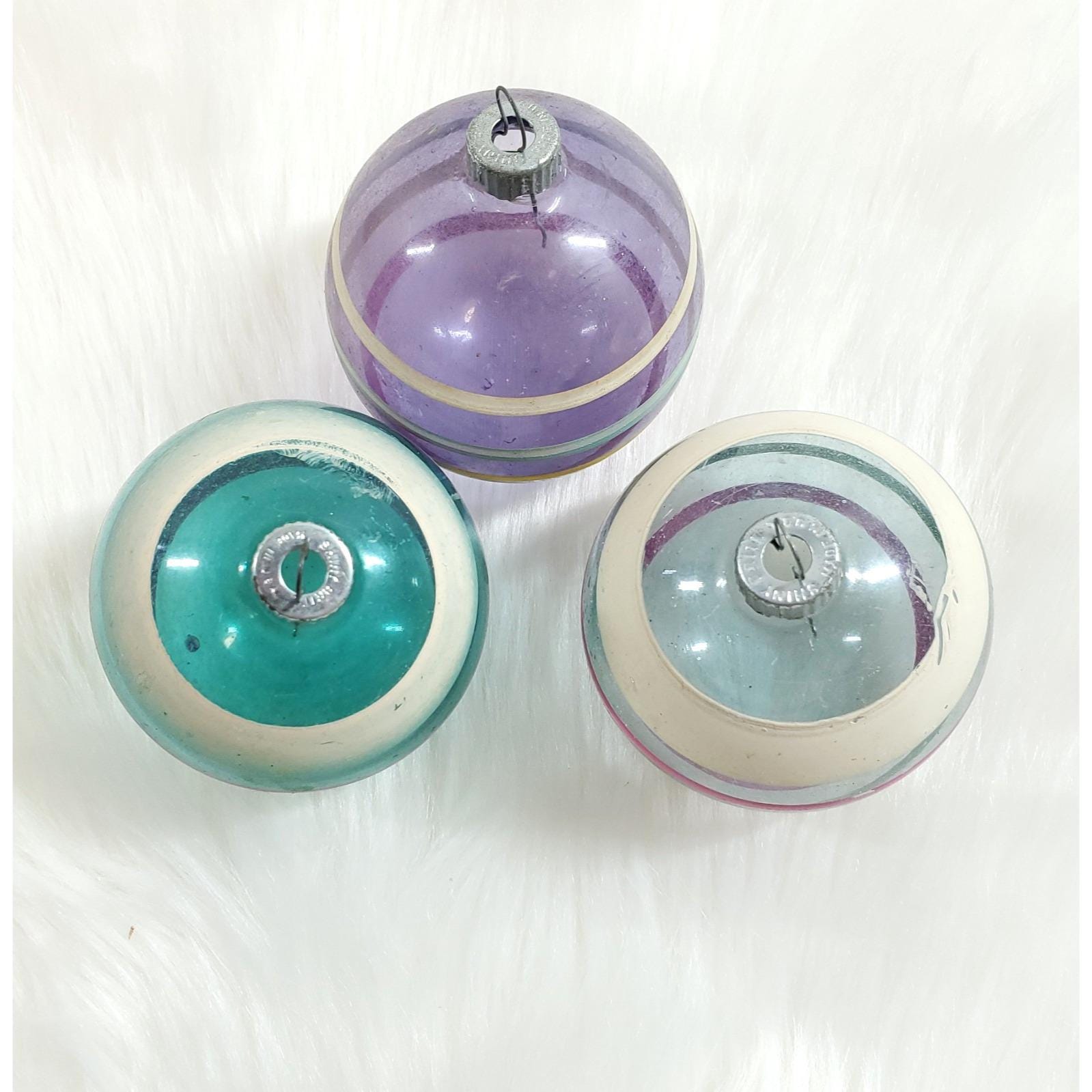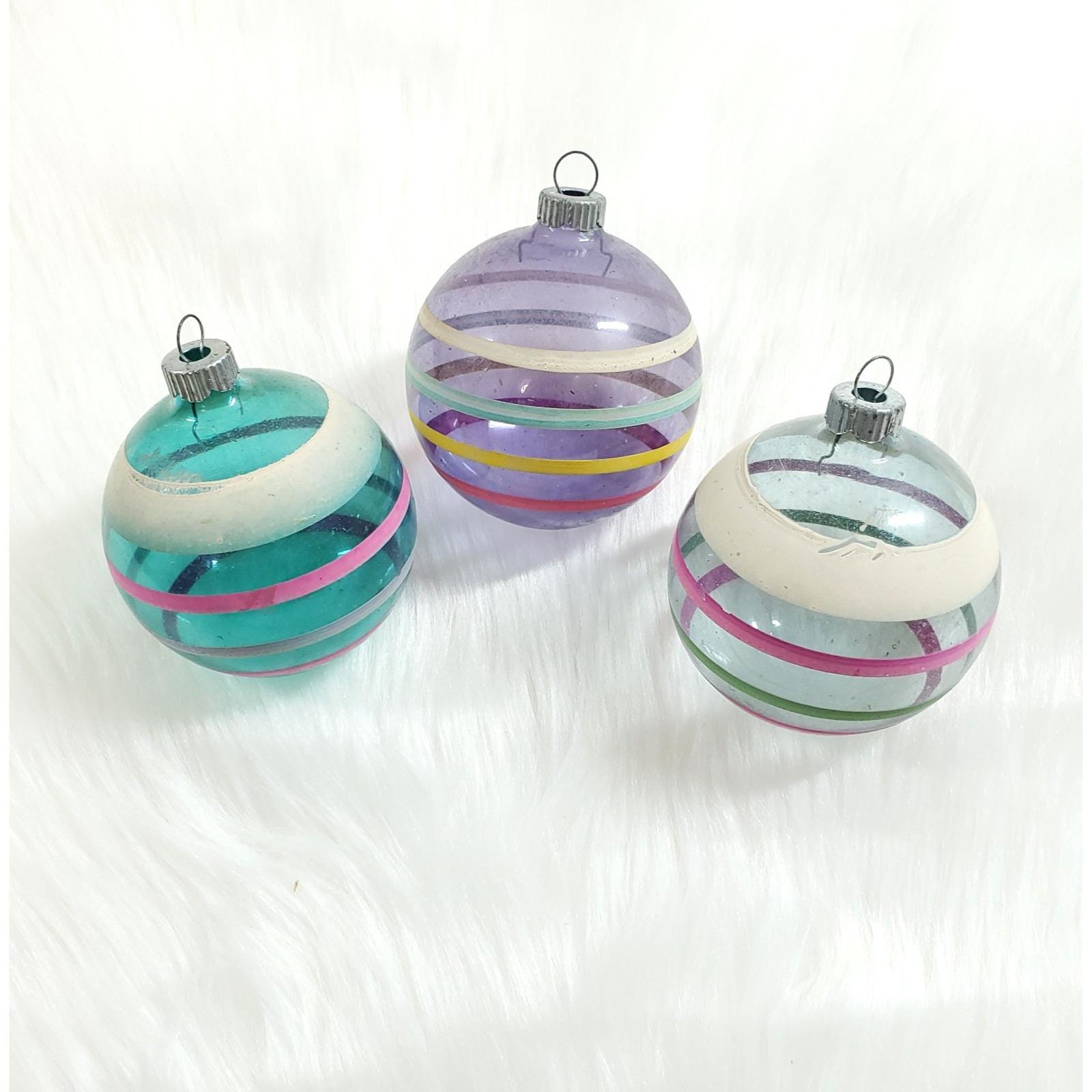 3 Vintage Shiny Brite WWII Unsilvered Stripe Glass Ball Christmas Ornaments