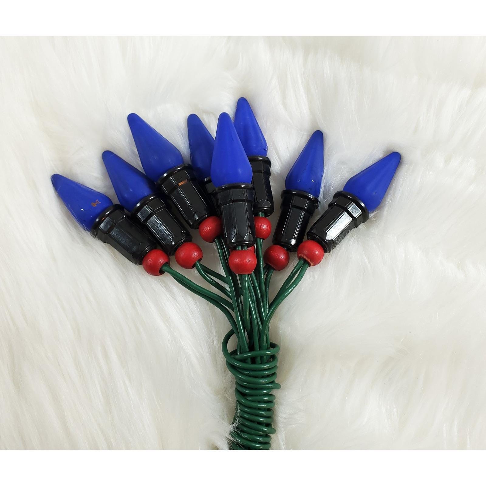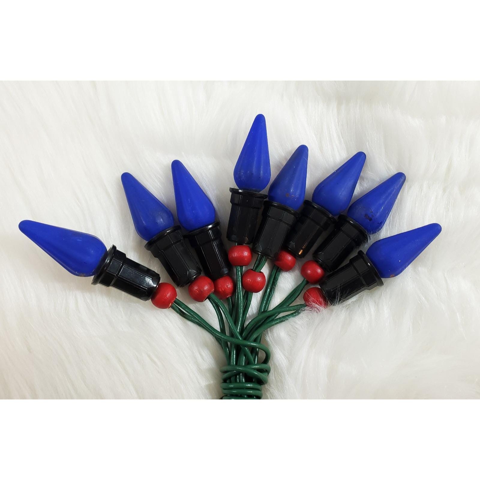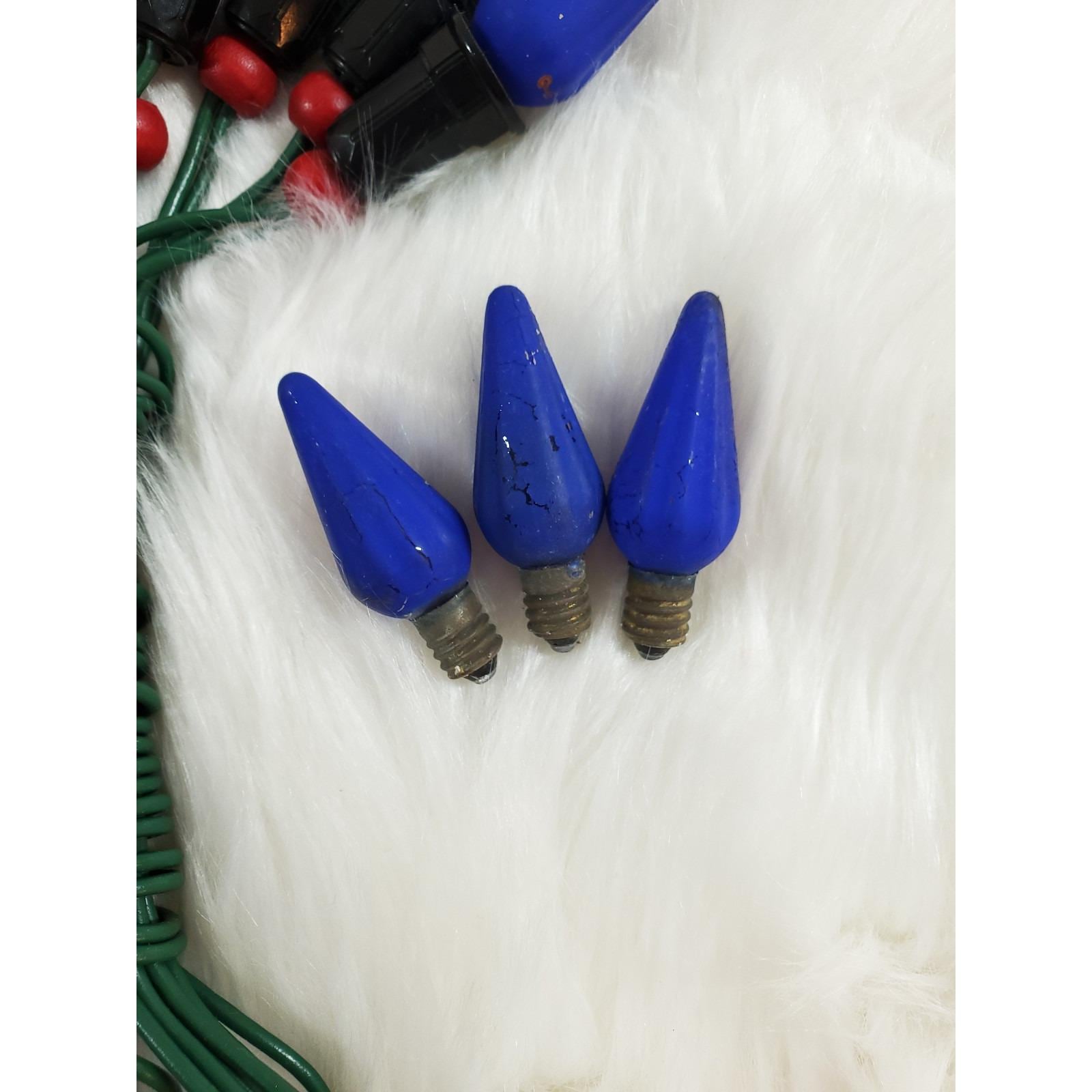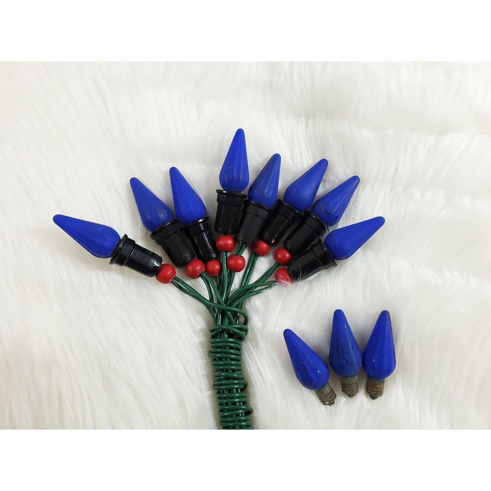Good working condition, (8) C6 Mazda bulb cobalt blue string lights with 3 extra spare bulbs (11 total)! All are tested and work well, with good paint intact. Cord and plug are also in good condition as shown. Please see all photos close up for exact details.
