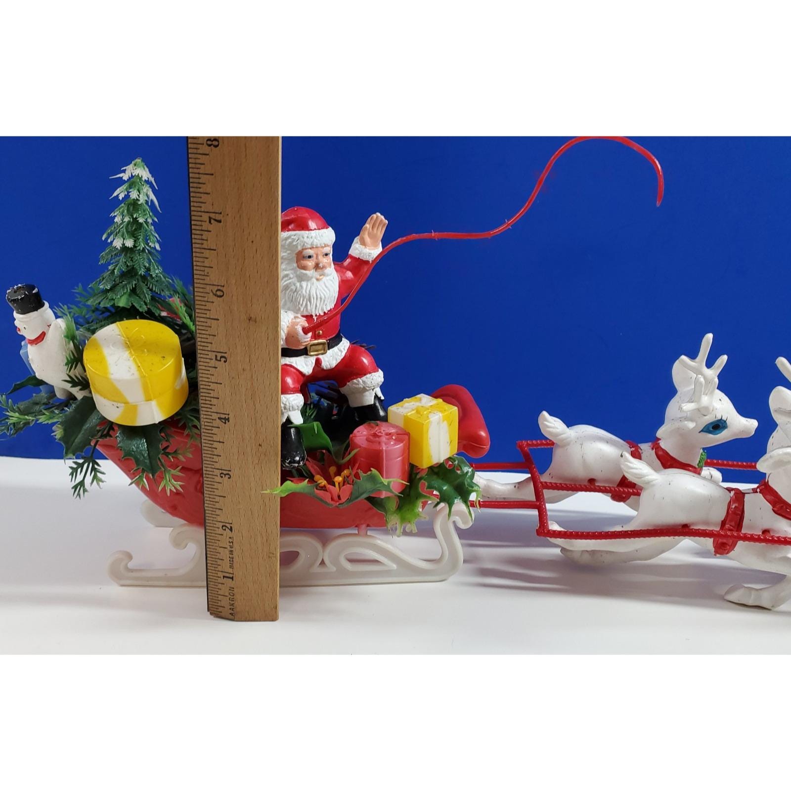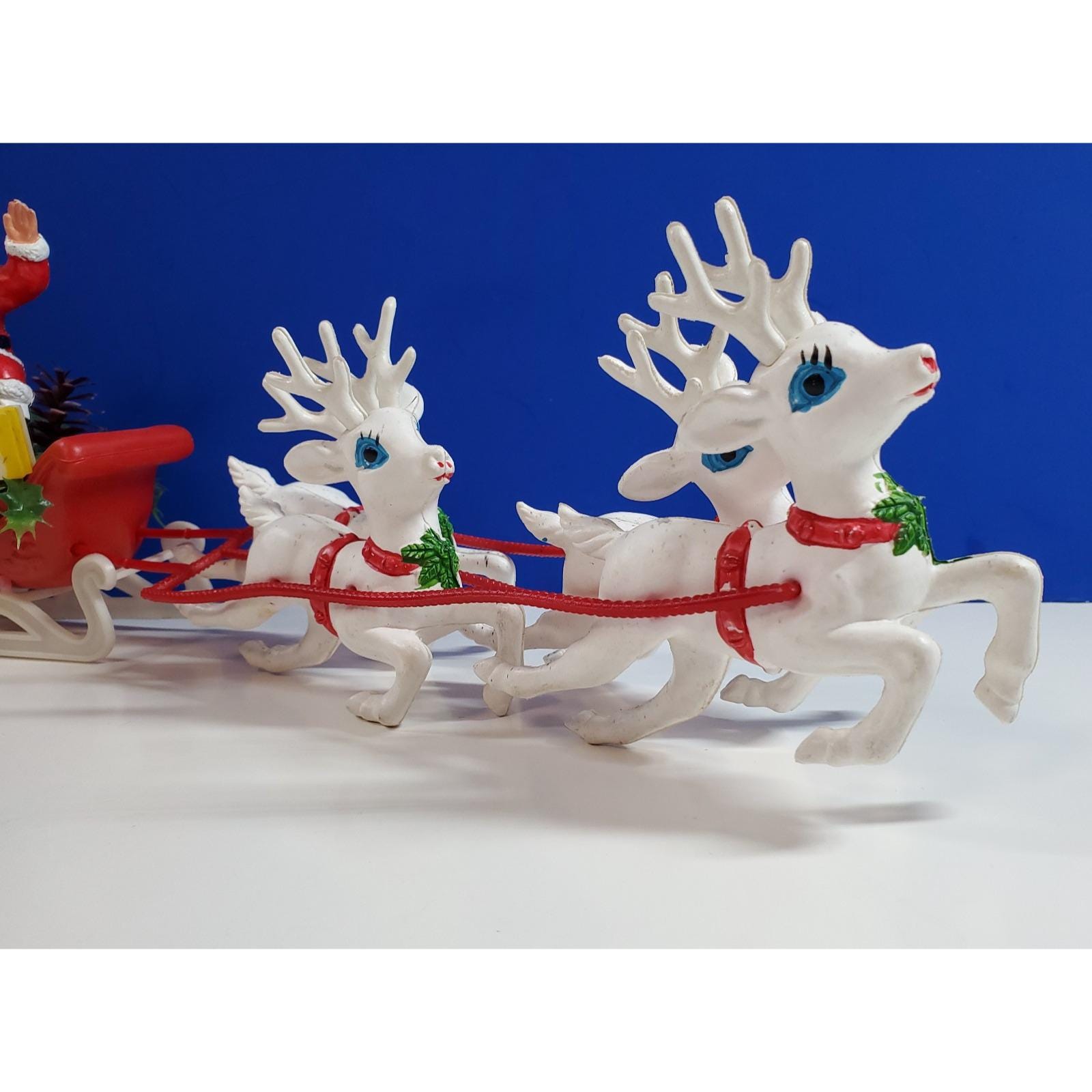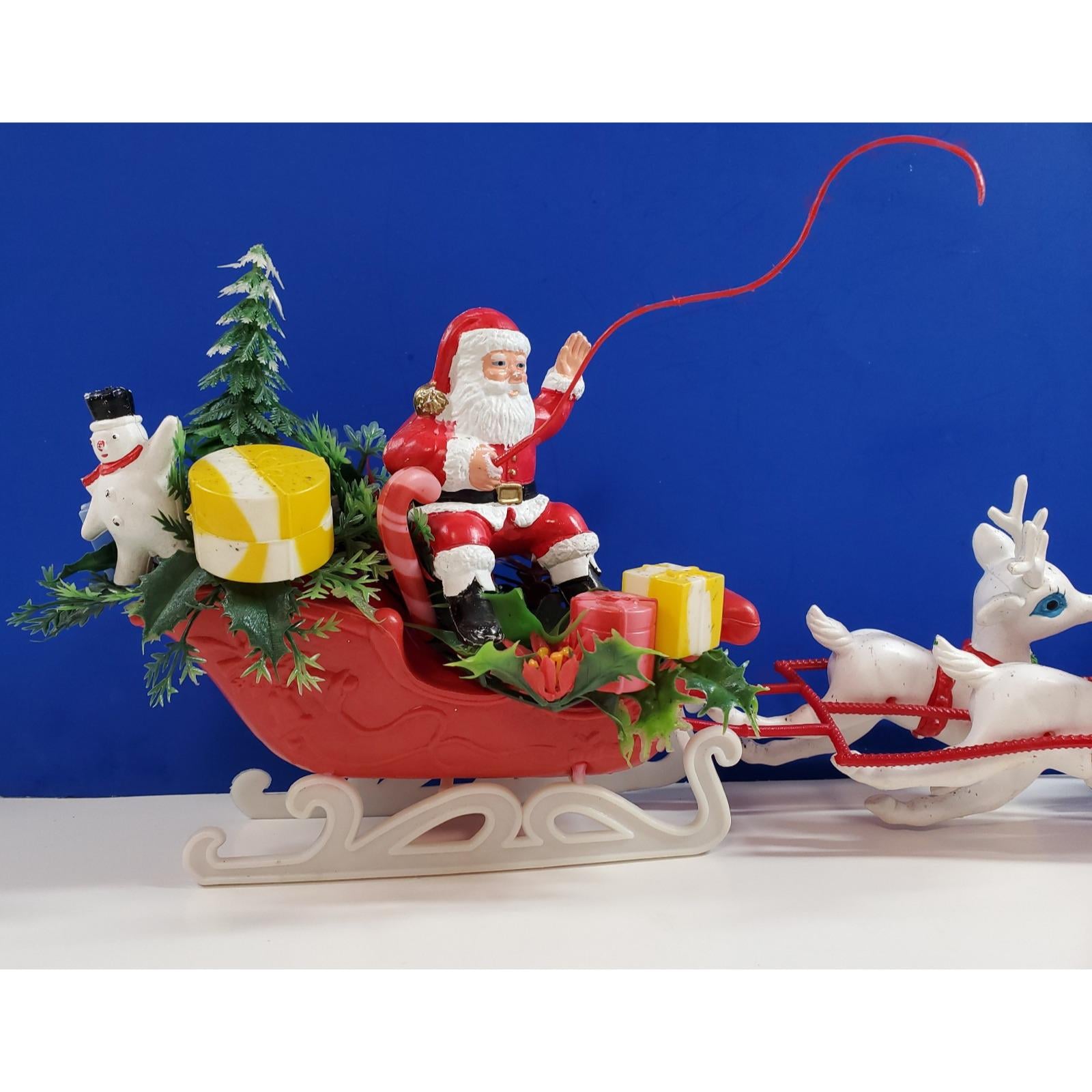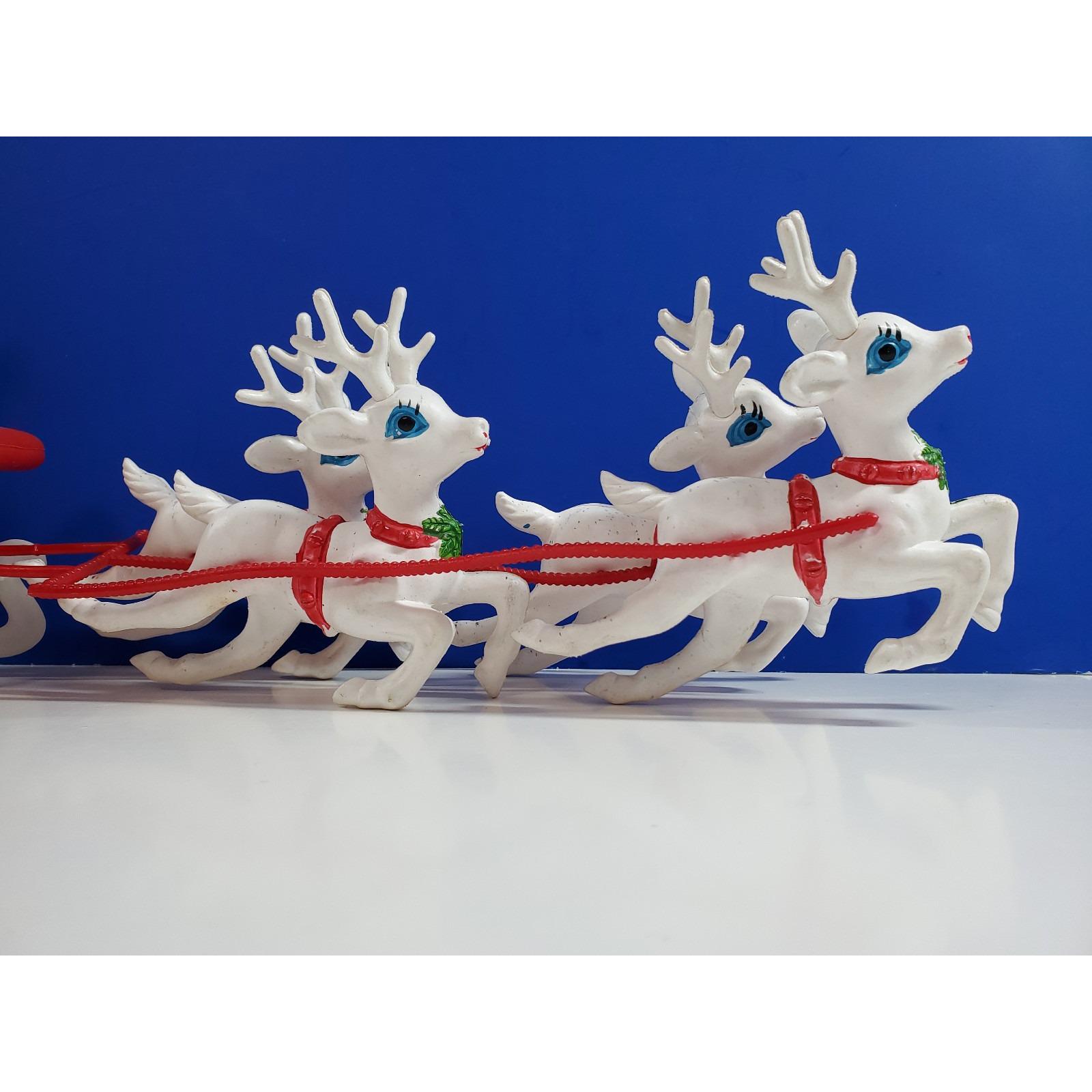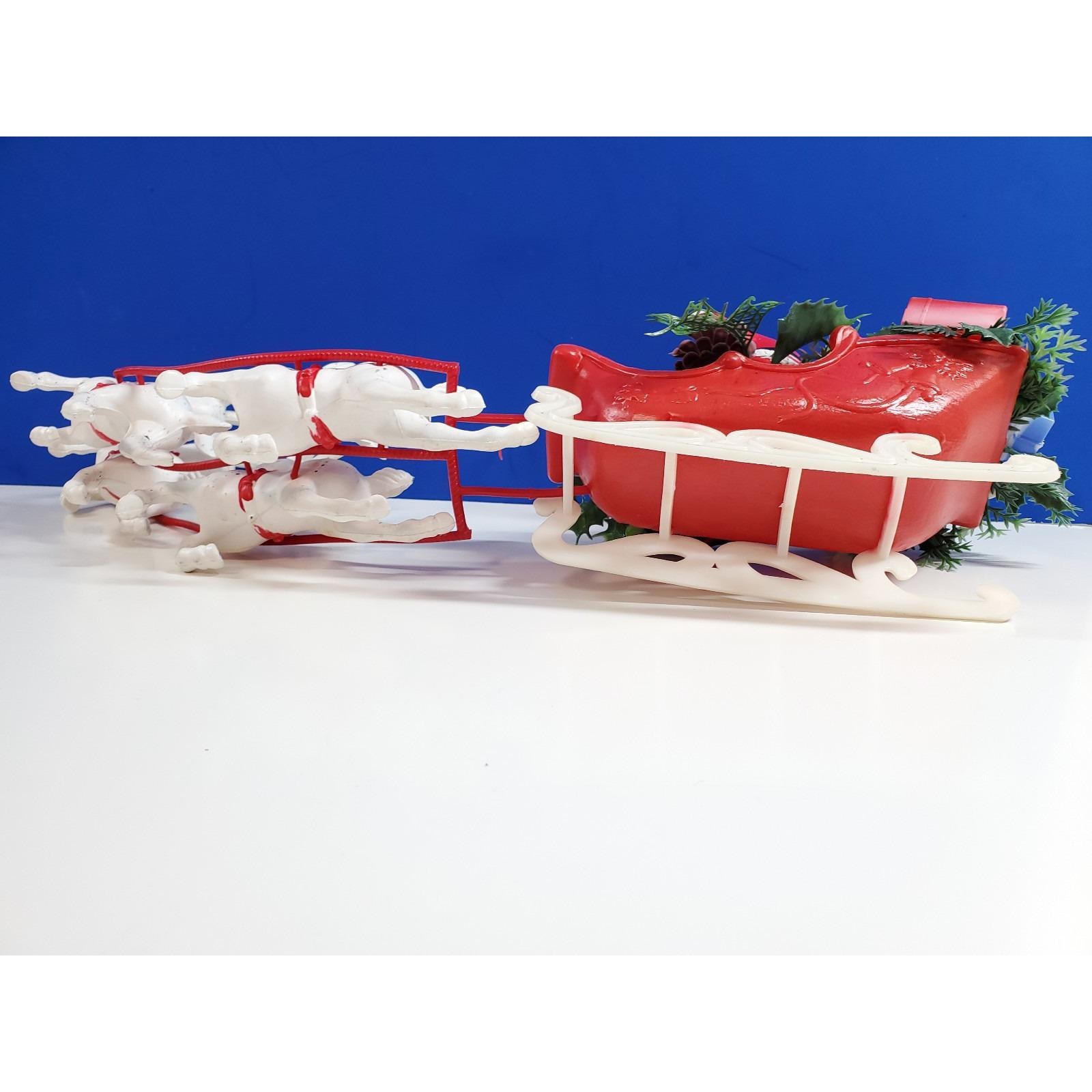 Vintage Christmas MCM Santa Sleigh and 4 Reindeer Blow Mold Plastic Tabletop 19”